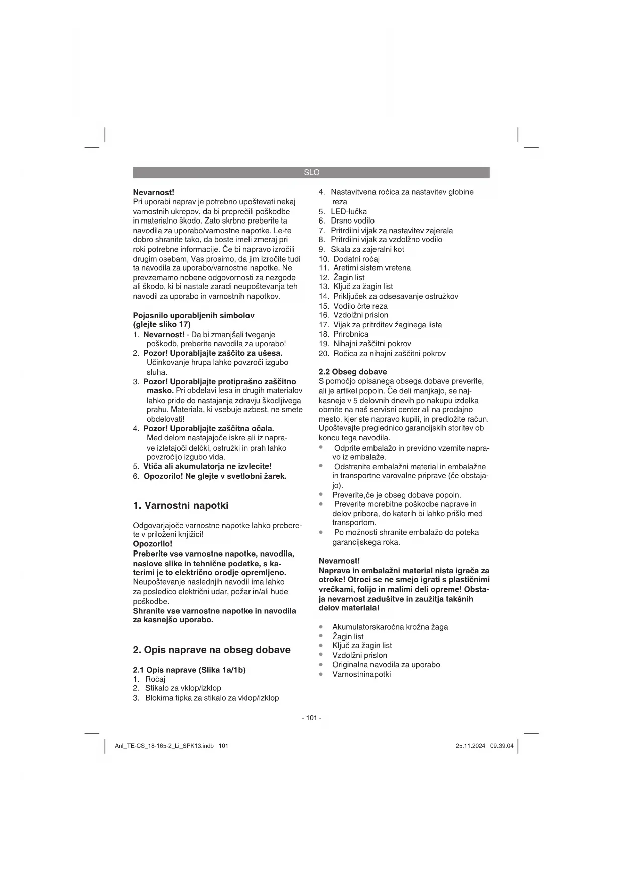 Napravo in pribor za napravo skladiščite na tem- nem, suhem in pred mrazom zaščitenem in za otroke nedostopnem mestu. Optimalna skladiščna temperature je med 10 in 40 ˚C. Električno orodje shranjujte v originalni embalaži. Odlaganje Poskrbite za okolju prijazno recikliranje električnih orodij, akumulatorskih baterij, pribora in embalaž. Električnih orodij in akumulatorskih/običajnih baterij ne smete odvreči med gospodinjske od- padke! Zgolj za države Evropske unije: V skladu z Direktivo 2012/19/EU o odpadni električni in elektronski opremi in njenim pre- nosom v nacionalno zakonodajo se morajo odslužena električna orodja zbirati ločeno in od- straniti na okolju prijazen način. Prav tako se morajo v skladu z Direktivo 2006/66/ ES pokvarjene ali odslužene akumulatorske bate- rije in baterije za enkratno uporabo zbirati ločeno in odstraniti na okolju prijazen način. Odpadna električna in elektronska oprema, ki ni zavržena strokovno, lahko negativno vpliva na okolje in zdravje ljudi, saj morda vsebuje nevarne snovi. Ponatis ali kakršnokoli razmnoževanje dokumen- tacije in spremljajočih papirjev o proizvodu, tudi po izvlečkih, je dovoljeno samo z izrecnim soglas- jem Einhell Germany AG. Pridržana pravica do tehničnih sprememb Anl_TE-CS_18-165-2_Li_SPK13.indb 106Anl_TE-CS_18-165-2_Li_SPK13.indb 106 25.11.2024 09:39:0525.11.2024 09:39:05SLO