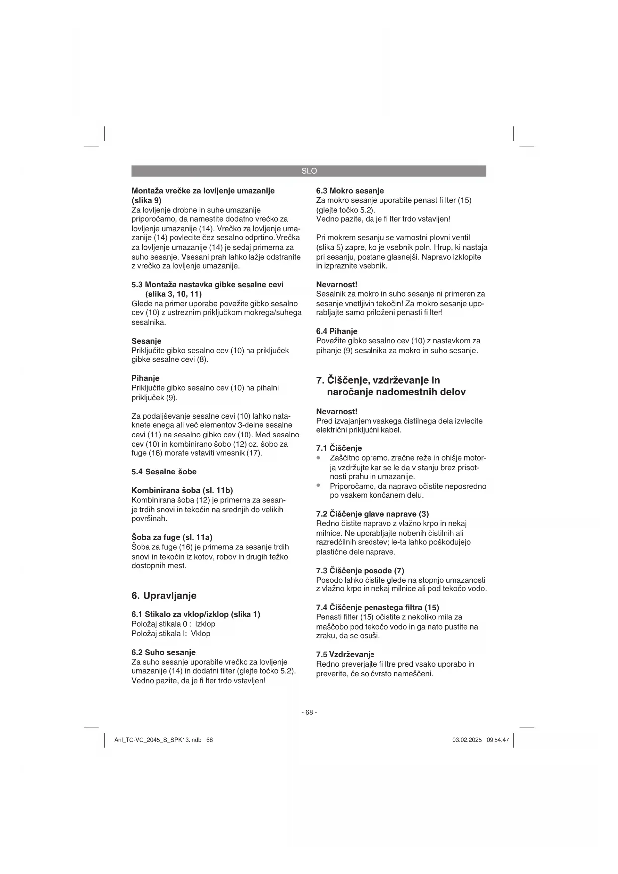 Za mokro sesanje uporabite penast fi lter (15) (glejte točko 5.2). Vedno pazite, da je fi lter trdo vstavljen! Pri mokrem sesanju se varnostni plovni ventil (slika 5) zapre, ko je vsebnik poln. Hrup, ki nastaja pri sesanju, postane glasnejši. Napravo izklopite in izpraznite vsebnik. Nevarnost! Sesalnik za mokro in suho sesanje ni primeren za sesanje vnetljivih tekočin! Za mokro sesanje upo- rabljajte samo priloženi penasti fi lter!