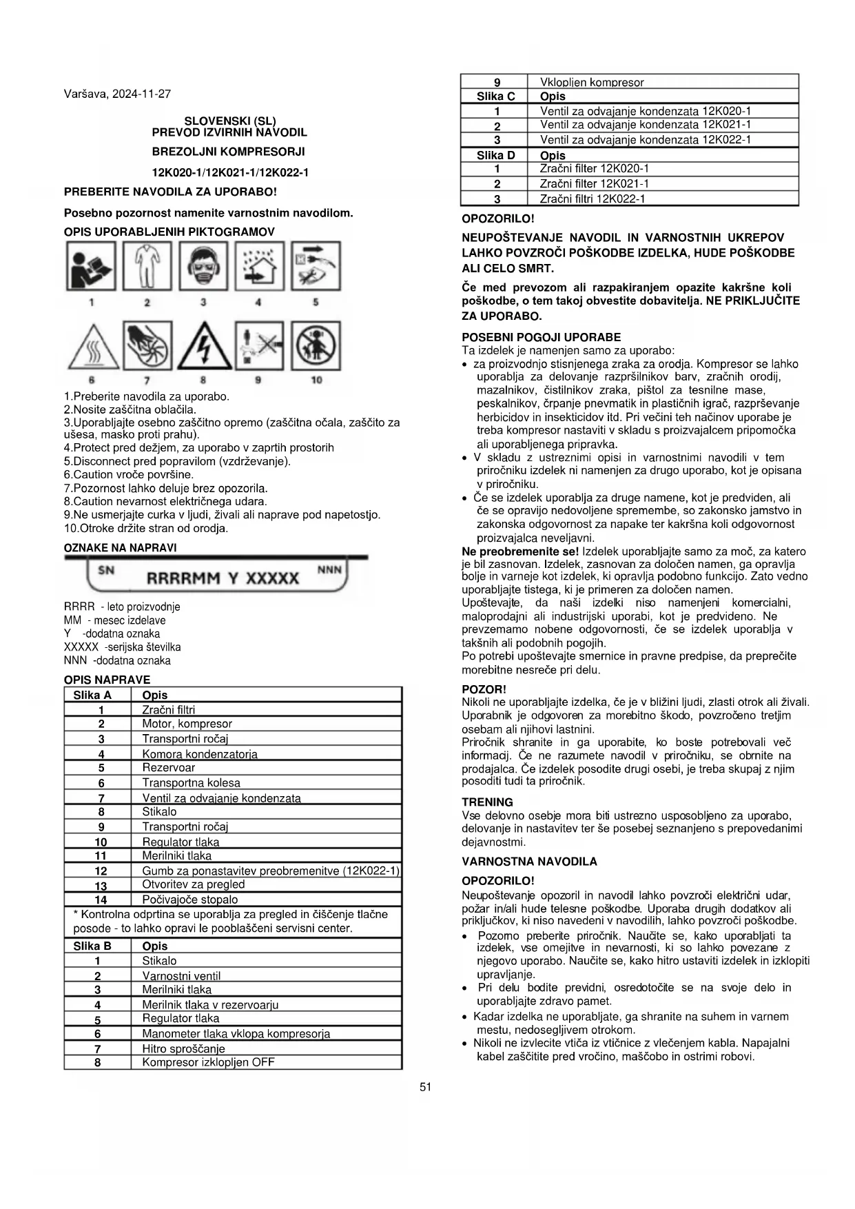 - Tveganje, da hrup povzroči izgubo sluha in druge fiziološke motnje (npr. izgubo ravnotežja, izgubo zavesti). nevarnost vibracij (povzročajo vaskularne in nevrološke poškodbe sistema roka-roka, na primer t. i. "bolezen belih prstov").53 OPOZORILO! Izdelek ustvarja elektromagnetno polje zelo nizke jakosti. To polje lahko moti delovanje nekaterih srčnih spodbujevalnikov. Da bi zmanjšali tveganje resnih ali smrtnih poškodb, se morajo ljudje s srčnimi spodbujevalniki posvetovati z zdravnikom. Če nadtokovne zaščite ni, mora uporabnik zagotoviti, da je v napajalni tokokrog vgrajena nadtokovna zaščitna naprava. Ta mora izpolnjevati zahteve standarda EN60204-1. Za nasvet se obrnite na električarja. Kompresorja ne uporabljajte v eksplozivnem okolju: obstaja nevarnost resnih nesreč in požara. Visoka viskoznost olja se lahko pojavi med hladnim zagonom, zamašeni oljni filtri ali okvara ventila lahko povzročijo stradanje olja; Odprtine morajo biti med delovanjem kompresorja zaprte. Določite, kdaj je kompresor samodejno ali daljinsko krmiljen. Sprejmite potrebne ukrepe, da preprečite samodejni zagon ali daljinski zagon, ko se kompresor servisira, vzdržuje ali pregleduje: zaklenite glavni električni odklopnik. Nevarnost nastanka koksa v izpustnem cevovodu, ki lahko povzroči požar ali eksplozijo. Koncentracije predelanih plinov, ki lahko izpodrinejo dihalni zrak, je treba ohranjati na sprejemljivi ravni. Uporabnik mora upoštevati standard EN 12021 o dopustnih ravneh onesnaževal v dihalnem zraku. Za obdelavo tekočin, ki jih proizvede kompresor, je treba pred začetkom obratovanja kompresorja uporabiti separatorje, sifone in naprave za izpraznitev, saj ti niso dobavljeni; ODKRITJE