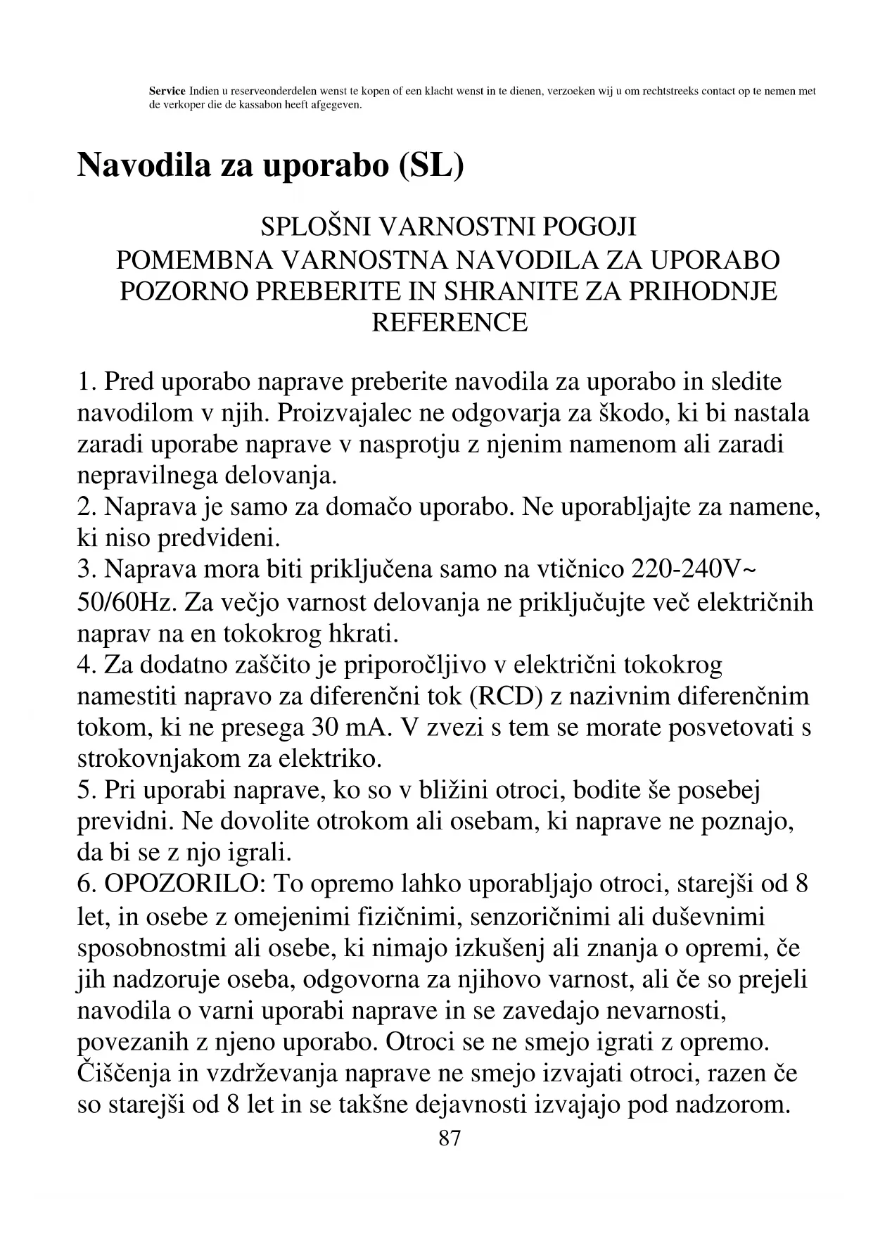 let, in osebe z omejenimi fizičnimi, senzoričnimi ali duševnimi sposobnostmi ali osebe, ki nimajo izkušenj ali znanja o opremi, če jih nadzoruje oseba, odgovorna za njihovo varnost, ali če so prejeli navodila o varni uporabi naprave in se zavedajo nevarnosti, povezanih z njeno uporabo. Otroci se ne smejo igrati z opremo. Čiščenja in vzdrževanja naprave ne smejo izvajati otroci, razen če so starejši od 8 let in se takšne dejavnosti izvajajo pod nadzorom.88