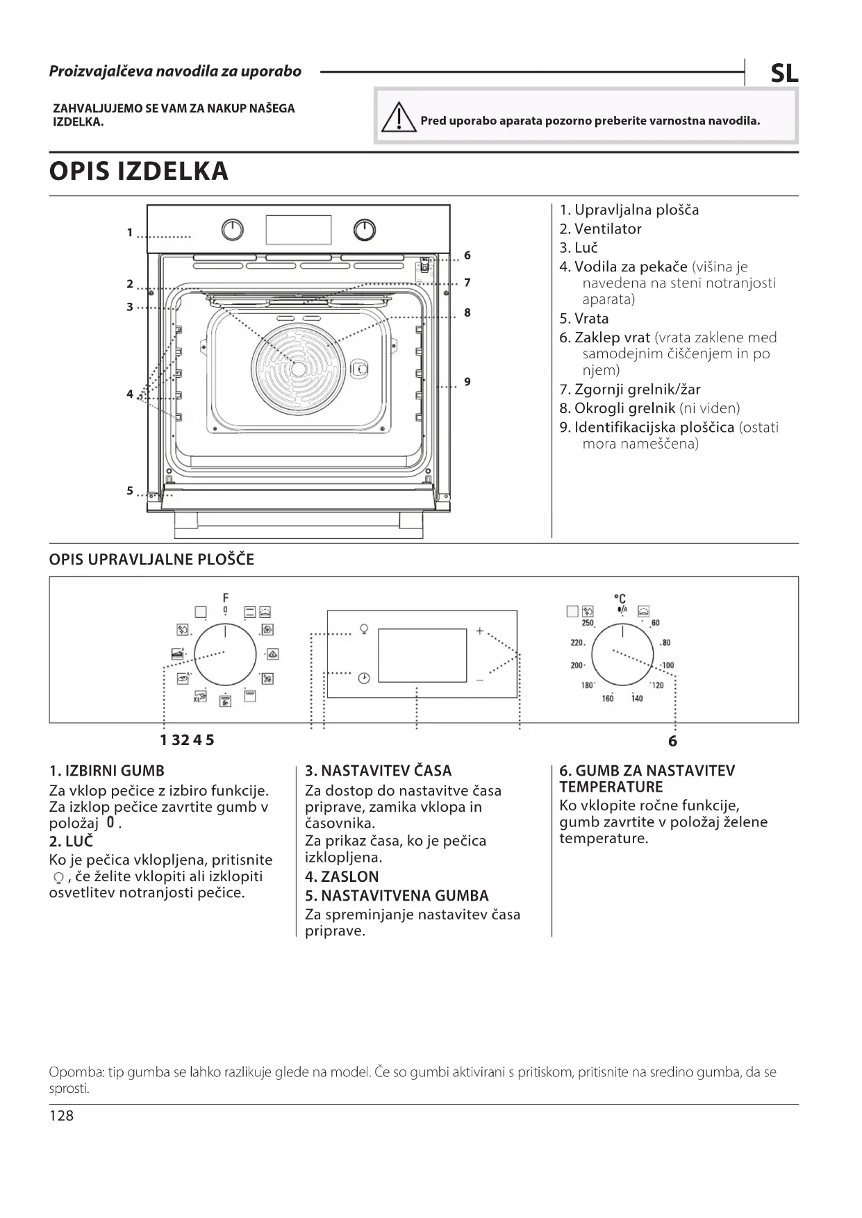 Opomba: tip gumba se lahko razlikuje glede na model. Če so gumbi aktivirani s pritiskom, pritisnite na sredino gumba, da se sprosti. ZAHVALJUJEMO SE VAM ZA NAKUP NAŠEGA IZDELKA. Pred uporabo aparata pozorno preberite varnostna navodila. OPIS IZDELKA129 PRIBOR REŠETKA PRESTREZNI PEKAČ* UNIVERZALNI PEKAČ* DRSNA VODILA. * Uporabljajte jo za pečenje hrane ali kot podporo za ponve, tortne modele in drugo posodo, ki je odporna na toploto.Lahko ga uporabite za pripravo mesa, rib, zelenjave in fokače oz. ga namestite pod rešetko za prestrezanje sokov.Za peko kruha in peciva ter tudi za pripravo pečenke, rib v lastnem soku itd.Za lažje vstavljanje ali odstranjevanje pribora. * Na voljo le pri določenih modelihŠtevilo in vrsta pribora se lahko razlikuje glede na kupljeni model.Druge kose pribora je mogoče posebej kupiti pri servisni službi.VSTAVLJANJE REŠETKE IN DRUGEGA PRIBORA V PEČICORešetko vstavite na želeno višino tako, da jo držite nagnjeno nekoliko navzgor, pri čemer na vodila najprej naslonite dvignjeno zadnjo stran.Nato jo vodoravno potisnite po vodilih, kakor daleč je mogoče.Drug pribor, kot je na primer pekač, vstavite v vodoravnem položaju, pri čemer naj pribor zdrsne po vodilih.DRSNA VODILA IN VODILA ZA PEKAČEPred uporabo pečice z drsnih vodil odstranite zaščitni trak [a] in nato še zaščitno folijo [b].DEMONTAŽA DRSNIH VODIL [c]Povlecite spodnji del drsnega vodila, da odklopite zatiče (1) in nato povlecite drsna vodila navzgor, da jih odstranite z zgornjih zatičev (2).MONTAŽA DRSNIH VODIL [d]Zgornje zatiče pritrdite na drsna vodila (1) in nato spodnji del drsnih vodil potisnite proti vodilu, da se spodnji zatiči pritrdijo (2).