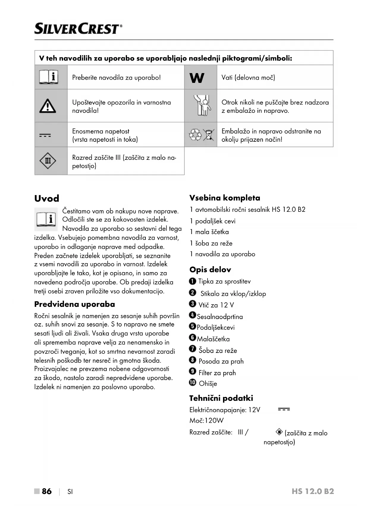 NAVODILA ZA UPORABO HS 12.0 B2 SILVERCREST