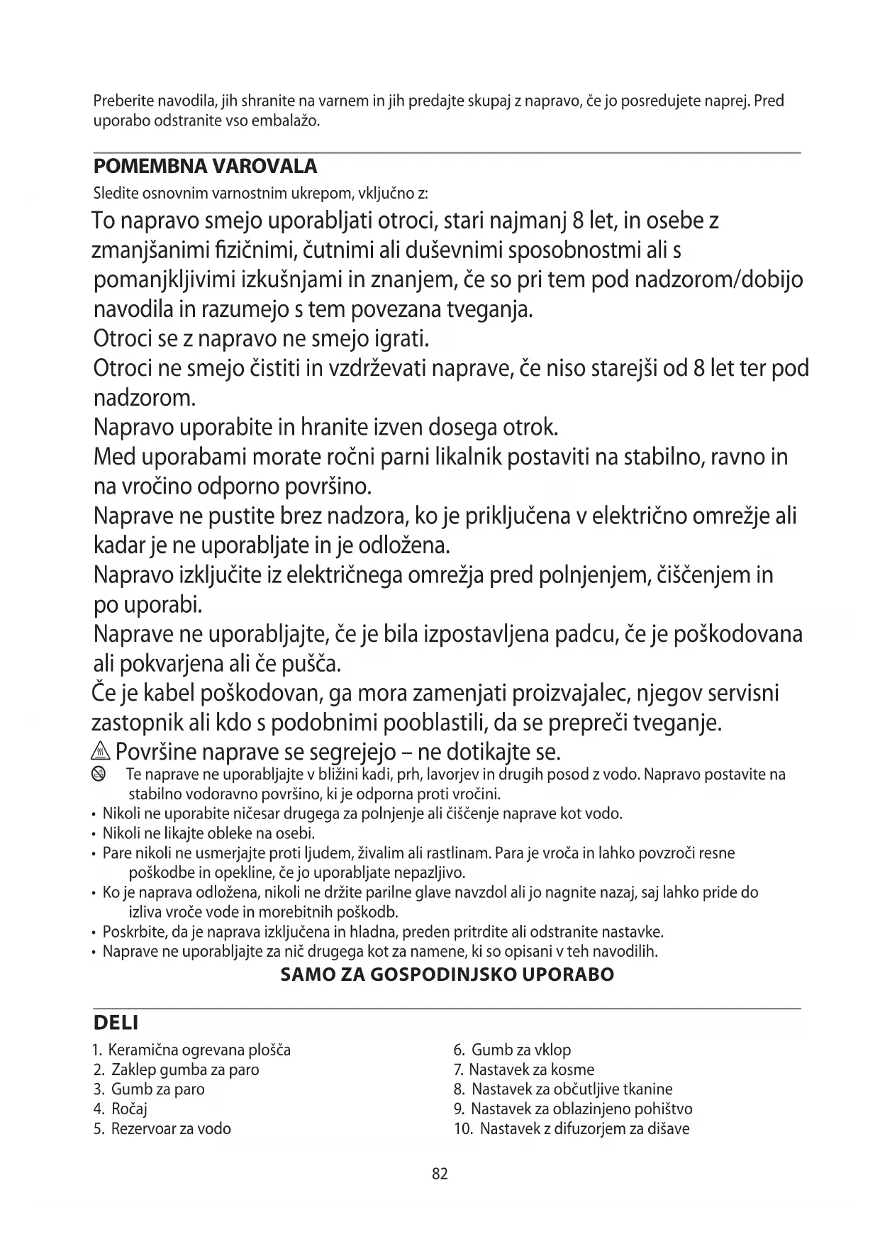 AE82 Preberite navodila, jih shranite na varnem in jih predajte skupaj z napravo, če jo posredujete naprej. Pred uporabo odstranite vso embalažo. POMEMBNA VAROVALA Sledite osnovnim varnostnim ukrepom, vključno z: To napravo smejo uporabljati otroci, stari najmanj 8 let, in osebe z zmanjšanimi zičnimi, čutnimi ali duševnimi sposobnostmi ali s pomanjkljivimi izkušnjami in znanjem, če so pri tem pod nadzorom/dobijo navodila in razumejo s tem povezana tveganja. Otroci se z napravo ne smejo igrati. Otroci ne smejo čistiti in vzdrževati naprave, če niso starejši od 8 let ter pod nadzorom. Napravo uporabite in hranite izven dosega otrok. Med uporabami morate ročni parni likalnik postaviti na stabilno, ravno in na vročino odporno površino. Naprave ne pustite brez nadzora, ko je priključena v električno omrežje ali kadar je ne uporabljate in je odložena. Napravo izključite iz električnega omrežja pred polnjenjem, čiščenjem in po uporabi. Naprave ne uporabljajte, če je bila izpostavljena padcu, če je poškodovana ali pokvarjena ali če pušča. Če je kabel poškodovan, ga mora zamenjati proizvajalec, njegov servisni zastopnik ali kdo s podobnimi pooblastili, da se prepreči tveganje. h Površine naprave se segrejejo – ne dotikajte se. b Te naprave ne uporabljajte v bližini kadi, prh, lavorjev in drugih posod z vodo. Napravo postavite na stabilno vodoravno površino, ki je odporna proti vročini.
