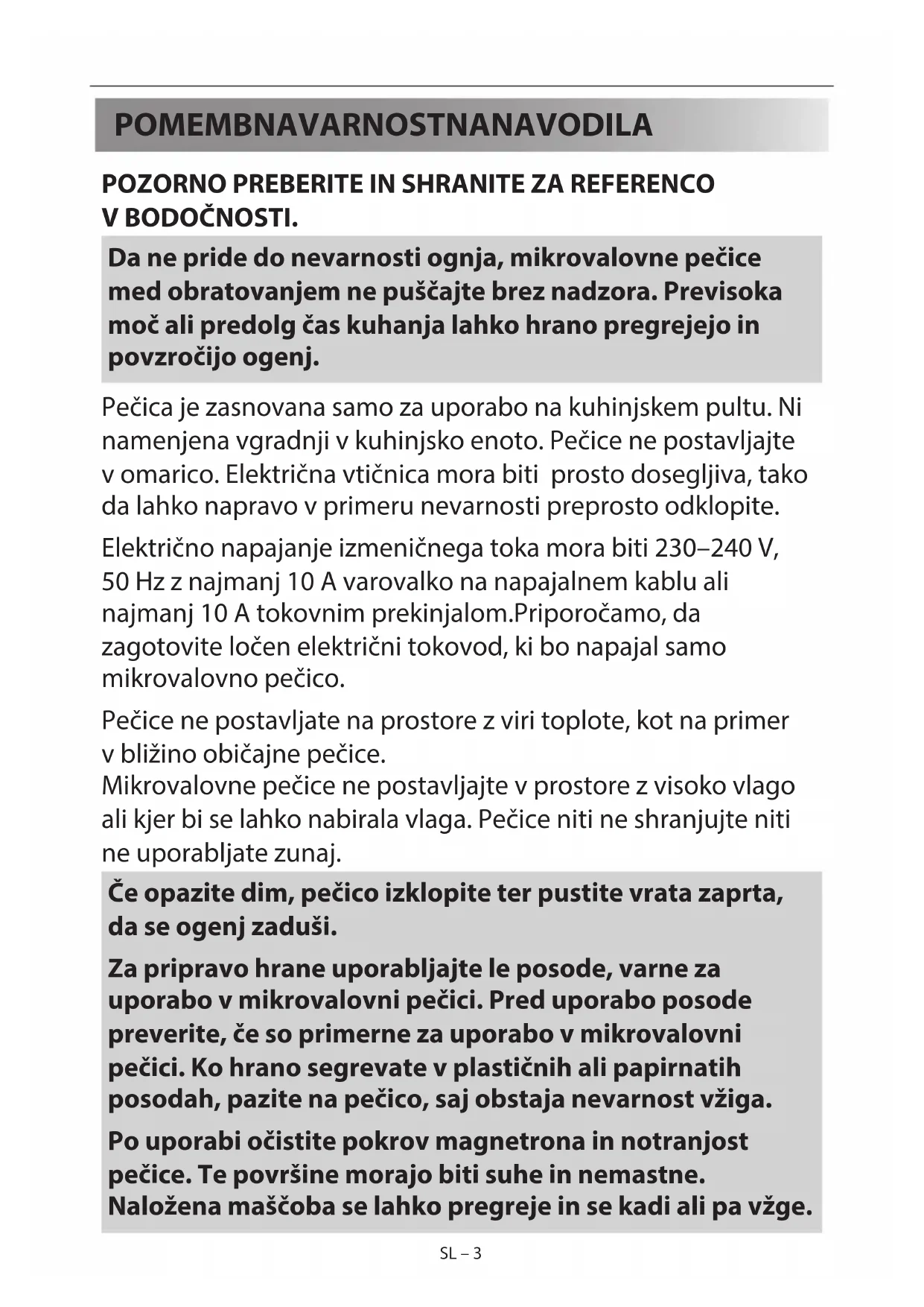 VBODOČNOSTI. Da ne pride do nevarnosti ognja, mikrovalovne pečice med obratovanjem ne puščajte brez nadzora. Previsoka moč ali predolg čas kuhanja lahko hrano pregrejejo in povzročijo ogenj. Pečica je zasnovana samo za uporabo na kuhinjskem pultu. Ni namenjena vgradnji v kuhinjsko enoto. Pečice ne postavljajte vomarico. Električna vtičnica mora biti prosto dosegljiva, tako da lahko napravo v primeru nevarnosti preprosto odklopite. Električno napajanje izmeničnega toka mora biti 230–240V, 50Hz z najmanj 10 A varovalko na napajalnem kablu ali najmanj 10 A tokovnim prekinjalom.Priporočamo, da zagotovite ločen električni tokovod, ki bo napajal samo mikrovalovno pečico. Pečice ne postavljate na prostore z viri toplote, kot na primer vbližino običajne pečice. Mikrovalovne pečice ne postavljajte v prostore z visoko vlago ali kjer bi se lahko nabirala vlaga. Pečice niti ne shranjujte niti ne uporabljate zunaj. Če opazite dim, pečico izklopite ter pustite vrata zaprta, da se ogenj zaduši. Za pripravo hrane uporabljajte le posode, varne za uporabo v mikrovalovni pečici. Pred uporabo posode preverite, če so primerne za uporabo v mikrovalovni pečici. Ko hrano segrevate v plastičnih ali papirnatih posodah, pazite na pečico, saj obstaja nevarnost vžiga. Po uporabi očistite pokrov magnetrona in notranjost pečice. Te površine morajo biti suhe in nemastne. Naložena maščoba se lahko pregreje in se kadi ali pa vžge.SL SL – 3SL – 3