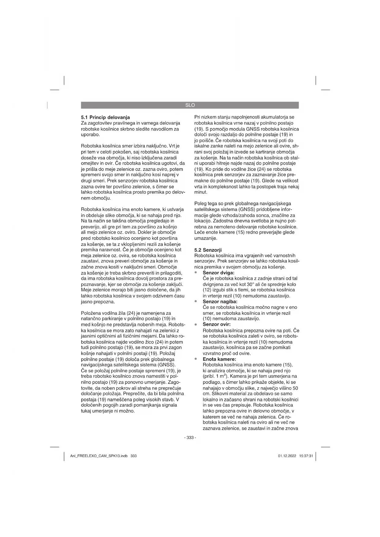 Enota kamere: Robotska kosilnica ima enoto kamere (15), ki analizira območje, ki se nahaja pred njo (pribl. 1 m²). Kamera je pri tem usmerjena na podlago, s čimer lahko prikaže objekte, ki se nahajajo v območju slike, z največjo višino 50 cm. Slikovni material za obdelavo se samo lokalno in začasno shrani na robotski kosilnici in se ves čas prepisuje. Robotska kosilnica lahko prepozna ovire in delovno območje, v katerem se več ne nahaja zelenica. Če ro- botska kosilnica naleti na oviro ali ne več ne zaznava zelenice, se zaustavi in začne znova Anl_FREELEXO_CAM_SPK13.indb 333Anl_FREELEXO_CAM_SPK13.indb 333 01.12.2022 15:37:3101.12.2022 15:37:31SLO