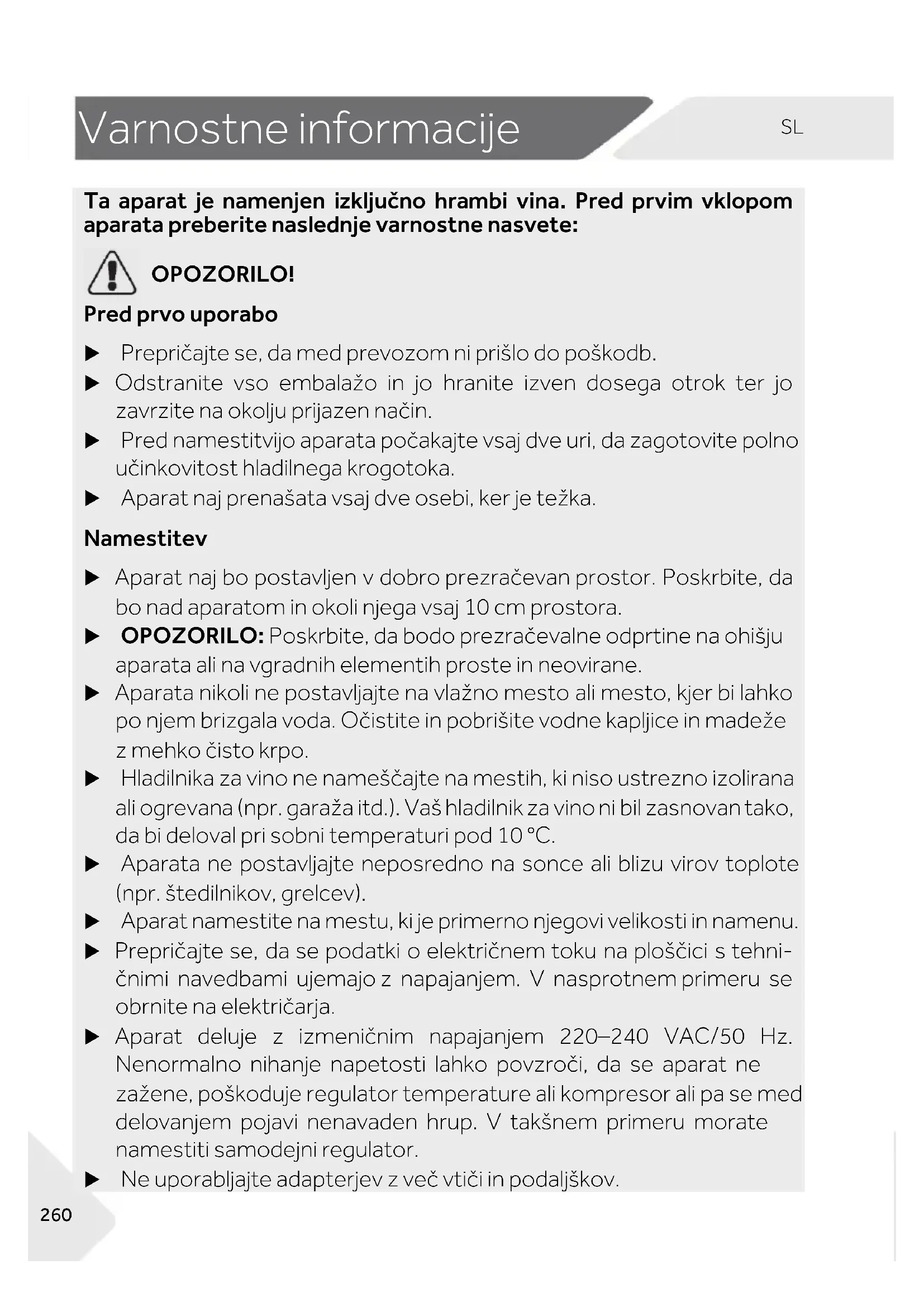 Ta aparat je namenjen izključno hrambi vina. Pred prvim vklopom aparata preberite naslednje varnostne nasvete: OPOZORILO! Pred prvo uporabo Prepričajte se, da med prevozom ni prišlo do poškodb. Odstranite vso embalažo in jo hranite izven dosega otrok ter jo zavrzite na okolju prijazen način. Pred namestitvijo aparata počakajte vsaj dve uri, da zagotovite polno učinkovitost hladilnega krogotoka. Aparat naj prenašata vsaj dve osebi, ker je težka. Namestitev Aparat naj bo postavljen v dobro prezračevan prostor. Poskrbite, da bo nad aparatom in okoli njega vsaj 10 cm prostora. OPOZORILO: Poskrbite, da bodo prezračevalne odprtine na ohišju aparata ali na vgradnih elementih proste in neovirane. Aparata nikoli ne postavljajte na vlažno mesto ali mesto, kjer bi lahko po njem brizgala voda. Očistite in pobrišite vodne kapljice in madeže z mehko čisto krpo. Hladilnika za vino ne nameščajte na mestih, ki niso ustrezno izolirana ali ogrevana (npr. garaža itd.). Vaš hladilnik za vino ni bil zasnovan tako, da bi deloval pri sobni temperaturi pod 10 °C. Aparata ne postavljajte neposredno na sonce ali blizu virov toplote (npr. štedilnikov, grelcev). Aparat namestite na mestu, ki je primerno njegovi velikosti in namenu. Prepričajte se, da se podatki o električnem toku na ploščici s tehni- čnimi navedbami ujemajo z napajanjem. V nasprotnem primeru se obrnite na električarja. Aparat deluje z izmeničnim napajanjem 220–240 VAC/50 Hz. Nenormalno nihanje napetosti lahko povzroči, da se aparat ne zažene, poškoduje regulator temperature ali kompresor ali pa se med delovanjem pojavi nenavaden hrup. V takšnem primeru morate namestiti samodejni regulator. Ne uporabljajte adapterjev z več vtiči in podaljškov."&!