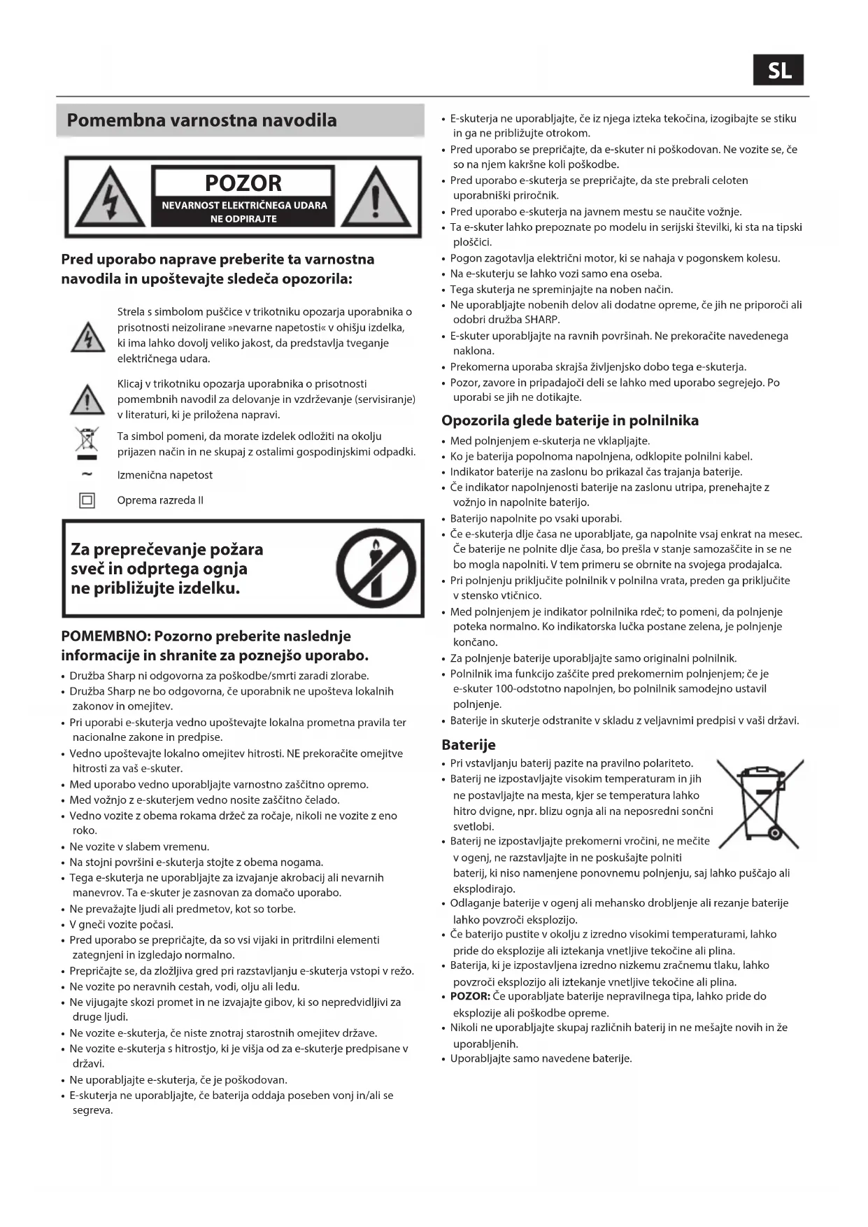 - Družba Sharp ni odgovorna za poškodbe/smrti zaradi zlorabe.• Družba Sharp ne bo odgovorna, če uporabnik ne upošteva lokalnih zakonov in omejitev.• Pri uporabi e-skuterja vedno upoštevajte lokalna prometna pravila ter nacionalne zakone in predpise.• Vedno upoštevajte lokalno omejitev hitrosti. NE prekoračite omejitve hitrosti za vaš e-skuter.• Med uporabo vedno uporabljajte varnostno zaščitno opremo.• Med vožnjo z e-skuterjem vedno nosite zaščitno čelado.• Vedno vozite z obema rokama držeč za ročaje, nikoli ne vozite z eno roko.• Ne vozite v slabem vremenu.• Na stojni površini e-skuterja stojte z obema nogama.• Tega e-skuterja ne uporabljajte za izvajanje akrobacij ali nevarnih manevrov. Ta e-skuter je zasnovan za domačo uporabo.• Ne prevažajte ljudi ali predmetov, kot so torbe.• V gneči vozite počasi.• Pred uporabo se prepričajte, da so vsi vijaki in pritrdilni elementi zategnjeni in izgledajo normalno.• Prepričajte se, da zložljiva gred pri razstavljanju e-skuterja vstopi v režo.• Ne vozite po neravnih cestah, vodi, olju ali ledu.• Ne vijugajte skozi promet in ne izvajajte gibov, ki so nepredvidljivi za druge ljudi.• Ne vozite e-skuterja, če niste znotraj starostnih omejitev države.• Ne vozite e-skuterja s hitrostjo, ki je višja od za e-skuterje predpisane v državi.• Ne uporabljajte e-skuterja, če je poškodovan.• E-skuterja ne uporabljajte, če baterija oddaja poseben vonj in/ali se segreva.• E-skuterja ne uporabljajte, če iz njega izteka tekočina, izogibajte se stiku in ga ne približujte otrokom.• Pred uporabo se prepričajte, da e-skuter ni poškodovan. Ne vozite se, če so na njem kakršne koli poškodbe.• Pred uporabo e-skuterja se prepričajte, da ste prebrali celoten uporabniški priročnik.• Pred uporabo e-skuterja na javnem mestu se naučite vožnje.• Ta e-skuter lahko prepoznate po modelu in serijski številki, ki sta na tipski ploščici.• Pogon zagotavlja električni motor, ki se nahaja v pogonskem kolesu.• Na e-skuterju se lahko vozi samo ena oseba.• Tega skuterja ne spreminjajte na noben način.• Ne uporabljajte nobenih delov ali dodatne opreme, če jih ne priporoči ali odobri družba SHARP.• E-skuter uporabljajte na ravnih površinah. Ne prekoračite navedenega naklona.• Prekomerna uporaba skrajša življenjsko dobo tega e-skuterja.• Pozor, zavore in pripadajoči deli se lahko med uporabo segrejejo. Po uporabi se jih ne dotikajte. Opozorila glede baterije in polnilnika