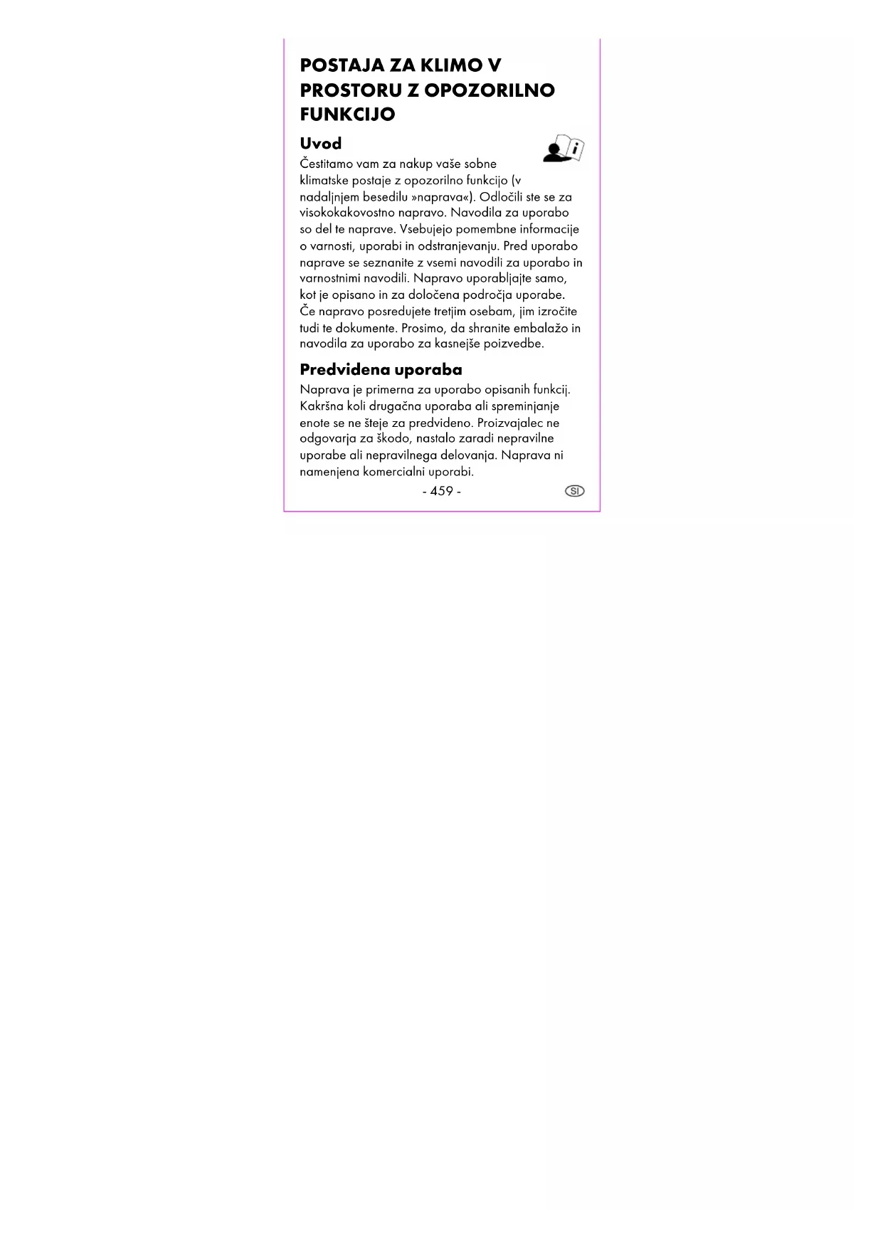 FUNKCIJO Uvod Čestitamo vam za nakup vaše sobne klimatske postaje z opozorilno funkcijo (v nadaljnjem besedilu »naprava«). Odločili ste se za visokokakovostno napravo. Navodila za uporabo so del te naprave. Vsebujejo pomembne informacije o varnosti, uporabi in odstranjevanju. Pred uporabo naprave se seznanite z vsemi navodili za uporabo in varnostnimi navodili. Napravo uporabljajte samo, kot je opisano in za določena področja uporabe. Če napravo posredujete tretjim osebam, jim izročite tudi te dokumente. Prosimo, da shranite embalažo in navodila za uporabo za kasnejše poizvedbe. Predvidena uporaba Naprava je primerna za uporabo opisanih funkcij. Kakršna koli drugačna uporaba ali spreminjanje enote se ne šteje za predvideno. Proizvajalec ne odgovarja za škodo, nastalo zaradi nepravilne uporabe ali nepravilnega delovanja. Naprava ni namenjena komercialni uporabi.- 460 - Obseg dobave Opomba: Po nakupu preverite obseg dobave. Prepričajte se, da so vsi deli prisotni in da niso okvarjeni. Če je dobava nepopolna in/ali so deli poškodovani, naprave ne uporabljajte. Obrnite se na servisno službo (glejte »Obdelava v primeru uveljavljanja garancije«). 1 x sobna klimatska postaja 2 x 1,5V AAA LR03 baterije 1 x navodila za uporabo Tehnični podatki Merilno območje/temperatura: 0 °C — 50 °C Merilno območje/vlažnost: 20 % - 95 % Prikaz temperature/toleranca v merilnem območju jedra: +/- 1 °C Prikaz vlažnosti/toleranca v merilnem območju jedra: 41 % — 80 % — ± 3 %; drugo območje: ± 5 % Dimenzije: cca 115 x 74 x 24 mm Teža: Model 1: približno 97 g (brez baterij) Model 2: približno 93 g (brez baterij) Baterije: 2 x 1,5 V AAA R03/LR03- 461 - — Oznaka za enosmerno napetost Razlaga simbolov OPOZORILO! Ta opozorilni simbol/opozorilna beseda označuje nevarnost s srednjo stopnjo tveganja, ki lahko, če se temu ne izognemo, povzroči smrt ali hude telesne poškodbe. Opomba: Ta signalna beseda se uporablja za dodatne informacije.