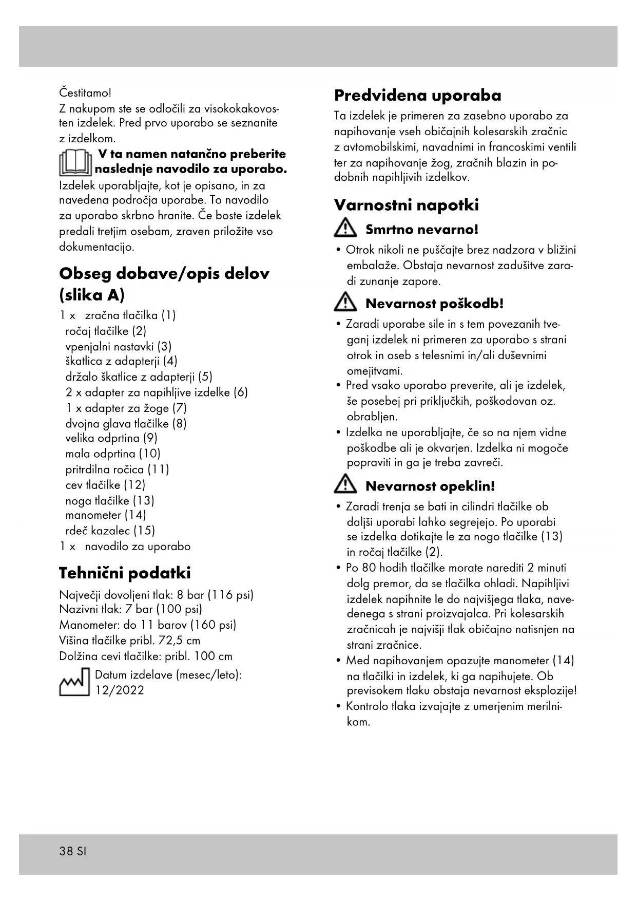 - Med napihovanjem vedno stojte z obema nogama na nogi tlačilke (13), da se izdelek ne prevrne. Cev tlačilke (12) ne sme biti prepognjena! Ročaj tlačilke (2) premikajte enakomerno in ne prehitro. Izbira adapterjev (slika B) Adapterji (6/7) so v škatli z adapterji (4) na izdelku. Škatlo z adapterji potisnite iz držala škatle z adapterji (5). Odprite škatlo z adapterji in vzemite ven potrebni adapter. Napihovanje žog (slika C) Vstavite adapter za žoge (7) v veliko odprtino (9) dvojne glave tlačilke (8). Prestavite pritrdilno ročico (11) navzgor, da fiksi- rate adapter. Nato adapter vstavite v žogo. Napihovanje napihljivih izdelkov (slika D) Odprite ventil napihljivega izdelka. Vstavite ustrezni adapter za napihljive izdelke (6) v veliko odprtino (9) dvojne glave tlačilke (8). Prestavite pritrdilno ročico (11) navzgor, da fiksirate adapter. Nato adapter vstavite v ventil napihljivega izdelka. Napihovanje zračnic z navadnim ventilom (slika E) Odprite pokrovček ventila zračnice. Namestite malo odprtino (10) dvojne glave tlačilke (8) na ventil. Prestavite pritrdilno ročico (11) navzgor, da fiksirate adapter. Napihovanje zračnic z avtomobilskim ventilom (slika F) Odprite pokrovček ventila zračnice. Namestite veliko odprtino (9) dvojne glave tlačilke (8) na ventil. Prestavite pritrdilno ročico (11) navzgor, da fiksirate adapter. Napihovanje zračnic s francoskim ventilom (slika G) Odprite pokrovček ventila zračnice. Odvijte matico ventila. Namestite malo odprtino (10) dvojne glave tlačilke (8) na ventil. Prestavite pritr- dilno ročico (11) navzgor, da fiksirate adapter. Transport (slika H) Položite cev tlačilke (12) prek ročaja tlačilke (2). Pritrdite cev tlačilke v oba vpenjalna nastavka (3). Nato lahko izdelek dvignete za ročaj tlačilke in ga transportirate. Shranjevanje, čiščenje Izdelek v suhem in čistem stanju shranite v pro- storu z zmerno temperaturo. Izdelka ne potapljajte v vodo, saj se sicer poško- duje! Čistite le z vlažno krpo za čiščenje in nato do suhega obrišite. Vse premične dele občasno naoljite z nekaj olja. POMEMBNO! Nikoli ne čistite z ostrimi čistilnimi sredstvi. Napotki za odlaganje v smeti Izdelek in embalažni material zavrzite v skladu z veljavnimi lokalnimi predpisi. Embalažni material (kot so npr. vrečke iz folije) hranite izven dosega otrok. Druge informacije o odstranjevanju odsluženega izdelka med odpadke lahko dobite pri svoji občinski ali mestni upravi. Izdelek in embalažo zavrzite okolju prijazno. Koda za recikliranje je namenjena označevanju različnih materialov za vrnitev v cikel recikliranja. Koda je sestavljena iz simbola recikliranja za cikel recikliranja in številke, ki označuje material.40 SI Napotki za garancijo in izvajanje servisne storitve Izdelek je bil izdelan z veliko skrbnostjo in pod stalno kontrolo. DELTA-SPORT HANDELSKON- TOR GmbH zasebnim končnim kupcem od datuma nakupa (garancijskega obdobja) v skladu z naslednjimi določbami odobri triletno garancijo na to postavko. Garancija velja samo za napake v materialu in obdelavi. Garancija ne velja za dele, ki so podvrženi običajni obrabi in jih je zato treba šteti za obrabljive dele (npr. baterije), in za lomljive dele, kot so npr. stikala, akumulatorji ali deli iz stekla. Zahtevki iz te garancije so izključeni, če je bil izdelek uporabljen nepravilno ali pretirano ali če ni bil uporabljen v okviru predvidenega namena ali predvidenega obsega uporabe ali če niso bile upoštevane specifikacije v navodilih za uporabo, razen če končni kupec lahko dokaže, da gre za napako v materialu ali izdelavi, ki ne temelji na eni od zgoraj navedenih okoliščin. Garancijski zahtevki se lahko uveljavljajo le v garancijskem roku ob predložitvi originalnega računa. Zato originalni račun shranite. Garancij- ski čas se zaradi morebitnih popravil na podlagi garancije, zakonskega jamstva ali kulance ne podaljša. To velja tudi za zamenjane in popra- vljene dele. Pri morebitnih reklamacijah se najprej obrnite na spodaj navedeno servisno številko za nujne primere ali stopite z nami v stik po elektronski pošti. Če obstaja garancijski primer, vam bomo izdelek po naši izbiri brezplačno popravili, zamenjali ali pa vam bomo povrnili kupnino. Druge pravice iz garancije ne obstajajo. Ta garancija ne omejuje vaših zakonskih pravic, še posebej garancijskih zahtevkov do prodajal- ca. IAN: 409048_2207 Servis Slovenija Tel.: 080080917 E-Mail: deltasport@lidl.si Garancijski list