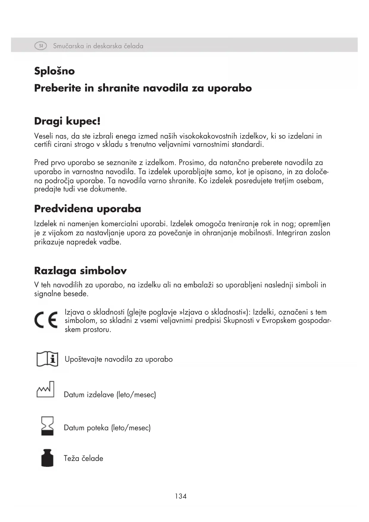 Splošno Preberite in shranite navodila za uporabo Dragi kupec! Veseli nas, da ste izbrali enega izmed naših visokokakovostnih izdelkov, ki so izdelani in certi cirani strogo v skladu s trenutno veljavnimi varnostnimi standardi. Pred prvo uporabo se seznanite z izdelkom. Prosimo, da natančno preberete navodila za uporabo in varnostna navodila. Ta izdelek uporabljajte samo, kot je opisano, in za določe- na področja uporabe. Ta navodila varno shranite. Ko izdelek posredujete tretjim osebam, predajte tudi vse dokumente. Predvidena uporaba Izdelek ni namenjen komercialni uporabi. Izdelek omogoča treniranje rok in nog; opremljen je z vijakom za nastavljanje upora za povečanje in ohranjanje mobilnosti. Integriran zaslon prikazuje napredek vadbe. Razlaga simbolov V teh navodilih za uporabo, na izdelku ali na embalaži so uporabljeni naslednji simboli in signalne besede. Izjava o skladnosti (glejte poglavje »Izjava o skladnosti«): Izdelki, označeni s tem simbolom, so skladni z vsemi veljavnimi predpisi Skupnosti v Evropskem gospodar- skem prostoru. Upoštevajte navodila za uporabo Datum izdelave (leto/mesec) Datum poteka (leto/mesec) Teža čeladeSmučarska in deskarska čelada