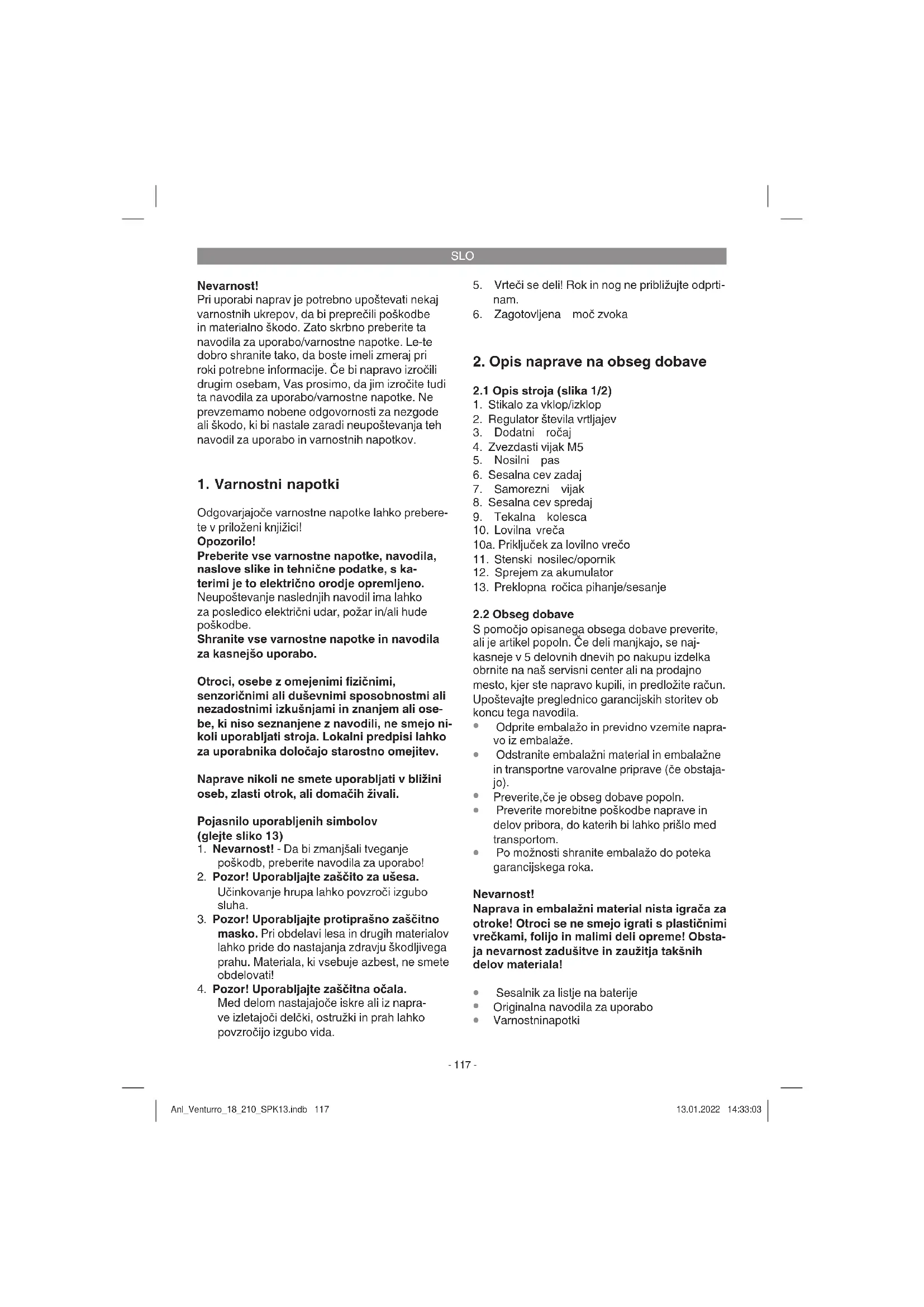 Teža .......................................................... 3,0 kg Pozor! Naprava je dobavljena brez akumulatorjev in polnilnika; uporabljate jo lahko samo z litij- ionskimi akumulatorskimi baterijami serije Power X-Change! Litij-ionske akumulatorske baterije serije Power X-Change je izključno dovoljeno polniti s polnilni- kom Power X-Charger. Izmerjen in zagotovljen nivo zvočne moči je bil določen v skladu z 2000/14/ES, razširjen pa z 2005/88/ES. Navedena vrednost vibracij je bila določena po standardiziranem testnem postopku in se lahko porablja za medsebojno primerjavo različnih izdelkov. Poleg tega je ta vrednost primerna za predhodno oceno obremenitev za uporabnika, ki nastanejo zaradi vibracij. Pozor! Odvisno od uporabe naprave lahko dejanske vrednosti vibracij odstopajo od navedenih! Sprej- mite ukrepe za zaščito pred obremenitvami za- radi vibracij! Pri tem upoštevajte celoten delovni postopek, tudi trenutke, ko naprava deluje brez obremenitve ali je izklopljena! Primerni ukrepi med drugim vključujejo redno vzdrževanje in nego naprave ter nastavkov za orodja, ogrevanje rok, redne odmore in dobro načrtovanje delovnih postopkov! Navedene skupne vrednosti nihanja in navedene vrednosti emisij hrupa so bile izmerjene po stan- dardiziranem testnem postopku in jo je mogoče za primerjavo električnega orodja primerjati z drugo vrednostjo. Navedene skupne vrednosti nihanja in navedene vrednosti emisij hrupa je možno uporabiti tudi za predhodno oceno obremenitve. Opozorilo: Vrednosti nihanj in emisij hrupa se lahko med dejansko uporabo električnega orodja razlikujejo od navedenih vrednosti, kar je odvisno od načina uporabe električnega orodja, zlasti od vrste ob- delovanca. Anl_Venturro_18_210_SPK13.indb 118Anl_Venturro_18_210_SPK13.indb 118 13.01.2022 14:33:0313.01.2022 14:33:03SLO