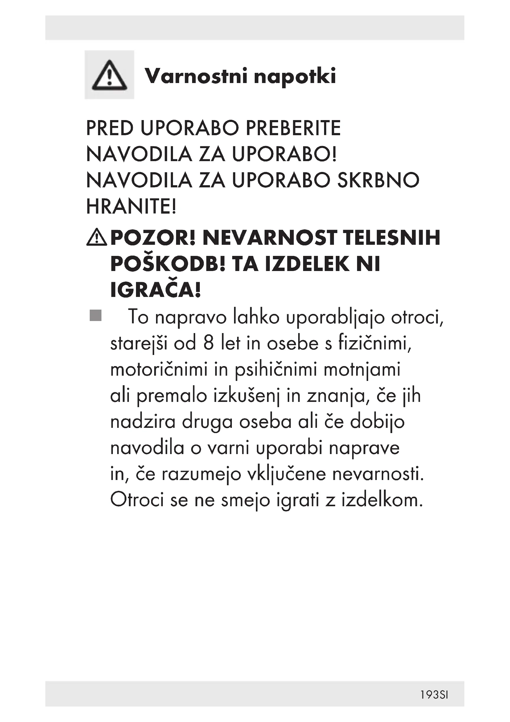 IGRAČA! To napravo lahko uporabljajo otroci, starejši od 8let in osebe s fizičnimi, motoričnimi in psihičnimi motnjami ali premalo izkušenj in znanja, če jih nadzira druga oseba ali če dobijo navodila o varni uporabi naprave in, če razumejo vključene nevarnosti. Otroci se ne smejo igrati z izdelkom.194 SI Otroci brez nadzora naprave ne smejo čistiti ali vzdrževati. Izdelka nikoli ne uporabljajte brez nameščene posode za kosme [5] ali nameščenega drsnika [8]. Rezil [9] ne odstranjujte medtem ko je izdelek vklopljen! Izdelka ne uporabljajte, če so rezila [9] poškodovana. Ne izvajajte prekomernega pritiska na rezila [9]. Rezila [9] so ostra - bodite previdni, sicer obstaja nevarnost poškodb. Na rezilih [9] ne uporabljajte olja ali masti! To bi lahko onesnažilo vaša oblačila!195SI Varnostni napotki za baterije/polnilne baterije