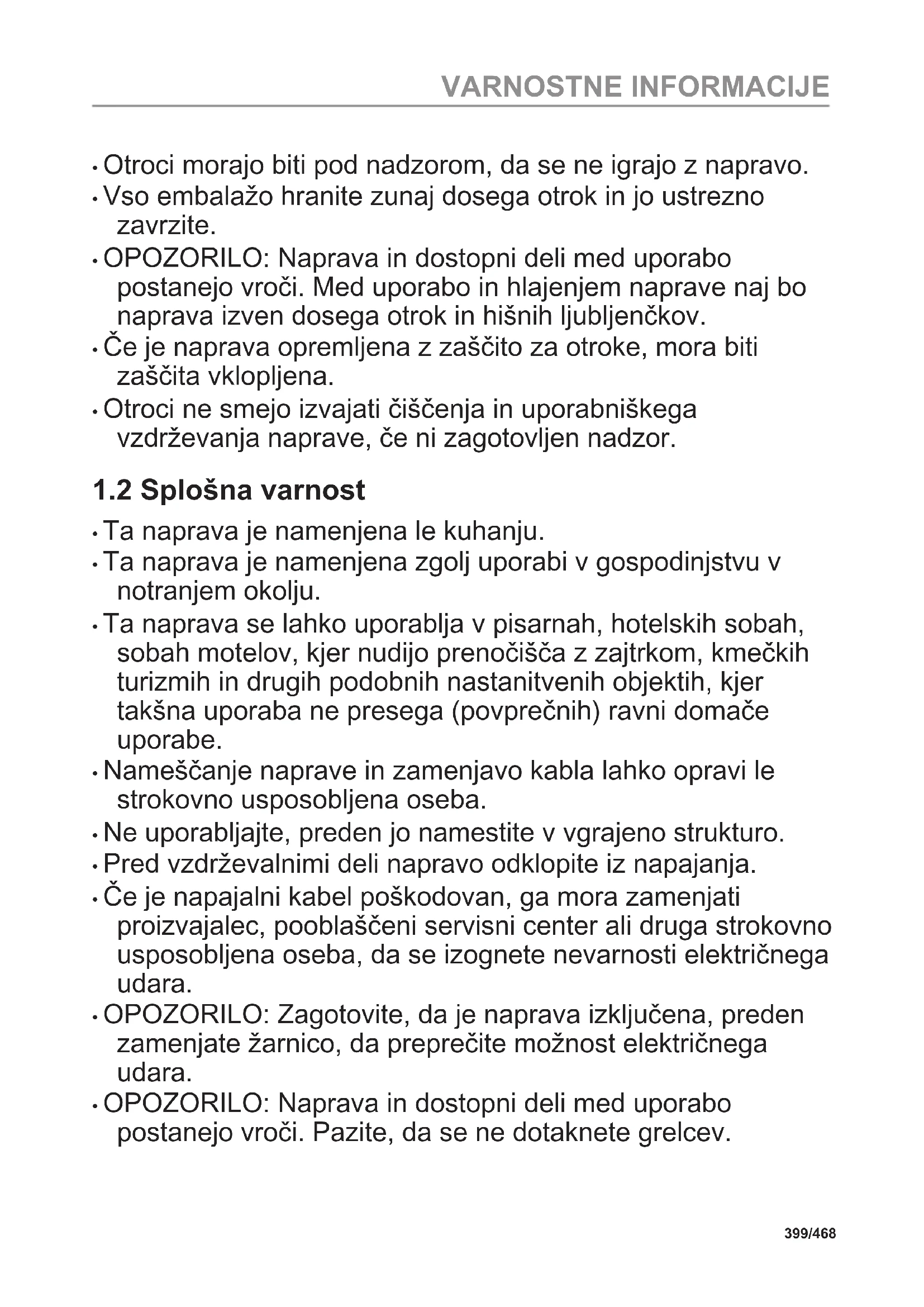 - To napravo lahko otroci od osmega leta naprej ter osebe z zmanjšanimi telesnimi, čutnimi ali razumskimi sposobnostmi ali s pomanjkanjem izkušenj ter znanja uporabljajo le pod nadzorom ali če so dobile ustrezna navodila glede varne uporabe naprave in če se zavedajo nevarnosti, ki obstajajo. Otroci, mlajši od osem (8) let, ter osebe z visoko stopnjo invalidnosti se ne smejo približevati napravi, če niso pod nenehnim nadzorom. 398/468 VARNOSTNE INFORMACIJE• Otroci morajo biti pod nadzorom, da se ne igrajo z napravo.