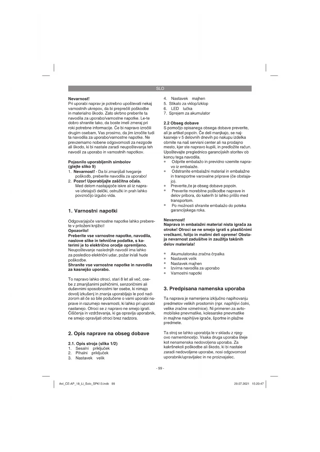 Ta naprava je namenjena izključno napihovanju predmetov velikih prostornin (npr. napihljivi čolni, velike zračne vzmetnice). Ni primeren za avto- mobilske pnevmatike, kolesarske pnevmatike in majhne napihljive igrače, športne in plažne predmete. Ta stroj se lahko uporablja le v skladu z njeg- ovo namembnostjo. Vsaka druga uporaba šteje kot nenamenska nedovoljena uporaba. Za kakršnekoli poškodbe ali škodo, ki bi nastale zaradi nedovoljene uporabe, nosi odgovornost uporabnik/upravljalec in ne proizvajalec. Anl_CE-AP_18_Li_Solo_SPK13.indb 99Anl_CE-AP_18_Li_Solo_SPK13.indb 99 29.07.2021 15:20:4729.07.2021 15:20:47SLO