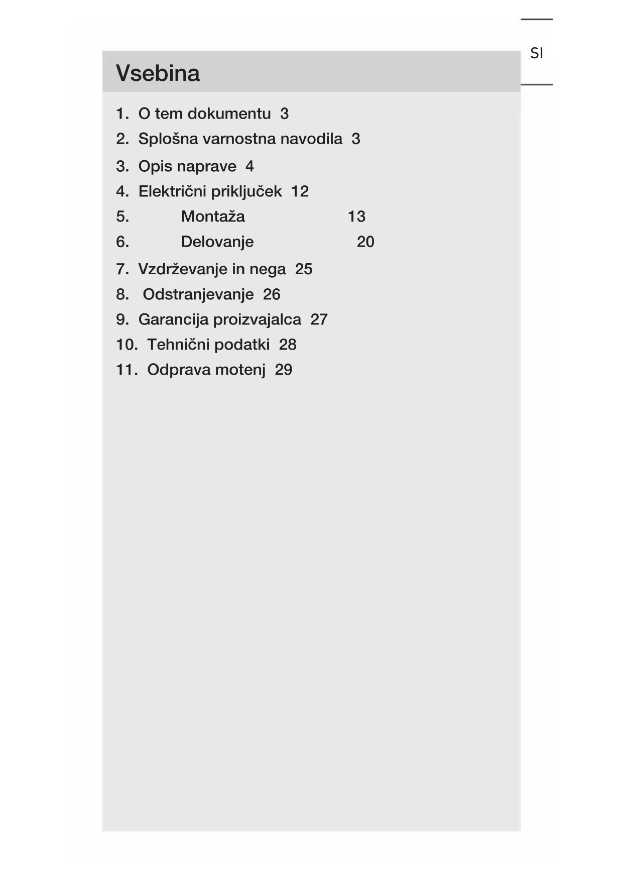 Električne aparate, opremo in embalažo je treba oddati v okolju prijazno ponovno predelavo. Električnih aparatov ne odstranjujte s hišnimi odpadki! Samo za države članice EU: V skladu z veljavno Evropsko direktivo o izrabljenih električnih in elektronskih aparatih in njenim prenosom v nacionalno zakonodajo je električne aparate, ki niso več uporabni, treba zbirati ločeno in jih oddati v okolju prijazno ponovno predelavo.– 27 – Vsebina SISI