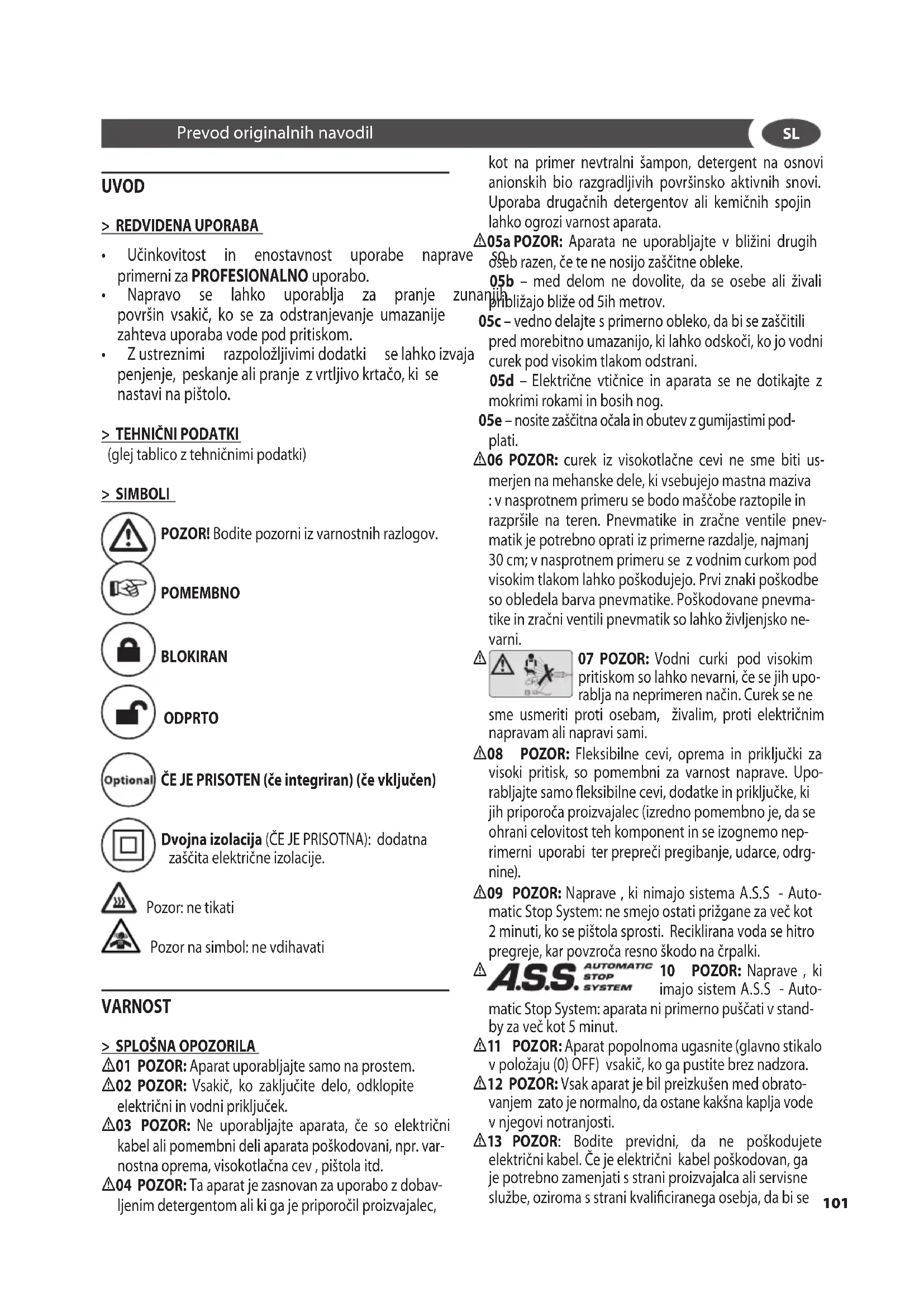 - 09 POZOR: Naprave , ki nimajo sistema A.S.S - Auto- matic Stop System: ne smejo ostati prižgane za več kot 2 minuti, ko se pištola sprosti. Reciklirana voda se hitro pregreje, kar povzroča resno škodo na črpalki.