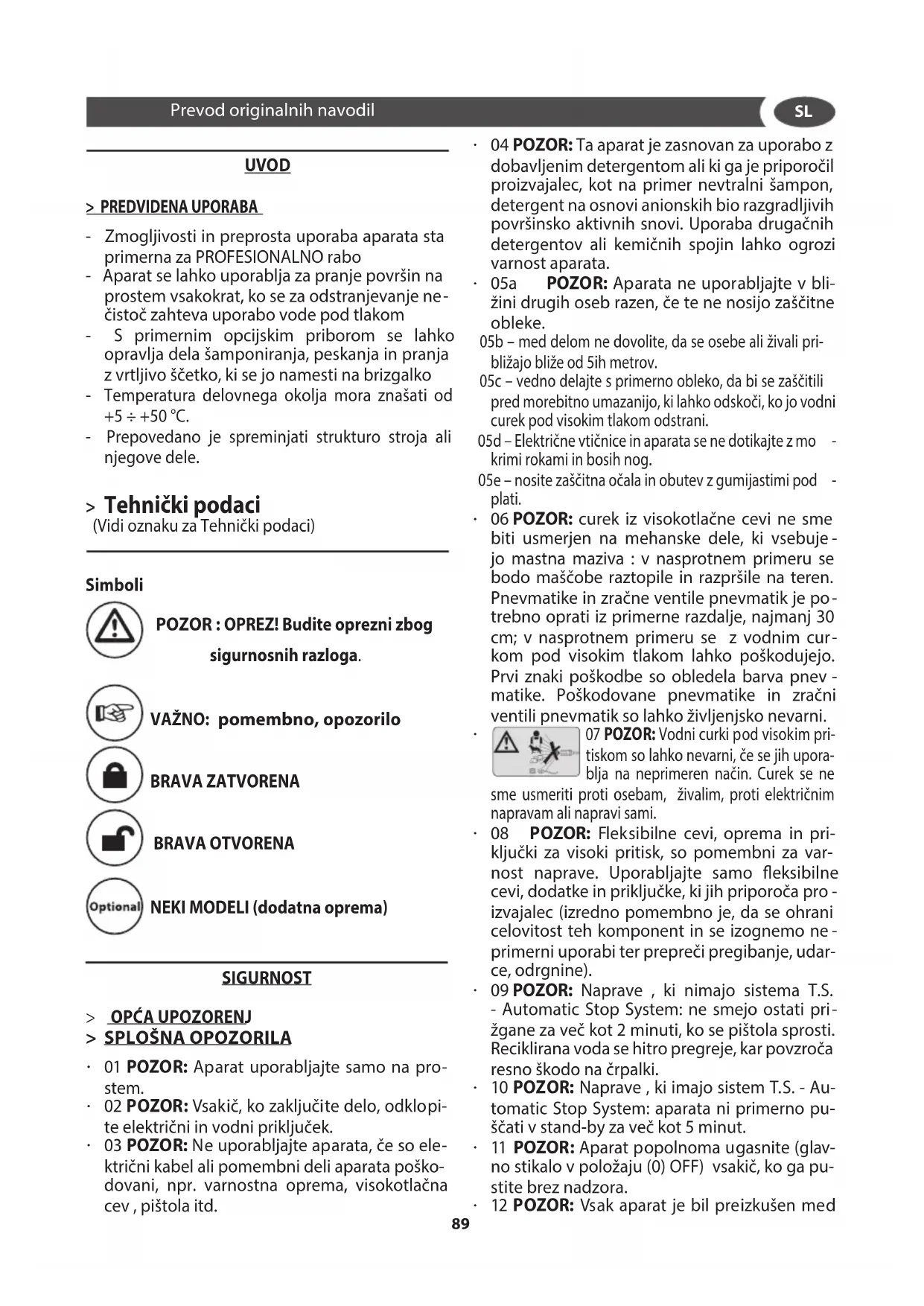 88UVOD > PREDVIDENA UPORABA - Zmogljivosti in preprosta uporaba aparata sta primerna za PROFESIONALNO rabo - Aparat se lahko uporablja za pranje površin na prostem vsakokrat, ko se za odstranjevanje ne