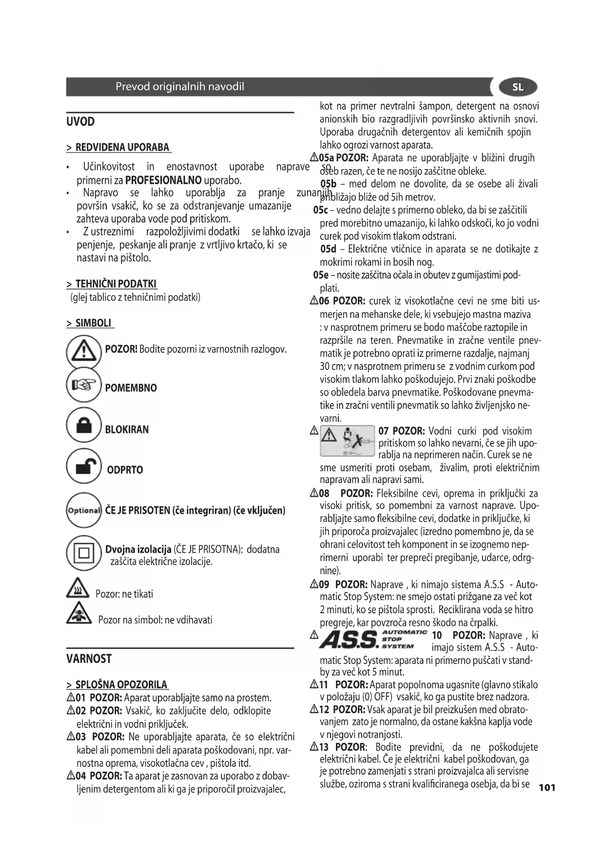 - 09 POZOR: Naprave , ki nimajo sistema A.S.S - Auto- matic Stop System: ne smejo ostati prižgane za več kot 2 minuti, ko se pištola sprosti. Reciklirana voda se hitro pregreje, kar povzroča resno škodo na črpalki.