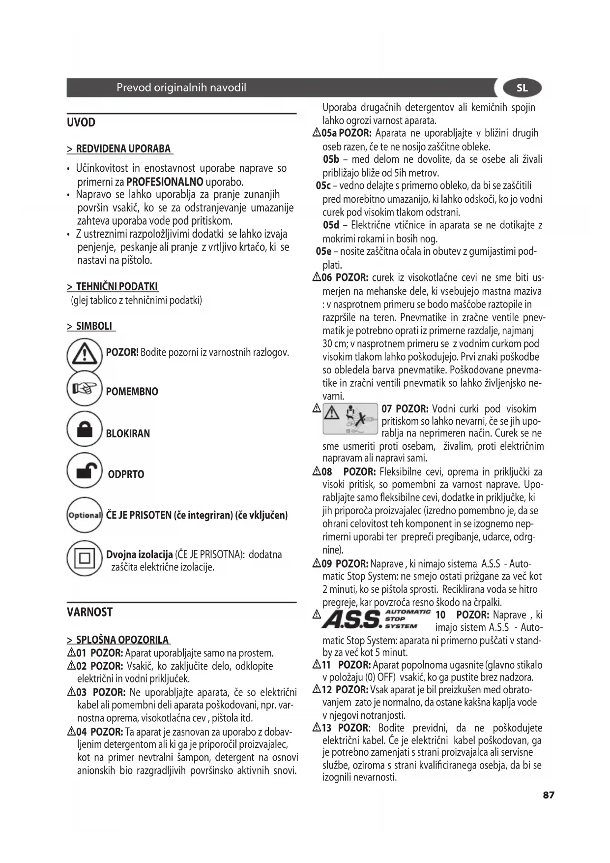 - 09 POZOR: Naprave , ki nimajo sistema A.S.S - Auto- matic Stop System: ne smejo ostati prižgane za več kot 2 minuti, ko se pištola sprosti. Reciklirana voda se hitro pregreje, kar povzroča resno škodo na črpalki.