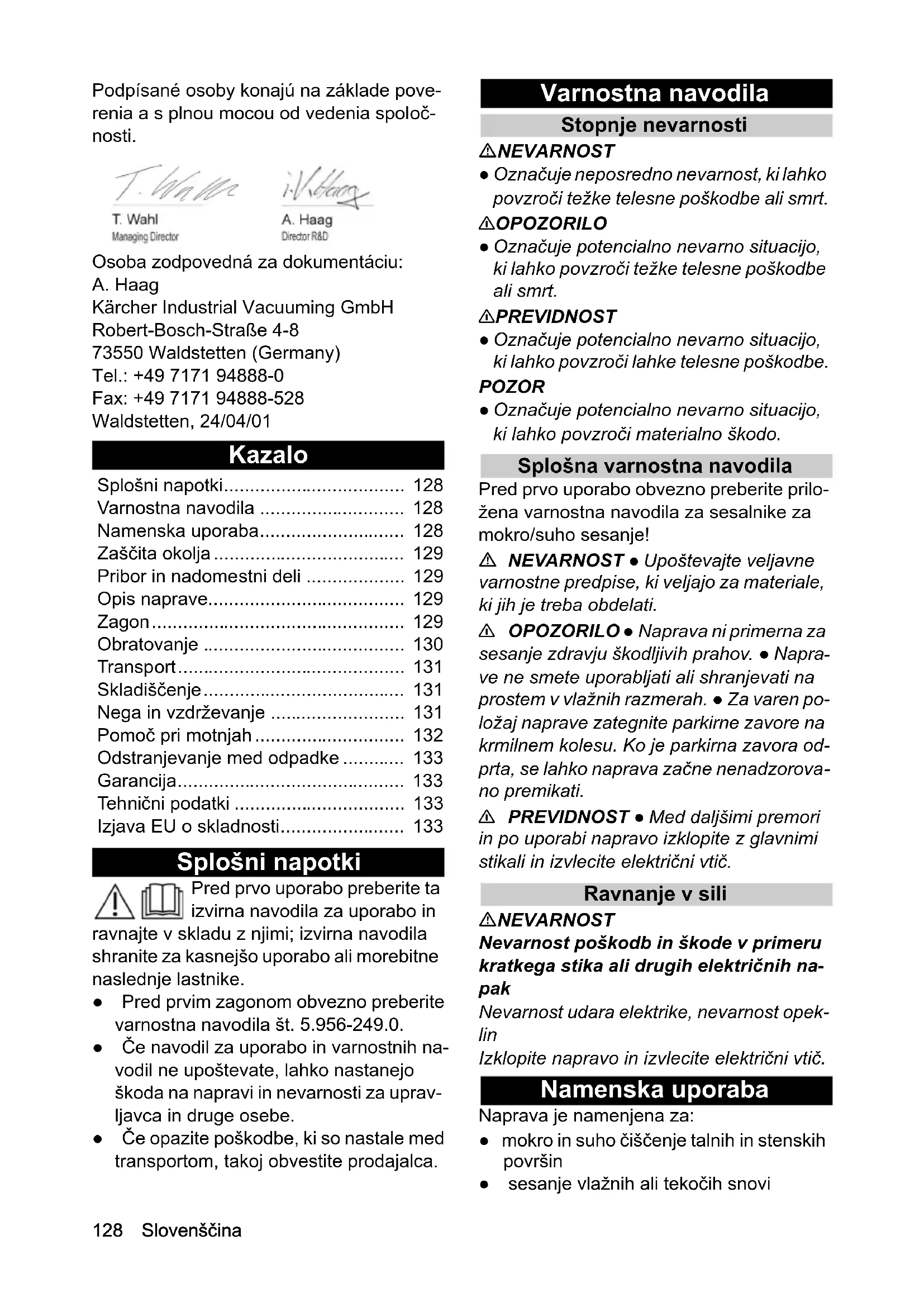 Dĺžka kábla m 10128 Slovenščina Podpísané osoby konajú na základe pove- renia a s plnou mocou od vedenia spoloč- nosti. Osoba zodpovedná za dokumentáciu: A. Haag Kärcher Industrial Vacuuming GmbH Robert-Bosch-Straße 4-8 73550 Waldstetten (Germany) Tel.: +49 7171 94888-0 Fax: +49 7171 94888-528 Waldstetten, 24/04/01 Kazalo Splošni napotki Pred prvo uporabo preberite ta izvirna navodila za uporabo in ravnajte v skladu z njimi; izvirna navodila shranite za kasnejšo uporabo ali morebitne naslednje lastnike. ● Pred prvim zagonom obvezno preberite varnostna navodila št. 5.956-249.0. ● Če navodil za uporabo in varnostnih na- vodil ne upoštevate, lahko nastanejo škoda na napravi in nevarnosti za uprav- ljavca in druge osebe. ● Če opazite poškodbe, ki so nastale med transportom, takoj obvestite prodajalca. Varnostna navodila Stopnje nevarnosti NEVARNOST ● Označuje neposredno nevarnost, ki lahko povzroči težke telesne poškodbe ali smrt. 몇 OPOZORILO ● Označuje potencialno nevarno situacijo, ki lahko povzroči težke telesne poškodbe ali smrt. 몇 PREVIDNOST ● Označuje potencialno nevarno situacijo, ki lahko povzroči lahke telesne poškodbe. POZOR ● Označuje potencialno nevarno situacijo, ki lahko povzroči materialno škodo. Splošna varnostna navodila Pred prvo uporabo obvezno preberite prilo- žena varnostna navodila za sesalnike za mokro/suho sesanje! NEVARNOST ● Upoštevajte veljavne varnostne predpise, ki veljajo za materiale, ki jih je treba obdelati. 몇 OPOZORILO ● Naprava ni primerna za sesanje zdravju škodljivih prahov. ● Napra