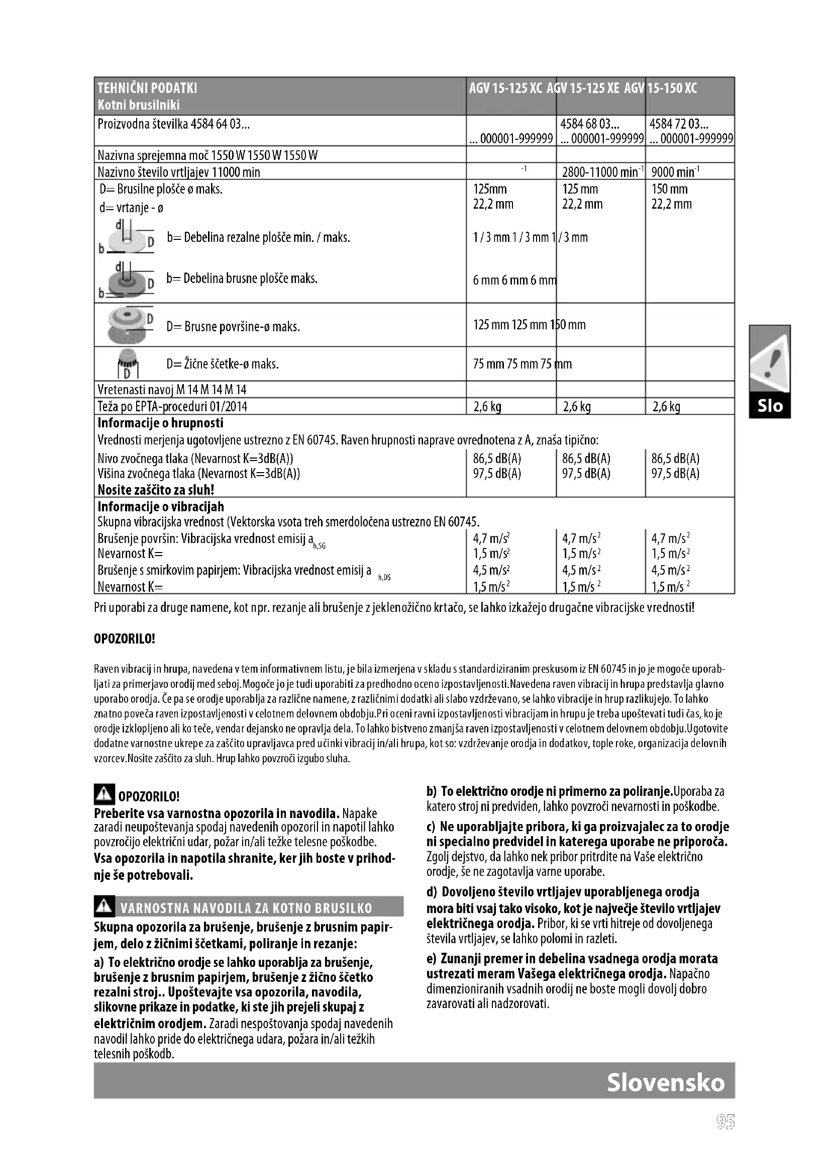 Pri uporabi za druge namene, kot npr. rezanje ali brušenje z jeklenožično krtačo, se lahko izkažejo drugačne vibracijske vrednosti! OPOZORILO! Raven vibracij in hrupa, navedena v tem informativnem listu, je bila izmerjena v skladu s standardiziranim preskusom iz EN 60745 in jo je mogoče uporab- ljati za primerjavo orodij med seboj.Mogoče jo je tudi uporabiti za predhodno oceno izpostavljenosti.Navedena raven vibracij in hrupa predstavlja glavno uporabo orodja. Če pa se orodje uporablja za različne namene, z različnimi dodatki ali slabo vzdrževano, se lahko vibracije in hrup razlikujejo. To lahko znatno poveča raven izpostavljenosti v celotnem delovnem obdobju.Pri oceni ravni izpostavljenosti vibracijam in hrupu je treba upoštevati tudi čas, ko je orodje izklopljeno ali ko teče, vendar dejansko ne opravlja dela. To lahko bistveno zmanjša raven izpostavljenosti v celotnem delovnem obdobju.Ugotovite dodatne varnostne ukrepe za zaščito upravljavca pred učinki vibracij in/ali hrupa, kot so: vzdrževanje orodja in dodatkov, tople roke, organizacija delovnih vzorcev.Nosite zaščito za sluh. Hrup lahko povzroči izgubo sluha.9696 Slo Slovensko f) Navoji delov pribora se morajo ujemati z navoji brusil- nih vreten. Pri prirobničnih delih pribora, se mora izvrtina vpenjalnega trna ujemati s premerom lokalizacijske pri- robnice. Deli pribora, ki ne pašejo na pritrdilni trn naprave, tečejo ekscentrično, vibrirajo s prekomerno močjo in lahko privedejo do izgube nadzora nad orodjem. g) Ne uporabljajte poškodovanih vsadnih orodij. Pred vsako uporabo preglejte brusilne kolute, če se ne luščijo oziroma če nimajo razpok, brusilne krožnike, če nimajo razpok oziro- ma če niso močno obrabljeni ali izrabljeni, žične ščetke pa, če nimajo zrahljanih ali odlomljenih žic. Če pade električno orodje ali vsadno orodje na tla, poglejte, če ni poškodovano in uporabljajte samo nepoškodovana vsadna orodja. Po kontroli in vstavljanju vsadnega orodja se ne zadržujte v ravnini vrtečega se vsadnega orodja, kar velja tudi za druge osebe v bližini. Električno orodje naj eno minuto deluje z najvišjim številom vrtljajev. Poškodovana vsadna orodja se največkrat zlomijo med tem preizkusnim časom. h) Uporabljajte osebno zaščitno opremo. Odvisno od vrste uporabe si nataknite zaščitno masko čez cel obraz, zaščito za oči ali zaščitna očala. Če je potrebno, nosite zaščitno masko proti prahu, zaščitne glušnike, zaščitne rokavice ali specialni predpasnik , ki Vas bo zavaroval pred manjšimi delci materiala, ki nastajajo pri brušenju. Oči je treba zava- rovati pred tujki, ki nastajajo pri različnih vrstah uporabe naprave in letijo naokrog. Zaščitna maska proti prahu ali dihalna maska morata ltrirati prah, ki nastaja pri uporabi. Predolgo izpostavljanje glasnemu hrupu ima lahko za posledico izgubo sluha.