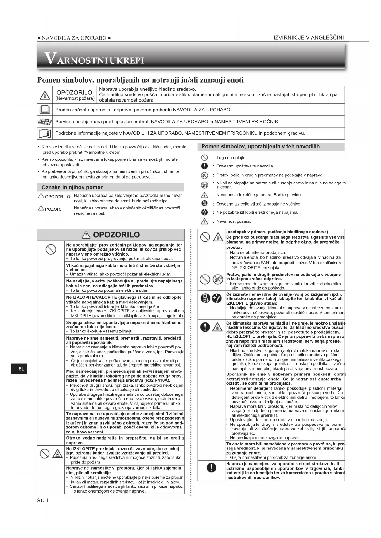 - Ker so v izdelku vrteči se deli in deli, ki lahko povzročijo električni udar, morate pred uporabo prebrati “Varnostne ukrepe”.• Ker so opozorila, ki so navedena tukaj, pomembna za varnost, jih morate obvezno upoštevati.• Ko preberete ta priročnik, ga skupaj z namestitvenim priročnikom shranite na lahko dosegljivem mestu za primer, da bi ga potrebovali. Oznake in njihov pomen OPOZORILO:Napačna uporaba bo zelo verjetno povzročila resno nevar-nost, ki lahko privede do smrti, hude poškodbe ipd. POZOR:Napačna uporaba lahko v določenih okoliščinah povzroči resno nevarnost. VARNOSTNI UKREPI Pomen simbolov, uporabljenih na notranji in/ali zunanji enoti OPOZORILO (Nevarnost požara)Naprava uporablja vnetljivo hladilno sredstvo.Če hladilno sredstvo pušča in pride v stik s plamenom ali grelnim telesom, začne nastajati strupen plin, hkrati pa obstaja nevarnost požara.Preden začnete uporabljati napravo, pozorno preberite NAVODILA ZA UPORABO.Servisno osebje mora pred uporabo prebrati NAVODILA ZA UPORABO in NAMESTITVENI PRIROČNIK.Podrobne informacije najdete v NAVODILIH ZA UPORABO, NAMESTITVENEM PRIROČNIKU in podobnem gradivu. OPOZORILO Ne uporabljajte provizoričnih priklopov na napajanje ter ne uporabljajte podaljškov ali razdelilnikov za priklop več naprav v eno omrežno vtičnico.• To lahko povzroči pregrevanje, požar ali električni udar.Vtikač napajalnega kabla mora biti čist in čvrsto vstavljen v vtičnico.• Umazan vtikač lahko povzroči požar ali električni udar.Ne navijajte, vlecite, poškodujte ali predelujte napajalnega kabla in nanj ne odlagajte težkih predmetov.• To lahko povzroči požar ali električni udar.Ne IZKLOPITE/VKLOPITE glavnega stikala in ne odklopite vtikača napajalnega kabla med delovanjem.• To lahko povzroči iskrenje, ki lahko zaneti požar. Ko notranjo enoto IZKLOPITE z daljinskim upravljalnikom, IZKLOPITE glavno stikalo ali odklopite vtikač napajalnega kabla. Svojega telesa ne izpostavljajte neposrednemu hladnemu zračnemu toku dlje časa.• To lahko škoduje vašemu zdravju.Naprave ne sme namestiti, premestiti, razstaviti, predelati ali popraviti uporabnik.• Nepravilno ravnanje s klimatsko napravo lahko povzroči po-žar, električni udar, poškodbo, puščanje vode, ipd. Posvetujte se s prodajalcem. Če je napajalni kabel poškodovan, ga mora proizvajalec ali po-oblaščeni serviser zamenjati, da prepreči morebitno nevarnost.Med nameščanjem, premeščanjem ali servisiranjem enote pazite, da v hladilni tokokrog ne pride nobena druga snov, razen navedenega hladilnega sredstva (R32/R410A).• Prisotnost drugih snovi, npr. zraka, lahko povzroči neobičajen dvig tlaka in privede do eksplozije ali poškodbe.• Uporaba drugega hladilnega sredstva od posebej določenega za ta sistem lahko povzroči mehansko okvaro, motnje delo-vanja sistema ali okvaro enote. V najhujšem primeru lahko to privede do resnega ogrožanja varnosti izdelka.Te naprave naj ne uporabljajo osebe z omejenimi fi zičnimi, zaznavnimi ali duševnimi zmožnostmi, osebe brez zadostnih izkušenj in znanja (vključno z otroci), razen če so pod nad-zorom oziroma jih o uporabi pouči oseba, ki je odgovorna za njihovo varnost.Otroke vedno nadzirajte in preprečite, da bi se igrali z napravo. Ne IZKLOPITE prekinjala, razen če zavohate, da se nekaj žge, oziroma kadar izvajate vzdrževanje ali pregled.• Puščanja hladilnega sredstva ni mogoče zaznati, zato lahko pride do požara.Naprave ne namestite v prostoru, kjer bi lahko zajemala dim, plin ali kemikalije. V bližini notranje enote ne uporabljajte plinske opreme za propan, butan ali metan, razpršilnih sredstev, kot je insekticid, in lakov.• Senzor hladilnega sredstva jih lahko zazna in prikaže napako. To lahko onemogoči delovanje naprave. (postopek v primeru puščanja hladilnega sredstva)Če pride do puščanja hladilnega sredstva, ugasnite vse vire plamena, na primer grelce, in odprite okno, da prezračite prostor.• Nato se obrnite na prodajalca.• Notranja enota bo hladilno sredstvo odvajala v načinu za prezračevanje (FAN), da prepreči požar. V teh okoliščinah NE IZKLOPITE prekinjala. Prstov, palic in drugih predmetov ne potiskajte v vstopne in izstopne zračne odprtine.• Ker se med delovanjem vgrajeni ventilator vrti z visoko hitro-stjo, lahko pride do poškodb. Če zaznate nenavadno delovanje (vonj po zažganem ipd.), klimatsko napravo takoj izklopite ter iztaknite vtikač ali IZKLOPITE glavno stikalo.• Nadaljnje delovanje klimatske naprave v neustreznem stanju lahko povzroči okvaro, požar ali električni udar. V tem primeru se obrnite na prodajalca. Če klimatska naprava ne hladi ali ne greje, je možno uhajanje hladilne tekočine. Če ugotovite, da hladilno sredstvo pušča, dobro prezračite prostor in se posvetujte s prodajalcem. NE IZKLOPITE prekinjala. Če je pri popravilu treba napravo znova napolniti s hladilnim sredstvom, serviserja prosite, naj vam razloži podrobnosti.• Hladilno sredstvo, ki ga uporablja klimatska naprava, ni ško-dljivo. Običajno ne pušča. Če pa hladilno sredstvo pušča in pride v stik s plamenom ali grelnim telesom ventilatorskega grelnika, kerozinskega grelnika ali plinskega gorilnika in začne nastajati strupen plin, hkrati pa obstaja nevarnost požara.Uporabnik ne sme v nobenem primeru poskusiti oprati notranjosti notranje enote. Če je notranjost enote treba očistiti, se obrnite na prodajalca.• Neprimeren detergent lahko poškoduje plastični material v notranjosti enote, kar lahko povzroči puščanje vode. Če detergent pride v stik z električnimi deli ali motorjem, to lahko povzroči okvaro, dimljenje ali požar.• Naprava mora biti v prostoru, kjer ni stalno delujočih virov vžiga (npr. odprtega plamena, naprave s plinskim gorilnikom ali električnega grelnika).• Upoštevajte, da hladilno sredstvo morda nima vonja.• Ne uporabljajte drugih sredstev za pospeševanje odmr-zovanja ali za čiščenje naprave kot tistih, ki j
