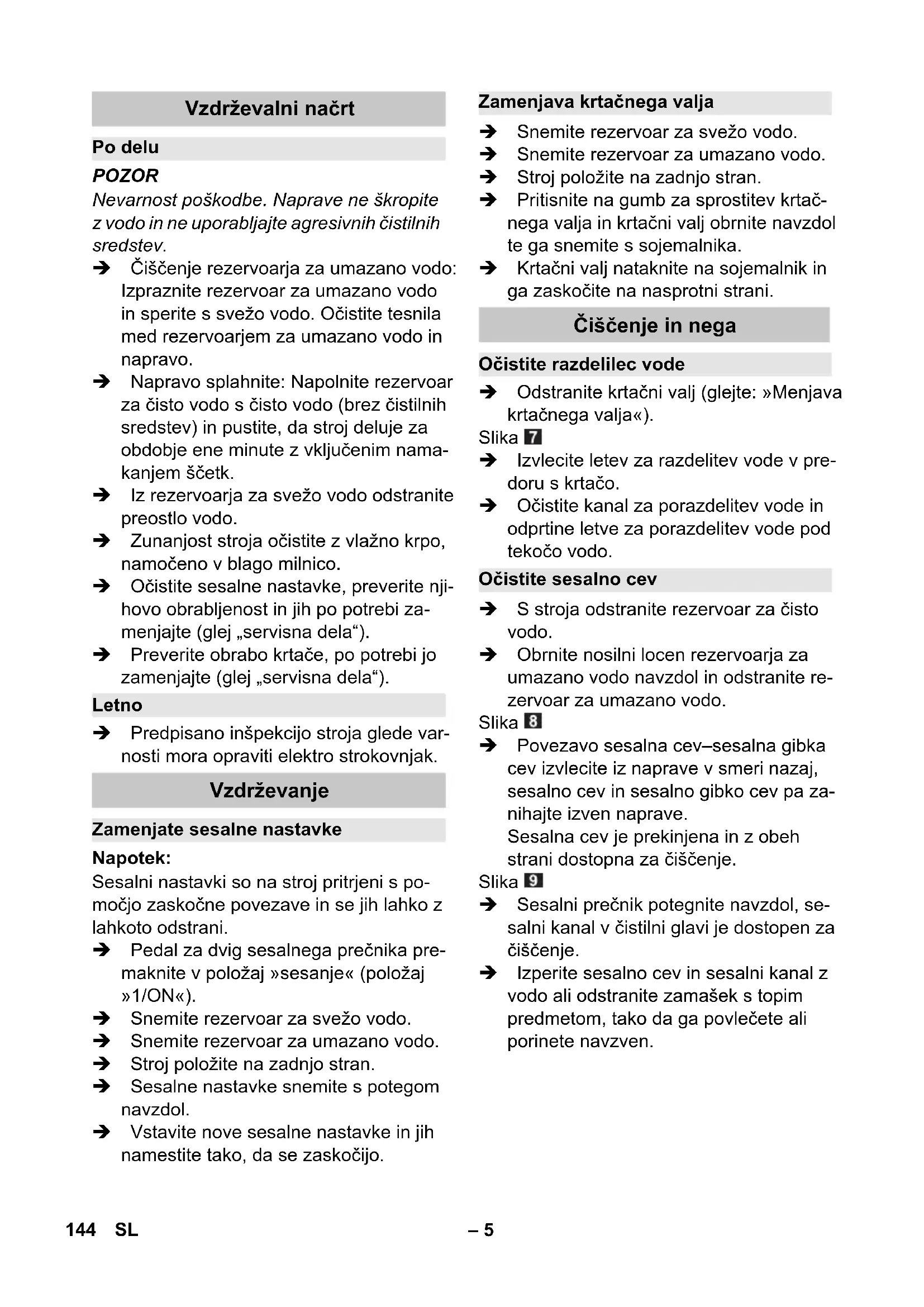 dB(A) 1 139CS– 1 Pred prvo uporabo Vaše napra- ve preberite to originalno navo- dilo za uporabo, ravnajte se po njem in shranite ga za morebitno kasnejšo uporabo ali za naslednjega lastnika. – Pred prvo uporabo naprave preberite in upoštevajte ta navodila za uporabo in priloženo brošuro Varnostni napotki za krtačne čistilne stroje 5.956-251.0. – Preberite in upoštevajte ločena navodi- la za uporabo s priloženimi varnostnimi navodili za priloženo akumulatorsko ba- terijo. – Preberite in upoštevajte ločena navodi- la za uporabo s priloženimi varnostnimi navodili za priloženi polnilnik. – Poleg opozoril v navodilu za obratova- nje se morajo upoštevati splošni varno- stni predpisi in predpisi zakonodajalca o preprečevanju nesreč. NEVARNOST Nevarnost poškodb! Pred vsakim negova- njem, vzdrževanjem in popravilom naprave odstranite akumulatorsko baterijo. NEVARNOST Opozorilo na neposredno nevarnost, ki vodi do težkih telesnih poškodb ali smrti. 몇 OPOZORILO Opozorilo na možno nevarno situacijo, ki lahko vodi do težkih telesnih poškodb ali smrti. 몇 PREVIDNOST Opozorilo na možno nevarno situacijo, ki lahko vodi do lažjih poškodb. POZOR Opozorilo na možno nevarno situacijo, ki lahko vodi do premoženjskih škod. Ta sesalni stroj za ribanje se uporablja za mokro čiščenje ravnih tal. Širina delovne površine, ki znaša 300 mm, ter kapaciteta vodnega rezervoarja za čisto in za umazano vodo, ki znaša za vsakega po 4 l, omogočata čiščenje manjših povšin. Napravo napaja akumulatorska baterija. Napotek: V skladu s posamezno čistilno nalogo se naprava lahko opremi z različnim priborom. Zaprosite za naš katalog ali pa nas obiščite na Internetu pod www.kaercher.com. Ta stroj uporabljajte izključno v skladu s po- datki v Navodilu za obratovanje. – Ta naprava je primerna za industrijsko uporabo, npr. v hotelih, šolah, bolnišni- cah, tovarnah, trgovinah, pisarnah in najemnih poslovalnicah. – Stroj se sme uporabljati le za čiščenje trdih površin, ki niso občutljive na vlago in sredstva za poliranje. Temperaturno območje uporabe se na- haja med +5°C in +40°C. – Stroj ni primeren za čiščenje zmrznjenih tal (npr. v hladilnicah). – Stroj se sme opremiti le z originalnim priborom in originalnimi nadomestnimi deli. – Stroj so razvili za čiščenje tal v zaprtih prostori oz. nadkritih površinah. Vsebinsko kazalo Vsebinsko kazalo . . . . . . . . . . SL 1 Varnostna navodila . . . . . . . . . SL 1 Delovanje . . . . . . . . . . . . . . . . SL 1 Namenska uporaba. . . . . . . . . SL 1 Varstvo okolja . . . . . . . . . . . . . SL 2 Upravljalni elementi. . . . . . . . . SL 2 Prvi zagon . . . . . . . . . . . . . . . . SL 2 Obratovanje . . . . . . . . . . . . . . SL 3 Transport. . . . . . . . . . . . . . . . . SL 4 Skladiščenje . . . . . . . . . . . . . . SL 4 Vzdrževanje . . . . . . . . . . . . . . SL 4 Motnje . . . . . . . . . . . . . . . . . . . SL 6 Pribor in nadomestni deli . . . . SL 7 Izjava EU o skladnosti. . . . . . . SL 8 Tehnični podatki . . . . . . . . . . . SL 8 Varnostna navodila Stopnje nevarnosti Delovanje Namenska uporaba 140 SL– 2 – Stroj ni namenjen za čiščenje javnih prometnih površin. – Stroj ni primeren za uporabo v eksplo- zivno ogroženem okolju. Opozorila k sestavinam (REACH) Aktualne informacije o sestavinah najdete na: www.kaercher.com/REACH Za slike glejte stran ovitka Slika 1 Ročaj 2 Stikalo vodne črpalke 3 Tipka za krtačenje/sesanje 4 Nosilni ročaj 5 Nosilni locen rezervoarja za umazano vodo 6 Rezervoar za umazano vodo 7 Rezervoar za svežo vodo 8 Zapiralo rezervoarja za svežo vodo (polnilna odprtina) 9 Akumulatorska baterija 10 Držalo akumulatorske baterije 11 Čistilna glava 12 Pedal za znižanje sesalnega nosilca 13 Sprostitev zablokiranega položaja 14 Prikaz akumulatorske baterije Glejte tudi navodila za uporabo akumu- latorske baterije 15 Deblokada akumulatorske baterije 16 Deblokirni gumb, nadomestna krtača 17 Krtačni valj 18 Sesalni nosilec 19 Pokrov rezervoarja za umazano vodo 20 Zapiralo pokrova rezervoarja za uma- zano vodo 21 Prikaz nivoja polnjenja 22 Indikator napolnjenosti akumulatorske baterije 3 LED-lučke svetijo: 100–76 % preosta- le kapacitete 2 LED-lučki svetita: 75–51 % preostale kapacitete 1 LED-lučka sveti: 50–26 % preostale kapacitete 1 LED-lučka utripa: Napolnite akumula- torsko baterijo pod manj kot 26% preo- stale kapacitete 23 Povezava sesalna cev–sesalna gibka cev 24 Sesalna cev 25 Gibka sesalna cev Slika Cev na koncu ročaja vtaknite v odprtino stroja. Pritisnite zaskočko in porinite ročaj v stroj vse dokler se ne zaskoči. Poravnajte kabel v stroju in namestite pokrov, kot prikazano v priloženem li- stu. Napolnite akumulatorsko baterijo. Opis tega najdete v ločenih navodilih za uporabo akumulatorske baterije in pol- nilnika Varstvo okolja Embalaža je primerna za recikli- ranje. Prosimo, da embalaže ne odvržete med gospodinjske od- padke, temveč jo odložite v zbi- ralnik za ponovno obdelavo. Stare naprave vsebujejo drago- cene reciklirne materiale, ki jih je treba odvajati za ponovno upora- bo. Baterije in akumulatorske ba- terije vsebujejo snovi, ki ne smejo priti v okolje. Zato stare naprave, baterije in akumulatorske baterije zavrzite v ustrezne zbiralne siste- me. Električne in elektronske naprave imajo pogosto sestavne dele, ki pri nepravilnem ravnanju ali od- stranjevanju med odpadke lahko predstavljajo nevarnost za zdrav- je ljudi in okolje. Ti sestavni deli so kljub temu pomembni za pra- vilno delovanje naprav. Naprav, označenih s tem simbolom, ne smete odvreči med gospodinjske odpadke. Upravljalni elementi Prvi zagon 141SL– 3 Slika Napolnjeno akumulatorsko baterijo vstavite v držalo akumulatorske baterije in jo potisnite do konca, da zaskoči. 몇 PREVIDNOST Nevarnost poškodbe. Uporabljajte le pripo- ročljiva čistilna sredstva. Za druga čistilna sredstva uporabnik nosi povečano tvega- nje glede varnosti obratovanja in nevar