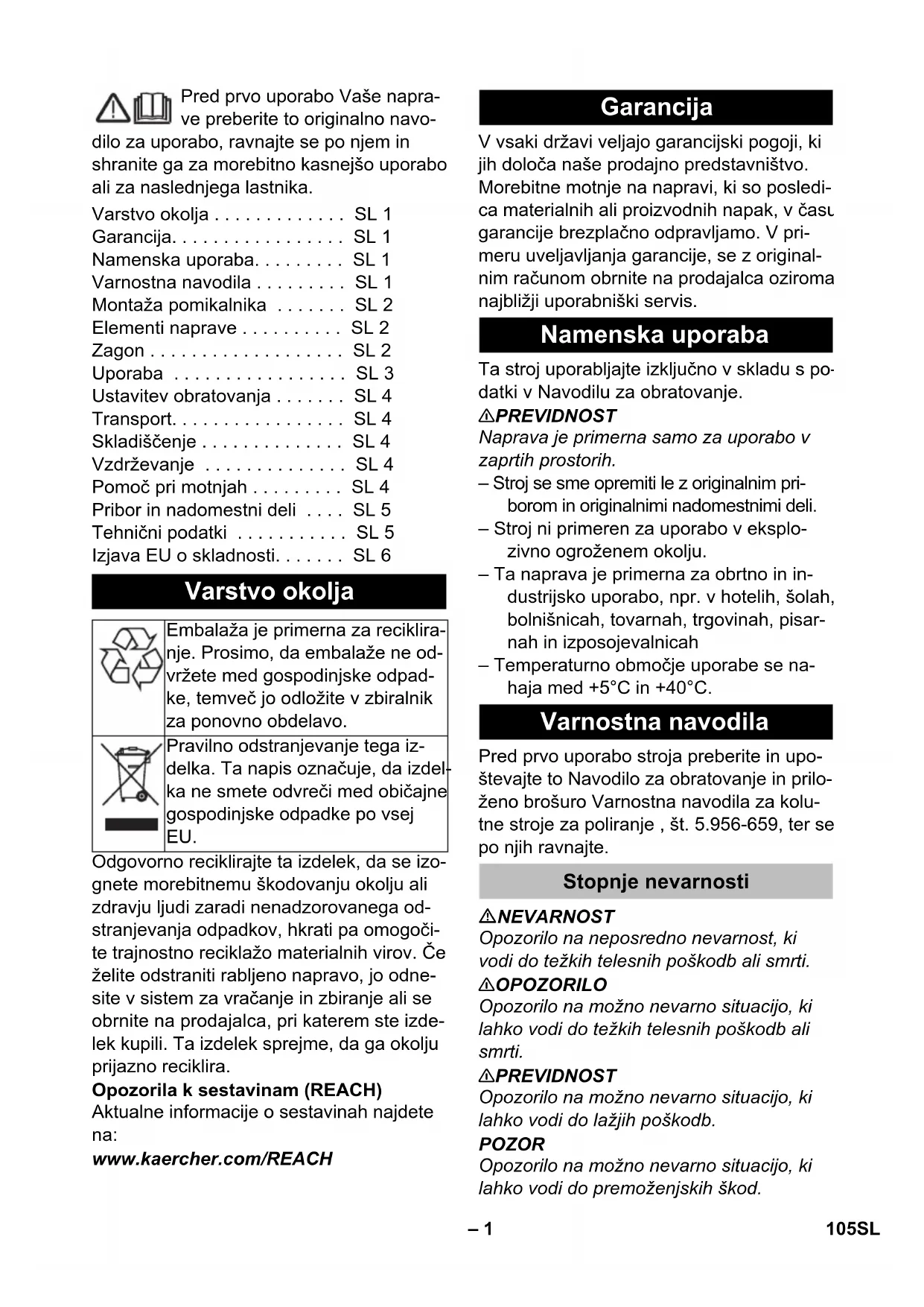 Chairman of the Board of Management Director Regulatory Affairs & Certification 104 CS– 1 Pred prvo uporabo Vaše napra- ve preberite to originalno navo- dilo za uporabo, ravnajte se po njem in shranite ga za morebitno kasnejšo uporabo ali za naslednjega lastnika. Odgovorno reciklirajte ta izdelek, da se izo- gnete morebitnemu škodovanju okolju ali zdravju ljudi zaradi nenadzorovanega od- stranjevanja odpadkov, hkrati pa omogoči- te trajnostno reciklažo materialnih virov. Če želite odstraniti rabljeno napravo, jo odne- site v sistem za vračanje in zbiranje ali se obrnite na prodajalca, pri katerem ste izde- lek kupili. Ta izdelek sprejme, da ga okolju prijazno reciklira. Opozorila k sestavinam (REACH) Aktualne informacije o sestavinah najdete na: www.kaercher.com/REACH V vsaki državi veljajo garancijski pogoji, ki jih določa naše prodajno predstavništvo. Morebitne motnje na napravi, ki so posledi- ca materialnih ali proizvodnih napak, v času garancije brezplačno odpravljamo. V pri- meru uveljavljanja garancije, se z original- nim računom obrnite na prodajalca oziroma najbližji uporabniški servis. Ta stroj uporabljajte izključno v skladu s po- datki v Navodilu za obratovanje. 몇 PREVIDNOST Naprava je primerna samo za uporabo v zaprtih prostorih. – Stroj se sme opremiti le z originalnim pri- borom in originalnimi nadomestnimi deli. – Stroj ni primeren za uporabo v eksplo- zivno ogroženem okolju. – Ta naprava je primerna za obrtno in in- dustrijsko uporabo, npr. v hotelih, šolah, bolnišnicah, tovarnah, trgovinah, pisar- nah in izposojevalnicah – Temperaturno območje uporabe se na- haja med +5°C in +40°C. Pred prvo uporabo stroja preberite in upo- števajte to Navodilo za obratovanje in prilo- ženo brošuro Varnostna navodila za kolu- tne stroje za poliranje , št. 5.956-659, ter se po njih ravnajte. NEVARNOST Opozorilo na neposredno nevarnost, ki vodi do težkih telesnih poškodb ali smrti. 몇 OPOZORILO Opozorilo na možno nevarno situacijo, ki lahko vodi do težkih telesnih poškodb ali smrti. 몇 PREVIDNOST Opozorilo na možno nevarno situacijo, ki lahko vodi do lažjih poškodb. POZOR Opozorilo na možno nevarno situacijo, ki lahko vodi do premoženjskih škod. Varstvo okolja . . . . . . . . . . . . . SL 1 Garancija. . . . . . . . . . . . . . . . . SL 1 Namenska uporaba. . . . . . . . . SL 1 Varnostna navodila . . . . . . . . . SL 1 Montaža pomikalnika . . . . . . . SL 2 Elementi naprave . . . . . . . . . . SL 2 Zagon . . . . . . . . . . . . . . . . . . . SL 2 Uporaba . . . . . . . . . . . . . . . . . SL 3 Ustavitev obratovanja . . . . . . . SL 4 Transport. . . . . . . . . . . . . . . . . SL 4 Skladiščenje . . . . . . . . . . . . . . SL 4 Vzdrževanje . . . . . . . . . . . . . . SL 4 Pomoč pri motnjah . . . . . . . . . SL 4 Pribor in nadomestni deli . . . . SL 5 Tehnični podatki . . . . . . . . . . . SL 5 Izjava EU o skladnosti. . . . . . . SL 6 Varstvo okolja Embalaža je primerna za reciklira- nje. Prosimo, da embalaže ne od- vržete med gospodinjske odpad- ke, temveč jo odložite v zbiralnik za ponovno obdelavo. Pravilno odstranjevanje tega iz- delka. Ta napis označuje, da izdel- ka ne smete odvreči med običajne gospodinjske odpadke po vsej EU. Garancija Namenska uporaba Varnostna navodila Stopnje nevarnosti 105SL– 2 Varnostne naprave ščitijo uporabnika, zato se jih ne sme izključiti ali ovirati njihovega delovanja. Preprečuje nenamerni vklop naprave. Za vklop naprave pritisnite gumb za sprostitev in nato stikalo za vklop/izklop. Pred zagonom je treba montirati pomikalnik kot prikazano in vzpostaviti električno po- vezavo z napravo. Za sliko glejte stran ovitka Na sliki naprave je prikazana naprava BDS 43/150 C Classic. Naprava BDS 43/Duo C se nekoliko razlikuje od prikazane naprave. 1 Sojemalnik, kolutna krtača / pogonska plošča blazinice 2 Pogonska plošča krtače/blazinice 3 Dozirna ročica za raztopino čistila (opci- ja) 4 Stikalo VKLOP / IZKLOP 5 Kljuka za kabel 6 Tipka za deblokado 7Ročaj 8 Ročica za nastavitev naklona 9 Varovalka za krtačni pogon 10 Vtičnica za pribor 11 Rezervoar za čistilno sredstvo (Opcija) 12 Ohišje motorja 13 Stikalo za število vrtljajev krtač (samo BDS 43/Duo C) ** ni v obsegu dobave Omrežni priključni vodnik redno pregle- dujte glede poškodb, kot npr. nastajanje razpok ali staranje. Če se ugotovi po- škodba, je potrebno vodnik pred nadalj- njo uporabo zamenjati. Napravo preglejte glede poškodb, ško- de naj odstrani uporabniški servis. – Priključne vrednosti glejte v Tehničnih podatkih in na tipski tablici. – Električni priključek mora izvesti elek- troinstalater in mora ustrezati IEC 60364-1. NEVARNOST Nevarnost zaradi električnega udara. – Ne prevozite omrežnega kabla. NEVARNOST Nevarnost poškodbe! – Omrežnega kabla nikoli ne polagajte okoli telesa ali vratu. – Omrežni kabel ne sme priti v stik z vrte- čimi se krtačami/vrtečimi se blazinica- mi. Napotek: Izberite primeren pribor za čiščenje. Izvlecite omrežni vtič iz vtičnice. Potegnite ročico za nastavitev naklona. Ročaj zavrtite naprej v navpični položaj. Spustite ročico za nastavitev naklona. Stroj nagnite nazaj. Varnostne naprave Zapah Montaža pomikalnika Elementi naprave
