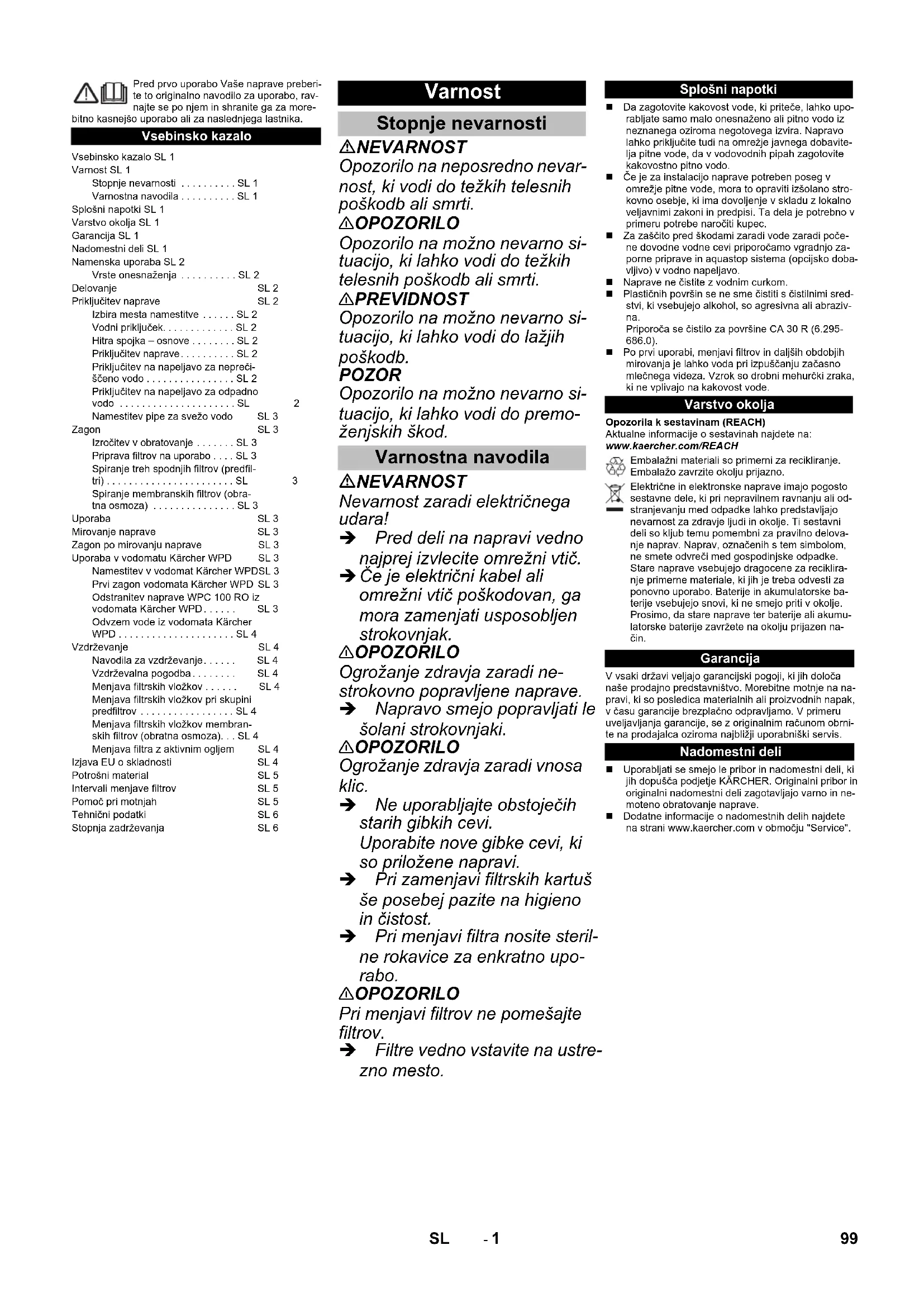 Chairman of the Board of ManagementDirector Regulatory Affairs & Certification 96 CS- 5 Spotřební materiál Označení Popis Objednací č. Jemný filtr První filtrační stupeň pro separaci hrubých částic nečistot 6 640-765.0 Filtr s aktivním uhlím (granulát) Druhý filtrační stupeň pro separaci škodlivých látek 6 640-766.0 Filtr s aktivním uhlím (blok) Třetí filtrační stupeň pro jemnou separaci škodlivých látek 6 640-767.0 membránovým filtrem (reverzní osmó- za) Čtvrtý filtrační stupeň pro demineralizaci 6 640-783.0 Horní filtr s aktivním uhlím Pátý filtrační stupeň pro zajištění neutrální chuti po reverzní osmóze 6 640-769.0 Interval výměny filtrů Jemný filtr 3 - 6 Počet měsíců nebo v případě potřeby (viz kapitola: „Pomoc při poruchách“) filtrem s aktivním uhlím (granulát) 6 - 12 filtrem s aktivním uhlím (blok) 6 - 12 membránovým filtrem (reverzní osmóza) 18 - 24 Filtr s aktivním uhlím 6 - 12 Pomoc při poruchách Porucha Možná příčina Odstranění Neprobíhá výdej vody Nezasunujte síťovou zástrčku do zásuvky. Zasuňte sít'ovou zástrčku do zásuvky. Neprobíhá zásobování vodou Zajistěte zásobování vodou Tlakový spínač na přístroji je vadný Kontaktujte servisní službu. Vadný magnetický ventil Kontaktujte servisní službu. Výdej vody v malém množství Čerpadlo neběží Zkontrolujte čerpadlo. Obtokový ventil je otevřen Zavřete obtokový ventil. Jemný filtr je ucpaný. Vyměňte jemný filtr. Membránový filtr (reverzní osmóza) je ucpaný. Vyměňte membránový filtr (reverzní osmóza). Čerpadlo se nezastavuje Tlakový spínač na výstupu přístroje je vadný. Kontaktujte servisní službu. Čerpadlo se nespustí. Tlakový spínač na výstupu přístroje je vadný. Kontaktujte servisní službu. Jemný filtr je ucpaný. Vyměňte jemný filtr. Vadný tlakový spínač na vstupu. Kontaktujte servisní službu. Neprobíhá zásobování vodou Kontrola zásobování vodou. Nezasunujte síťovou zástrčku do zásuvky. Zasuňte sít'ovou zástrčku do zásuvky. Vadné čerpadlo. Kontaktujte servisní službu. Výtok vody z tělesa filtru Těleso filtru není utažené. Pevně utáhněte těleso filtru. Těsnicí kroužek tělesa filtru sklouzl nebo je vadný Zkontrolujte těsnicí kroužek, správně jej na- saďte a při poškození vyměňte. Voda vytéká pouze z rozvodu odpadní vody Obtokový ventil je otevřený. Zavřete obtokový ventil. Membránový filtr (reverzní osmóza) je ucpaný. Vyměňte membránový filtr (reverzní osmóza). Vadné čerpadlo. Nápadně změněná chuť pitné vody Horní filtr s aktivním uhlím je spotřebován. Vyměňte horní filtr s aktivním uhlím. Čerpadlo se zastaví a po krátké době se opět spustí. Netěsnost / ztráta vody / ztráta tlaku v přístroji nebo v při- pojeným potrubním systému. Pevně utáhněte těleso filtru. Pevně uzavřete vodovodní kohoutek. Zjistěte a odstraňte příčinu netěsnosti. Vadný zpětný ventil v přístroji Kontaktujte servisní službu. 97CS- 6 Technické údaje WPC 100 RO provozní napětí V/~/Hz 110...240/1/50-60 Příkon W80 Minimální síťové jištění A6 Tlak přívodu vody MPa (baru) 0,1...0,3 (1...3) teplota přívodu vody °C 5...45 Výkon filtru l/h 70 Filtrační výkon (max.) l/h 100 Teplota prostředí °C 5...45 Šířka mm 372 Hloubka mm 240 Výška mm 530 Hmotnost (prázdného zařízení) kg 13,45 Hmotnost, pohotovostní stav (při naplnění vodou a s příslušenstvím) kg 17,86 Hladina hluku při běžném provozu dB(A) < 60 materiály / technická schválení Všechny komponenty, které jsou v kontaktu s pitnou vodou, jsou vhodné k použití k přímému kontaktu s pitnou vodou na základě všeobecných uznávaných technických předpisů. Stupeň separace Stupeň separace chemických škodlivin, biologických choroboplodných zárodků a znečištění je možné určit podle tabulky níže (přibližné hodnoty). Účinnost separace závisí na stupni znečištění! Bakterie Stupeň separace až 99,99 % Chlór Stupeň separace až 100 % Sole (sodík, draslík, kalcium...) Stupeň separace až 90 % hliník Stupeň separace až 98 % arsen Stupeň separace až 88 % Těžké kovy (například: olovo) Stupeň separace až 99 % dusičnan Stupeň separace až 50 % herbicidy (glyfosát) Stupeň separace až 60 % Zbytky léčivých přípravků Stupeň separace až 99,9 % zbytky hormonů Stupeň separace až 99,95 % Zabarvení Stupeň separace až 100 % 98 CS- 1 Pred prvo uporabo Vaše naprave preberi-te to originalno navodilo za uporabo, rav-najte se po njem in shranite ga za more-bitno kasnejšo uporabo ali za naslednjega lastnika. NEVARNOST Opozorilo na neposredno nevar- nost, ki vodi do težkih telesnih poškodb ali smrti. 몇 OPOZORILO Opozorilo na možno nevarno si- tuacijo, ki lahko vodi do težkih telesnih poškodb ali smrti. 몇 PREVIDNOST Opozorilo na možno nevarno si- tuacijo, ki lahko vodi do lažjih poškodb. POZOR Opozorilo na možno nevarno si- tuacijo, ki lahko vodi do premo- ženjskih škod. NEVARNOST Nevarnost zaradi električnega udara! Pred deli na napravi vedno najprej izvlecite omrežni vtič. Če je električni kabel ali omrežni vtič poškodovan, ga mora zamenjati usposobljen strokovnjak. 몇 OPOZORILO Ogrožanje zdravja zaradi ne- strokovno popravljene naprave. Napravo smejo popravljati le šolani strokovnjaki. 몇 OPOZORILO Ogrožanje zdravja zaradi vnosa klic. Ne uporabljajte obstoječih starih gibkih cevi. Uporabite nove gibke cevi, ki so priložene napravi. Pri zamenjavi filtrskih kartuš še posebej pazite na higieno in čistost. Pri menjavi filtra nosite steril- ne rokavice za enkratno upo- rabo. 몇 OPOZORILO Pri menjavi filtrov ne pomešajte filtrov. Filtre vedno vstavite na ustre- zno mesto. Da zagotovite kakovost vode, ki priteče, lahko upo-rabljate samo malo onesnaženo ali pitno vodo iz neznanega oziroma ne