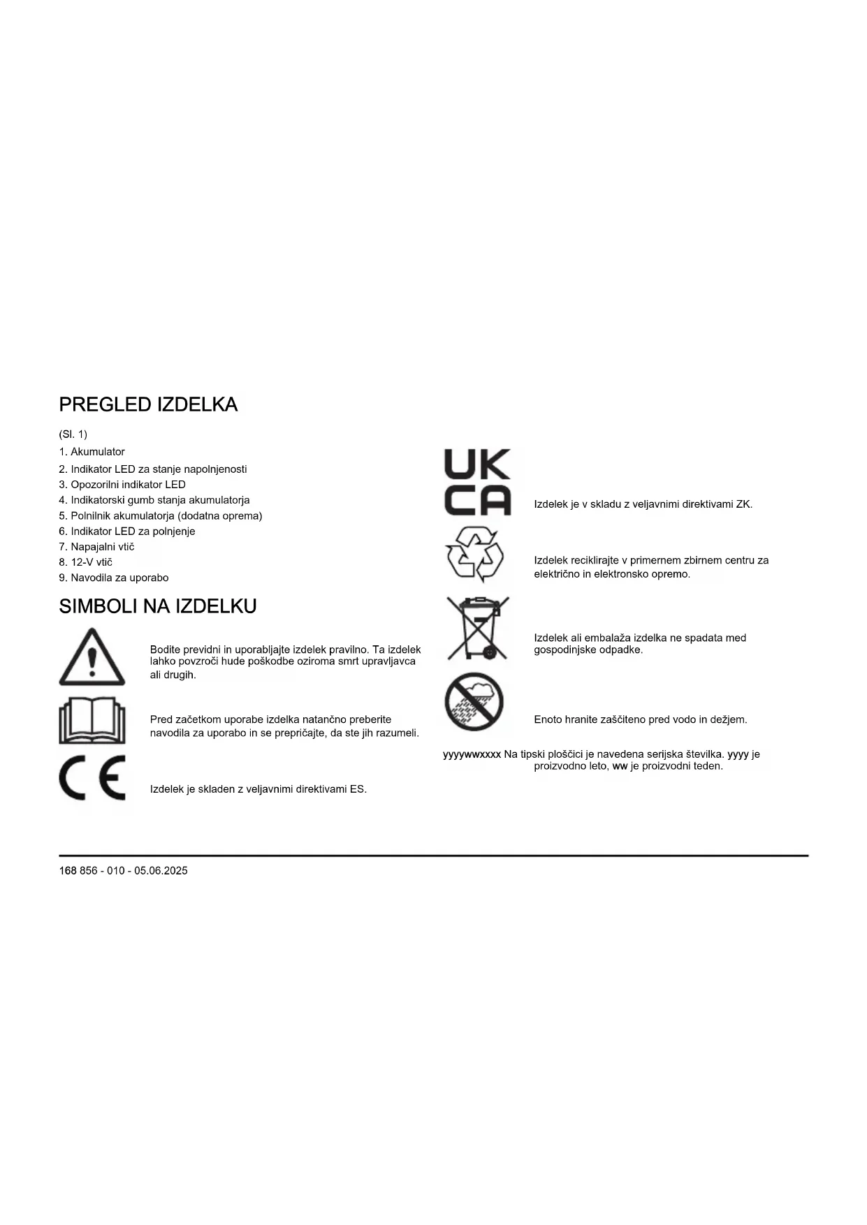 Bodite previdni in uporabljajte izdelek pravilno. Ta izdelek lahko povzroči hude poškodbe oziroma smrt upravljavca ali drugih. Pred začetkom uporabe izdelka natančno preberite navodila za uporabo in se prepričajte, da ste jih razumeli. Izdelek je skladen z veljavnimi direktivami ES. Izdelek je v skladu z veljavnimi direktivami ZK. Izdelek reciklirajte v primernem zbirnem centru za električno in elektronsko opremo. Izdelek ali embalaža izdelka ne spadata med gospodinjske odpadke. Enoto hranite zaščiteno pred vodo in dežjem. yyyywwxxxx Na tipski ploščici je navedena serijska številka. yyyy je proizvodno leto, ww je proizvodni teden. 168 856 - 010 - 05.06.2025Opomba: Ostali znaki in oznake na izdelku se nanašajo na zahteve za certifikacijo, ki veljajo za druga komercialna območja. Škoda izdelka Za škodo na izdelku ne odgovarjamo, če: