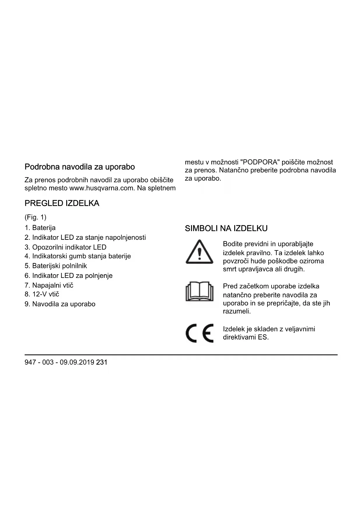 spada med gospodinjske odpadke. Treba ga je reciklirati v primernem zbirnem centru za električno in elektronsko opremo. Enoto hranite zaščiteno pred vodo in dežjem. Baterijski polnilnik hranite in uporabljajte samo v zaprtih prostorih. Opomba: Ostali znaki in oznake na izdelku se nanašajo na zahteve za certifikacijo, ki veljajo za druga komercialna območja. VARNOSTNE DEFINICIJE Opozorila, svarila in opombe opozarjajo na posebej pomembne dele priročnika. OPOZORILO: Se uporabi, če obstaja nevarnost telesne poškodbe ali smrti uporabnika ali opazovalcev ob neupoštevanju navodil v tem priročniku. POZOR: Se uporabi, če obstaja nevarnost poškodbe izdelka, drugih 232 947 - 003 - 09.09.2019materialov ali okolice ob neupoštevanju navodil v tem priročniku. Opomba: Se uporabi za podajanje podrobnejših informacij, potrebnih v dani situaciji. POMEMBNA VARNOSTNA NAVODILA OPOZORILO: Preberite vsa varnostna opozorila in navodila. Neupoštevanje opozoril in navodil lahko povzroči električni udar, požar in/ali resno poškodbo. Opomba: Shranite vsa opozorila in navodila.