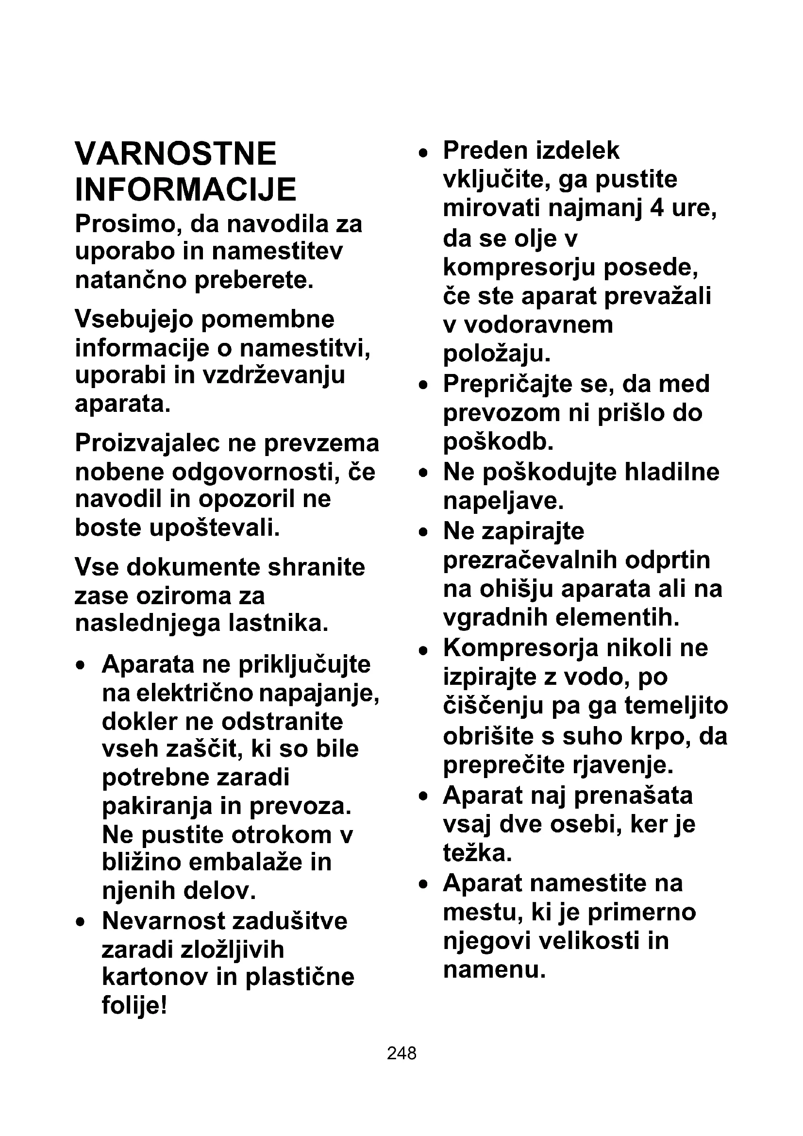 VARNOSTNE INFORMACIJE Prosimo, da navodila za uporabo in namestitev natančno preberete. Vsebujejo pomembne informacije o namestitvi, uporabi in vzdrževanju aparata. Proizvajalec ne prevzema nobene odgovornosti, če navodil in opozoril ne boste upoštevali. Vse dokumente shranite zase oziroma za naslednjega lastnika.