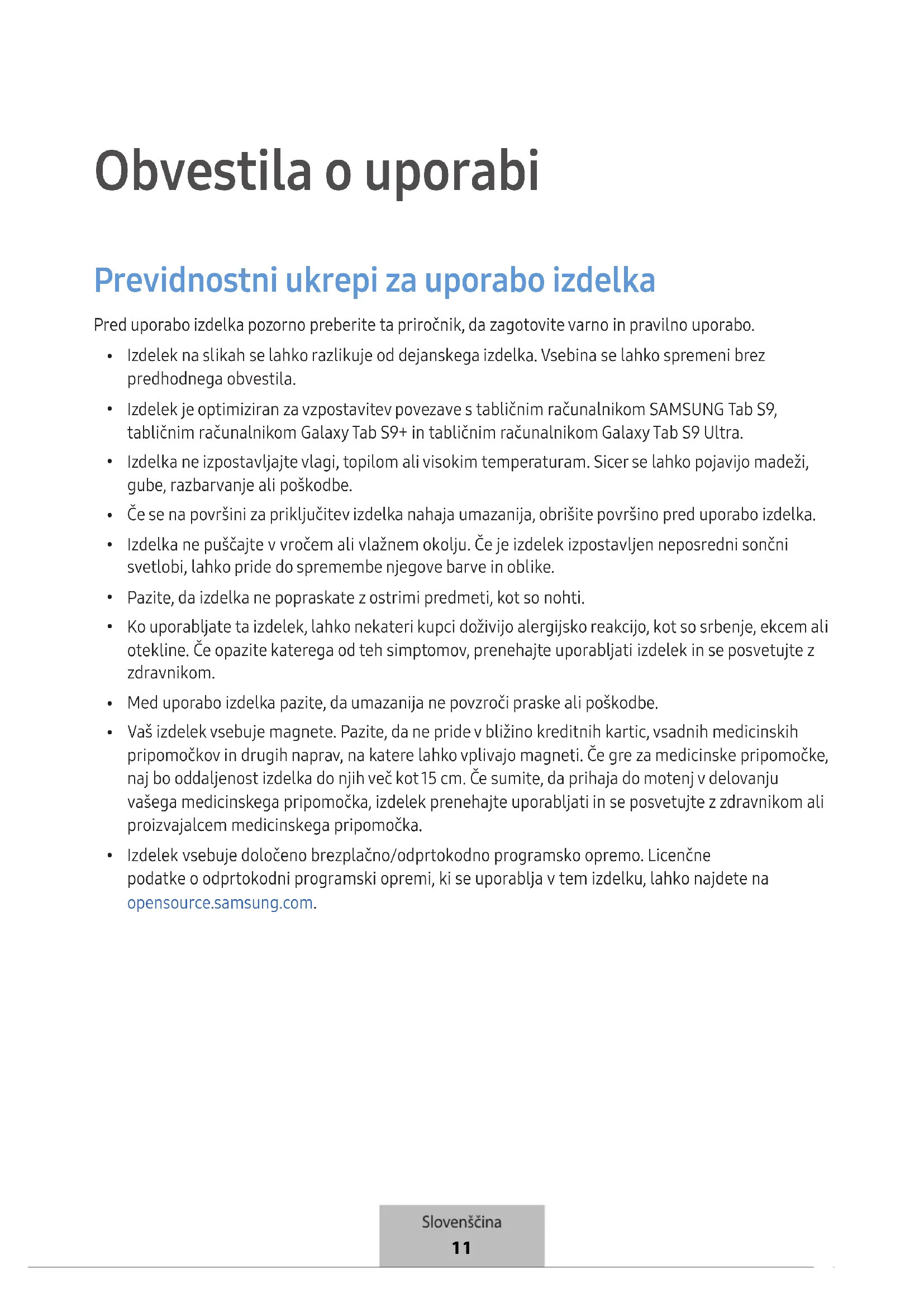 Izdelek vsebuje določeno brezplačno/odprtokodno programsko opremo. Licenčne podatke o odprtokodni programski opremi, ki se uporablja v tem izdelku, lahko najdete na opensource.samsung.com. Slovenščina 11Obvestila o uporabi