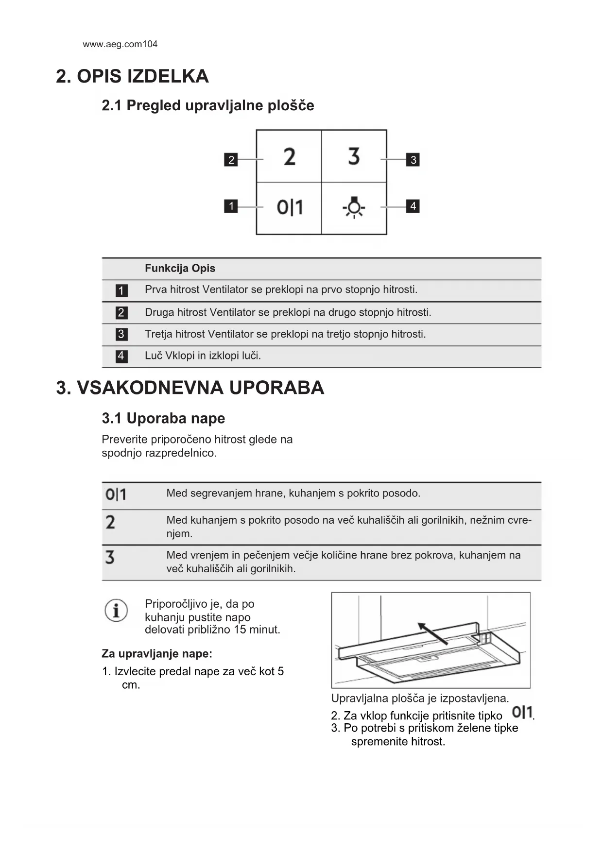 Preverite priporočeno hitrost glede na spodnjo razpredelnico. Med segrevanjem hrane, kuhanjem s pokrito posodo. Med kuhanjem s pokrito posodo na več kuhališčih ali gorilnikih, nežnim cvre‐ njem. Med vrenjem in pečenjem večje količine hrane brez pokrova, kuhanjem na več kuhališčih ali gorilnikih. Priporočljivo je, da po kuhanju pustite napo delovati približno 15 minut. Za upravljanje nape: