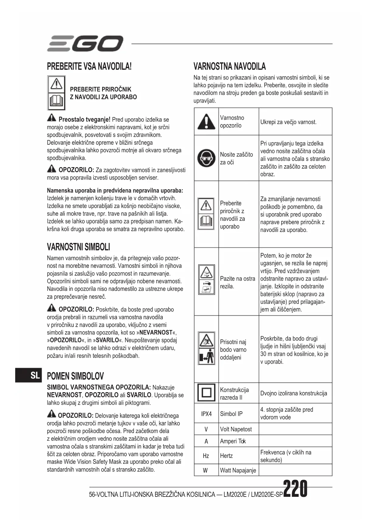 Preostalo tveganje! Pred uporabo izdelka se morajo osebe z elektronskimi napravami, kot je srčni spodbujevalnik, posvetovati s svojim zdravnikom. Delovanje električne opreme v bližini srčnega spodbujevalnika lahko povzroči motnje ali okvaro srčnega spodbujevalnika. OPOZORILO: Za zagotovitev varnosti in zanesljivosti mora vsa popravila izvesti usposobljen serviser. Namenska uporaba in predvidena nepravilna uporaba: Izdelek je namenjen košenju trave le v domačih vrtovih. Izdelka ne smete uporabljati za košnjo neobičajno visoke, suhe ali mokre trave, npr. trave na pašnikih ali listja. Izdelek se lahko uporablja samo za predpisan namen. Ka- kršna koli druga uporaba se smatra za nepravilno uporabo. VARNOSTNI SIMBOLI Namen varnostnih simbolov je, da pritegnejo vašo pozor- nost na morebitne nevarnosti. Varnostni simboli in njihova pojasnila si zaslužijo vašo pozornost in razumevanje. Opozorilni simboli sami ne odpravljajo nobene nevarnosti. Navodila in opozorila niso nadomestilo za ustrezne ukrepe za preprečevanje nesreč. OPOZORILO: Poskrbite, da boste pred uporabo orodja prebrali in razumeli vsa varnostna navodila v priročniku z navodili za uporabo, vključno z vsemi simboli za varnostna opozorila, kot so »NEVARNOST«, »OPOZORILO«, in »SVARILO«. Neupoštevanje spodaj navedenih navodil se lahko odrazi v električnem udaru, požaru in/ali resnih telesnih poškodbah. POMEN SIMBOLOV SIMBOL VARNOSTNEGA OPOZORILA: Nakazuje NEVARNOST, OPOZORILO ali SVARILO. Uporablja se lahko skupaj z drugimi simboli ali piktogrami. OPOZORILO: Delovanje katerega koli električnega orodja lahko povzroči metanje tujkov v vaše oči, kar lahko povzroči resne poškodbe očesa. Pred začetkom dela z električnim orodjem vedno nosite zaščitna očala ali varnostna očala s stranskimi zaščitami in kadar je treba tudi ščit za celoten obraz. Priporočamo vam uporabo varnostne maske Wide Vision Safety Mask za uporabo preko očal ali standardnih varnostnih očal s stransko zaščito. VARNOSTNA NAVODILA Na tej strani so prikazani in opisani varnostni simboli, ki se lahko pojavijo na tem izdelku. Preberite, osvojite in sledite navodilom na stroju preden ga boste poskušali sestaviti in upravljati. Varnostno opozorilo Ukrepi za večjo varnost. Nosite zaščito za oči Pri upravljanju tega izdelka vedno nosite zaščitna očala ali varnostna očala s stransko zaščito in zaščito za celoten obraz. Preberite priročnik z navodili za uporabo Za zmanjšanje nevarnosti poškodb je pomembno, da si uporabnik pred uporabo naprave prebere priročnik z navodili za uporabo. Pazite na ostra rezila. Potem, ko je motor že ugasnjen, se rezila še naprej vrtijo. Pred vzdrževanjem odstranite napravo za ustavl- janje. Izklopite in odstranite baterijski sklop (napravo za ustavljanje) pred prilagajan- jem ali čiščenjem. Prisotni naj bodo varno oddaljeni Poskrbite, da bodo drugi ljudje in hišni ljubljenčki vsaj 30 m stran od kosilnice, ko je v uporabi. Konstrukcija razreda II Dvojno izolirana konstrukcija IPX4 Simbol IP