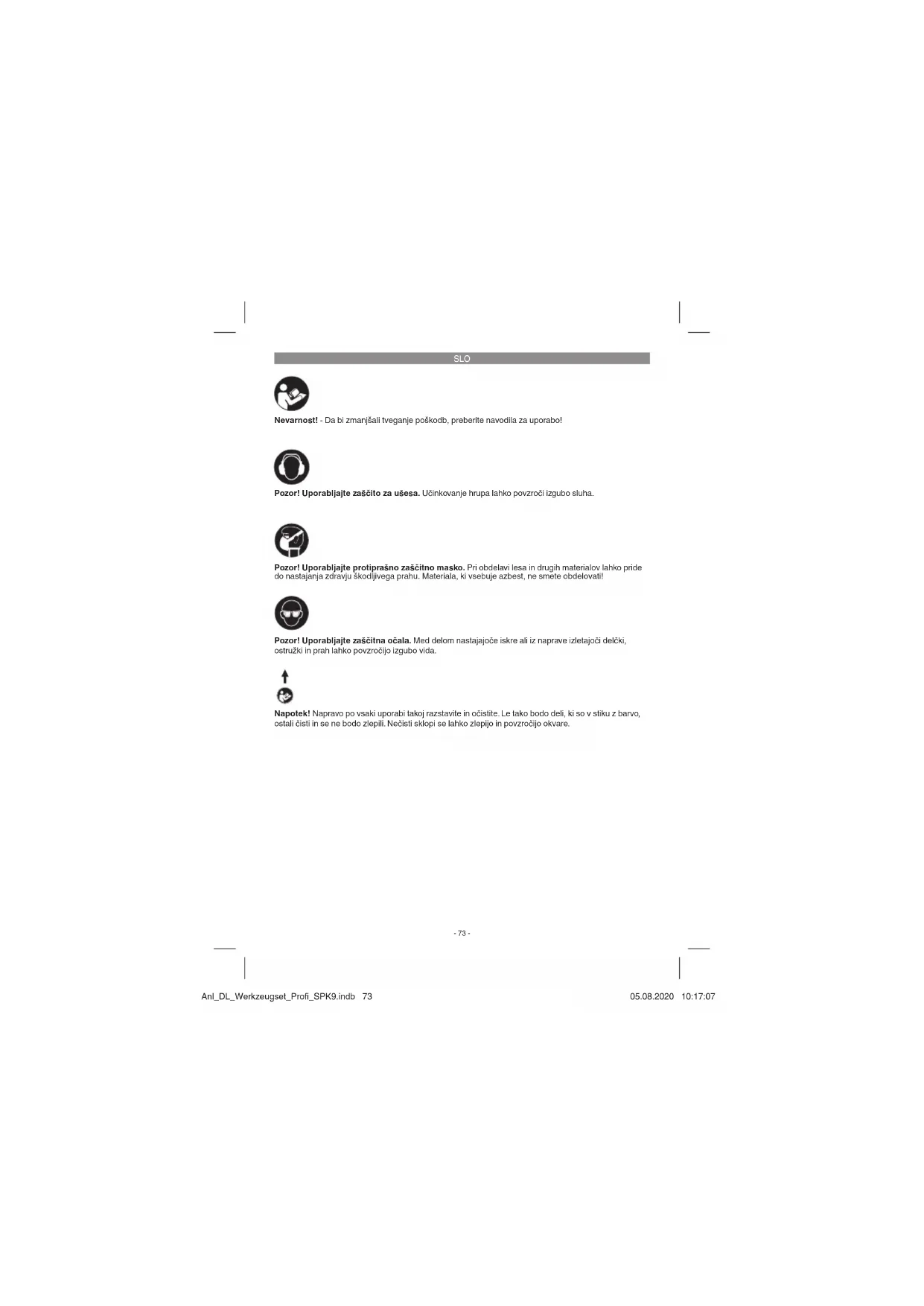 Nevarnost! - Da bi zmanjšali tveganje poškodb, preberite navodila za uporabo! Pozor! Uporabljajte zaščito za ušesa. Učinkovanje hrupa lahko povzroči izgubo sluha. Pozor! Uporabljajte zaščitna očala. Med delom nastajajoče iskre ali iz naprave izletajoči delčki, ostružki in prah lahko povzročijo izgubo vida. Pozor! Uporabljajte protiprašno zaščitno masko. Pri obdelavi lesa in drugih materialov lahko pride do nastajanja zdravju škodljivega prahu. Materiala, ki vsebuje azbest, ne smete obdelovati! Napotek! Napravo po vsaki uporabi takoj razstavite in očistite. Le tako bodo deli, ki so v stiku z barvo, ostali čisti in se ne bodo zlepili. Nečisti sklopi se lahko zlepijo in povzročijo okvare. Anl_DL_Werkzeugset_Profi_SPK9.indb 73Anl_DL_Werkzeugset_Profi_SPK9.indb 73 05.08.2020 10:17:0705.08.2020 10:17:07SLO