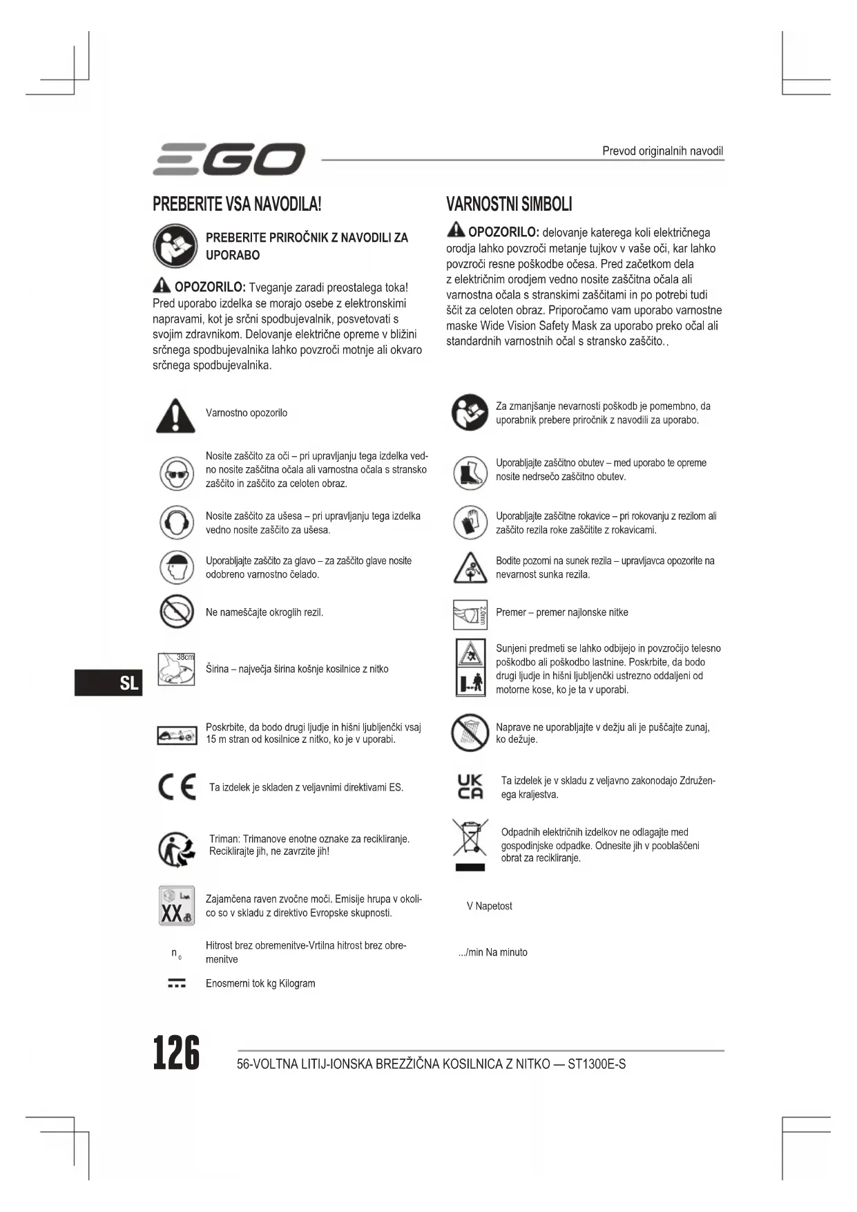 Varnostno opozoriloZa zmanjšanje nevarnosti poškodb je pomembno, da uporabnik prebere priročnik z navodili za uporabo.Nosite zaščito za oči – pri upravljanju tega izdelka ved-no nosite zaščitna očala ali varnostna očala s stransko zaščito in zaščito za celoten obraz.Uporabljajte zaščitno obutev – med uporabo te opreme nosite nedrsečo zaščitno obutev.Nosite zaščito za ušesa – pri upravljanju tega izdelka vedno nosite zaščito za ušesa.Uporabljajte zaščitne rokavice – pri rokovanju z rezilom ali zaščito rezila roke zaščitite z rokavicami.Uporabljajte zaščito za glavo – za zaščito glave nosite odobreno varnostno čelado.Bodite pozorni na sunek rezila – upravljavca opozorite na nevarnost sunka rezila.Ne nameščajte okroglih rezil. 2.0mmPremer – premer najlonske nitke 38cm Širina – največja širina košnje kosilnice z nitkoSunjeni predmeti se lahko odbijejo in povzročijo telesno poškodbo ali poškodbo lastnine. Poskrbite, da bodo drugi ljudje in hišni ljubljenčki ustrezno oddaljeni od motorne kose, ko je ta v uporabi. 15m Poskrbite, da bodo drugi ljudje in hišni ljubljenčki vsaj 15 m stran od kosilnice z nitko, ko je v uporabi.Naprave ne uporabljajte v dežju ali je puščajte zunaj, ko dežuje.Ta izdelek je skladen z veljavnimi direktivami ES.Ta izdelek je v skladu z veljavno zakonodajo Združen-ega kraljestva.Triman: Trimanove enotne oznake za recikliranje. Reciklirajte jih, ne zavrzite jih!Odpadnih električnih izdelkov ne odlagajte med gospodinjske odpadke. Odnesite jih v pooblaščeni obrat za recikliranje.