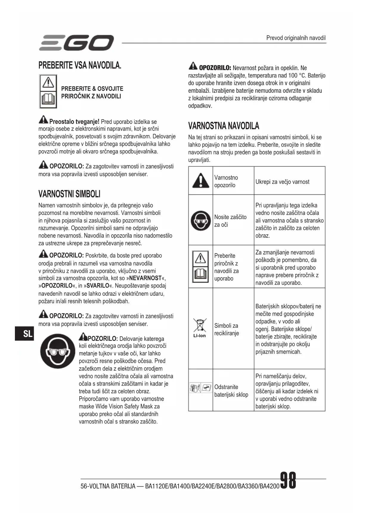 Temperatura okolice za polnjenje baterijskega sklopa Za najboljše rezultate baterijo polnite na mestu, kjer je temperatura višja od 5 °C in nižja od 40 °C. V Volt Napetost A Amperi Tok Hz Hertz Frekvenca (v ciklih na sekundo) W Watt Napajanje min Minute Čas Izmenični tok Vrsta toka Enosmerni tok Vrsta ali značilnost toka OPOZORILO: Preberite in osvojite vsebino navodil. Neupoštevanje vseh navodil se lahko odrazi v električnem udaru, požaru in/ali resnih telesnih poškodbah. Izraz »električno orodje« in vsa navedena opozorila se nanašajo na električne vrtne stroje EGO in stroje, ki jih napaja baterija (brezžični stroji).