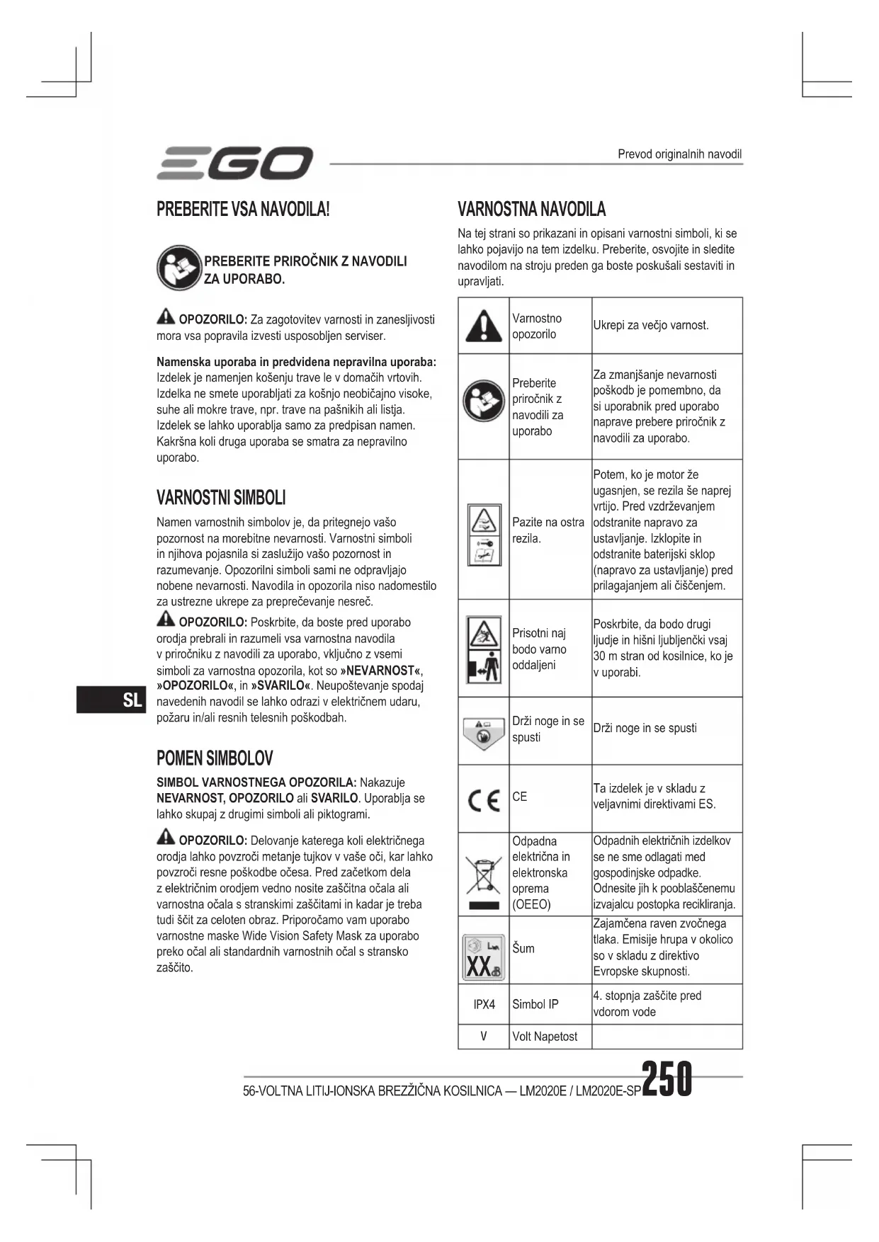 ZA UPORABO. OPOZORILO: Za zagotovitev varnosti in zanesljivosti mora vsa popravila izvesti usposobljen serviser.Namenska uporaba in predvidena nepravilna uporaba: Izdelek je namenjen košenju trave le v domačih vrtovih. Izdelka ne smete uporabljati za košnjo neobičajno visoke, suhe ali mokre trave, npr. trave na pašnikih ali listja. Izdelek se lahko uporablja samo za predpisan namen. Kakršna koli druga uporaba se smatra za nepravilno uporabo. VARNOSTNI SIMBOLI Namen varnostnih simbolov je, da pritegnejo vašo pozornost na morebitne nevarnosti. Varnostni simboli in njihova pojasnila si zaslužijo vašo pozornost in razumevanje. Opozorilni simboli sami ne odpravljajo nobene nevarnosti. Navodila in opozorila niso nadomestilo za ustrezne ukrepe za preprečevanje nesreč. OPOZORILO: Poskrbite, da boste pred uporabo orodja prebrali in razumeli vsa varnostna navodila v priročniku z navodili za uporabo, vključno z vsemi simboli za varnostna opozorila, kot so »NEVARNOST«, »OPOZORILO«, in »SVARILO«. Neupoštevanje spodaj navedenih navodil se lahko odrazi v električnem udaru, požaru in/ali resnih telesnih poškodbah. POMEN SIMBOLOV SIMBOL VARNOSTNEGA OPOZORILA: Nakazuje NEVARNOST, OPOZORILO ali SVARILO. Uporablja se lahko skupaj z drugimi simboli ali piktogrami. OPOZORILO: Delovanje katerega koli električnega orodja lahko povzroči metanje tujkov v vaše oči, kar lahko povzroči resne poškodbe očesa. Pred začetkom dela z električnim orodjem vedno nosite zaščitna očala ali varnostna očala s stranskimi zaščitami in kadar je treba tudi ščit za celoten obraz. Priporočamo vam uporabo varnostne maske Wide Vision Safety Mask za uporabo preko očal ali standardnih varnostnih očal s stransko zaščito. VARNOSTNA NAVODILA Na tej strani so prikazani in opisani varnostni simboli, ki se lahko pojavijo na tem izdelku. Preberite, osvojite in sledite navodilom na stroju preden ga boste poskušali sestaviti in upravljati.Varnostno opozoriloUkrepi za večjo varnost.Preberite priročnik z navodili za uporaboZa zmanjšanje nevarnosti poškodb je pomembno, da si uporabnik pred uporabo naprave prebere priročnik z navodili za uporabo.Pazite na ostra rezila.Potem, ko je motor že ugasnjen, se rezila še naprej vrtijo. Pred vzdrževanjem odstranite napravo za ustavljanje. Izklopite in odstranite baterijski sklop (napravo za ustavljanje) pred prilagajanjem ali čiščenjem.Prisotni naj bodo varno oddaljeniPoskrbite, da bodo drugi ljudje in hišni ljubljenčki vsaj 30 m stran od kosilnice, ko je v uporabi. Drži noge in se spustiDrži noge in se spusti Ta izdelek je v skladu z veljavnimi direktivami ES.Odpadna električna in elektronska oprema (OEEO)Odpadnih električnih izdelkov se ne sme odlagati med gospodinjske odpadke. Odnesite jih k pooblaščenemu izvajalcu postopka recikliranja.