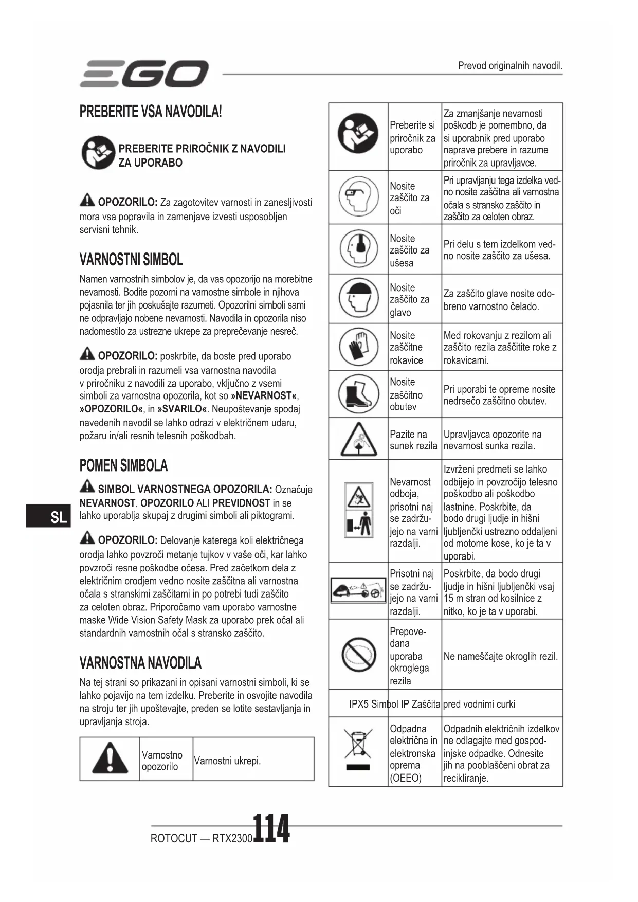 ZA UPORABO OPOZORILO: Za zagotovitev varnosti in zanesljivosti mora vsa popravila in zamenjave izvesti usposobljen servisni tehnik. VARNOSTNI SIMBOL Namen varnostnih simbolov je, da vas opozorijo na morebitne nevarnosti. Bodite pozorni na varnostne simbole in njihova pojasnila ter jih poskušajte razumeti. Opozorilni simboli sami ne odpravljajo nobene nevarnosti. Navodila in opozorila niso nadomestilo za ustrezne ukrepe za preprečevanje nesreč. OPOZORILO: poskrbite, da boste pred uporabo orodja prebrali in razumeli vsa varnostna navodila v priročniku z navodili za uporabo, vključno z vsemi simboli za varnostna opozorila, kot so »NEVARNOST«, »OPOZORILO«, in »SVARILO«. Neupoštevanje spodaj navedenih navodil se lahko odrazi v električnem udaru, požaru in/ali resnih telesnih poškodbah. POMEN SIMBOLA SIMBOL VARNOSTNEGA OPOZORILA: Označuje NEVARNOST, OPOZORILO ALI PREVIDNOST in se lahko uporablja skupaj z drugimi simboli ali piktogrami. OPOZORILO: Delovanje katerega koli električnega orodja lahko povzroči metanje tujkov v vaše oči, kar lahko povzroči resne poškodbe očesa. Pred začetkom dela z električnim orodjem vedno nosite zaščitna ali varnostna očala s stranskimi zaščitami in po potrebi tudi zaščito za celoten obraz. Priporočamo vam uporabo varnostne maske Wide Vision Safety Mask za uporabo prek očal ali standardnih varnostnih očal s stransko zaščito. VARNOSTNA NAVODILA Na tej strani so prikazani in opisani varnostni simboli, ki se lahko pojavijo na tem izdelku. Preberite in osvojite navodila na stroju ter jih upoštevajte, preden se lotite sestavljanja in upravljanja stroja. Varnostno opozorilo Varnostni ukrepi. Preberite si priročnik za uporabo Za zmanjšanje nevarnosti poškodb je pomembno, da si uporabnik pred uporabo naprave prebere in razume priročnik za upravljavce. Nosite zaščito za oči Pri upravljanju tega izdelka ved- no nosite zaščitna ali varnostna očala s stransko zaščito in zaščito za celoten obraz. Nosite zaščito za ušesa Pri delu s tem izdelkom ved- no nosite zaščito za ušesa. Nosite zaščito za glavo Za zaščito glave nosite odo- breno varnostno čelado. Nosite zaščitne rokavice Med rokovanju z rezilom ali zaščito rezila zaščitite roke z rokavicami. Nosite zaščitno obutev Pri uporabi te opreme nosite nedrsečo zaščitno obutev. Pazite na sunek rezila Upravljavca opozorite na nevarnost sunka rezila. Nevarnost odboja, prisotni naj se zadržu- jejo na varni razdalji. Izvrženi predmeti se lahko odbijejo in povzročijo telesno poškodbo ali poškodbo lastnine. Poskrbite, da bodo drugi ljudje in hišni ljubljenčki ustrezno oddaljeni od motorne kose, ko je ta v uporabi. 15m Prisotni naj se zadržu- jejo na varni razdalji. Poskrbite, da bodo drugi ljudje in hišni ljubljenčki vsaj 15 m stran od kosilnice z nitko, ko je ta v uporabi. Prepove- dana uporaba okroglega rezila Ne nameščajte okroglih rezil. IPX5 Simbol IP Zaščita pred vodnimi curki Odpadna električna in elektronska oprema (OEEO) Odpadnih električnih izdelkov ne odlagajte med gospod- injske odpadke. Odnesite jih na pooblaščeni obrat za recikliranje. Prevod originalnih navodil.ROTOCUT — RTX2300