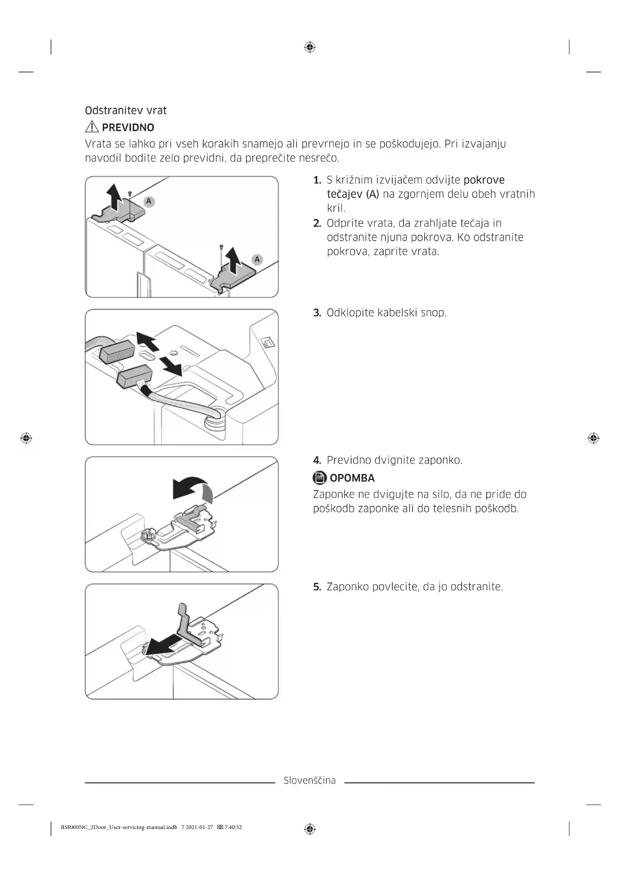 - Če tečaj odstranite, ne da bi medtem držali vrata, lahko ta padejo in povzročijo telesne poškodbe.