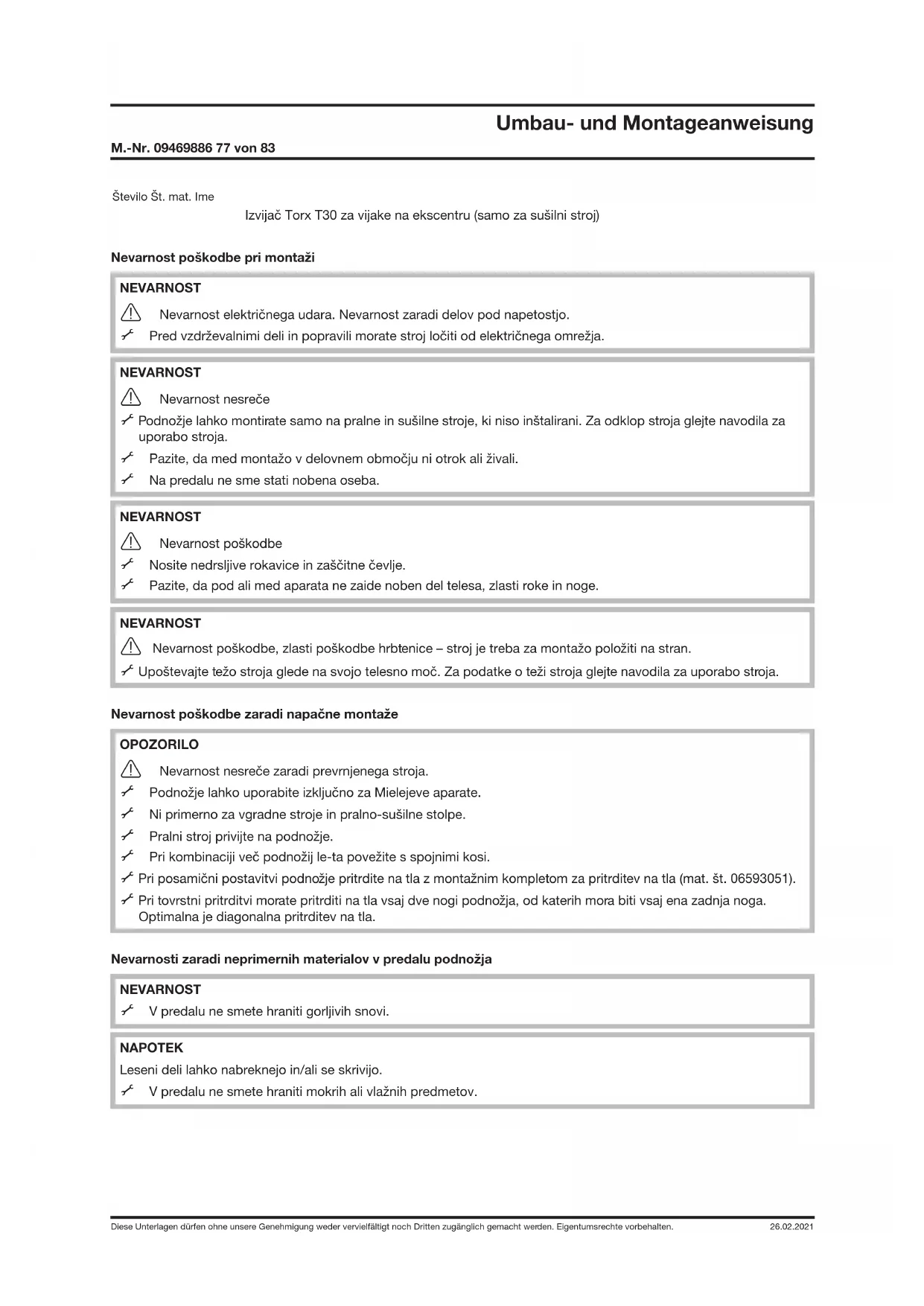 Podnožje s predalom za pralne in sušilne stroje WTS510/APCL041 Potrebni deli Število Št. mat. Ime 1 09322300 Montažni komplet WTS510 1 11477320 Montažni komplet APCL041 Vključeni deli Število Št. mat. Ime 1 Navodila za montažo 1 Podnožje WTS510/APCL041 1 Hrbtna stena podnožja 2 Spojni kos 4 Distančni obroč 3 Vijak z lečasto glavo CEM 4x10 4 Navojni zatič M10x40mm 10 Lepilni trak za hrbtno steno 1 06593051 Montažni komplet za pritrditev na tla Specialno orodje Število Št. mat. Ime Vodna tehtnica Viličasti ključ 18mm ali cevne klešče za navojne sornike (štirikotni) in noge sušilnega stroja Izvijač Torx T20 za hrbtno steno Notranji šestrobi ključ 5mm (samo za sušilni stroj)Umbau- und Montageanweisung M.-Nr. 09469886 77 von 83 Diese Unterlagen dürfen ohne unsere Genehmigung weder vervielfältigt noch Dritten zugänglich gemacht werden. Eigentumsrechte vorbehalten. 26.02.2021 Število Št. mat. Ime Izvijač Torx T30 za vijake na ekscentru (samo za sušilni stroj) Nevarnost poškodbe pri montaži NEVARNOST Nevarnost električnega udara. Nevarnost zaradi delov pod napetostjo. A Pred vzdrževalnimi deli in popravili morate stroj ločiti od električnega omrežja. NEVARNOST Nevarnost nesreče A Podnožje lahko montirate samo na pralne in sušilne stroje, ki niso inštalirani. Za odklop stroja glejte navodila za uporabo stroja. A Pazite, da med montažo v delovnem območju ni otrok ali živali. A Na predalu ne sme stati nobena oseba. NEVARNOST Nevarnost poškodbe A Nosite nedrsljive rokavice in zaščitne čevlje. A Pazite, da pod ali med aparata ne zaide noben del telesa, zlasti roke in noge. NEVARNOST Nevarnost poškodbe, zlasti poškodbe hrbtenice – stroj je treba za montažo položiti na stran. A Upoštevajte težo stroja glede na svojo telesno moč. Za podatke o teži stroja glejte navodila za uporabo stroja. Nevarnost poškodbe zaradi napačne montaže OPOZORILO Nevarnost nesreče zaradi prevrnjenega stroja. A Podnožje lahko uporabite izključno za Mielejeve aparate. A Ni primerno za vgradne stroje in pralno-sušilne stolpe. A Pralni stroj privijte na podnožje. A Pri kombinaciji več podnožij le-ta povežite s spojnimi kosi. A Pri posamični postavitvi podnožje pritrdite na tla z montažnim kompletom za pritrditev na tla (mat. št. 06593051). A Pri tovrstni pritrditvi morate pritrditi na tla vsaj dve nogi podnožja, od katerih mora biti vsaj ena zadnja noga. Optimalna je diagonalna pritrditev na tla. Nevarnosti zaradi neprimernih materialov v predalu podnožja NEVARNOST A V predalu ne smete hraniti gorljivih snovi. NAPOTEK Leseni deli lahko nabreknejo in/ali se skrivijo. A V predalu ne smete hraniti mokrih ali vlažnih predmetov.Umbau- und Montageanweisung M.-Nr. 09469886 78 von 83 Diese Unterlagen dürfen ohne unsere Genehmigung weder vervielfältigt noch Dritten zugänglich gemacht werden. Eigentumsrechte vorbehalten. 26.02.2021 Montaža podnožja Odstranjevanje predala iz podnožja A Predal izvlecite do konca iz ohišja, glejte sliko 2. A Pritisnite zaskočni zapirali in hkrati povlecite predal navzgor iz podnožja, glejte sliko 3. Montaža podnožja pod sušilni stroj A Izpraznite posodo za kondenzat. A Noge sušilnega stroja s cevnimi kleščami povsem privijte. A Z notranjim šestrobim ključem 5mm odvijte navojne zatiče iz podnožja (A) in jih odstranite, glejte sliko 4. A Privijte priložene navojne zatiče 10x40mm do konca v navojne sornike (B), glejte sliko 4. OPOZORILO Nevarnost poškodbe prstov, če zaidejo med ohišje sušilnega stroja in navojne zatiče. A Sušilnega stroja ne dvignite tako, da ga držite za vogale. A Sušilni stroj dvignite na podnožje, tako da navojne zatiče vstavite v odprtine nog sušilnega stroja, glejte sliko 5. A Na notranjo stran hrbtne stene prilepite tesnilne trakove, kot je prikazano na sliki, glejte sliko 6. A Na hrbtni steni sušilnega stroja odvijte vijaka na ekscentrih (1), glejte sliko 7 Ekscentra se lahko ob sprostitvi vijakov rahlo premakneta. Da bo namestitev varna, morate ekscentra vrniti v izhodiščni položaj: zob spodaj levo pod kotom 20° (1), glejte sliko 7. A Z enim vijakom z lečasto glavo CEM 4x10 pritrdite hrbtno steno spodaj na podnožje (2), glejte sliko 7. A Spojna kosa (3) obesite na vijaka na ekscentrih, glejte sliko 7. A Z dvema vijakoma z lečasto glavo CEM 4x10 pritrdite spojna kosa in hrbtno steno zgoraj na podnožje (2), glejte sliko 8. A Privijte vijaka na ekscentrih (2), glejte sliko 8. A Položaj stroja in podnožja uravnajte z vodno tehtnico. A Fiksirajte noge podnožja. A Podnožje pritrdite na tla z montažnim kompletom za pritrditev na tla (mat. št. 06593051). Montaža podnožja pod pralni stroj Pred samo montažo pritrdite spojne kose na podnožje. Potrebovali jih boste za varno povezavo dveh podnožij. Spojne kose pritrdite tudi v primeru, da še nimate drugega podnožja. Tako se boste izognili morebitni zahtevni naknadni namestitvi, spojni kosi pa bodo varno shranjeni. Postavitev sušilnega stroja levo in pralnega stroja desno: glejte sliko 9. Postavitev pralnega stroja levo in sušilnega stroja desno: glejte sliko 10. A S cevnimi kleščami zadržite navojne sornike v podnožju in odvijte vse noge podnožja. A Glede na situacijo postavitve odvijte 2 nogi podnožja levo ali desno, glejte sliko 9 ali sliko 10. A Na dno podnožja položite podložke, glejte sliko 9 ali sliko 10. A Na podložko položite spojni kos (1), glejte sliko 9 ali sliko 10. A Ponovno privijte 2 nogi podnožja, vendar ju še ne fiksirajte s protimatico.Umbau- und Montageanweisung M.-Nr. 09469886 79 von 83 Diese Unterlagen dürfen ohne unsere Genehmigung weder vervielfältigt noch Dritten zugänglich gemacht werden. Eigentumsrechte vorbehalten. 26.02.2021 NAPOTEK Škoda na pralnem stroju in na talni oblogi. A Izpustite vodo iz pralnega stroja. A Odstranite dozirno enoto. A Pralni stroj lahko položite na stran izključno z vgrajenim transportnim varovalom. A Pralni stroj položite na ravno, mehko podlag