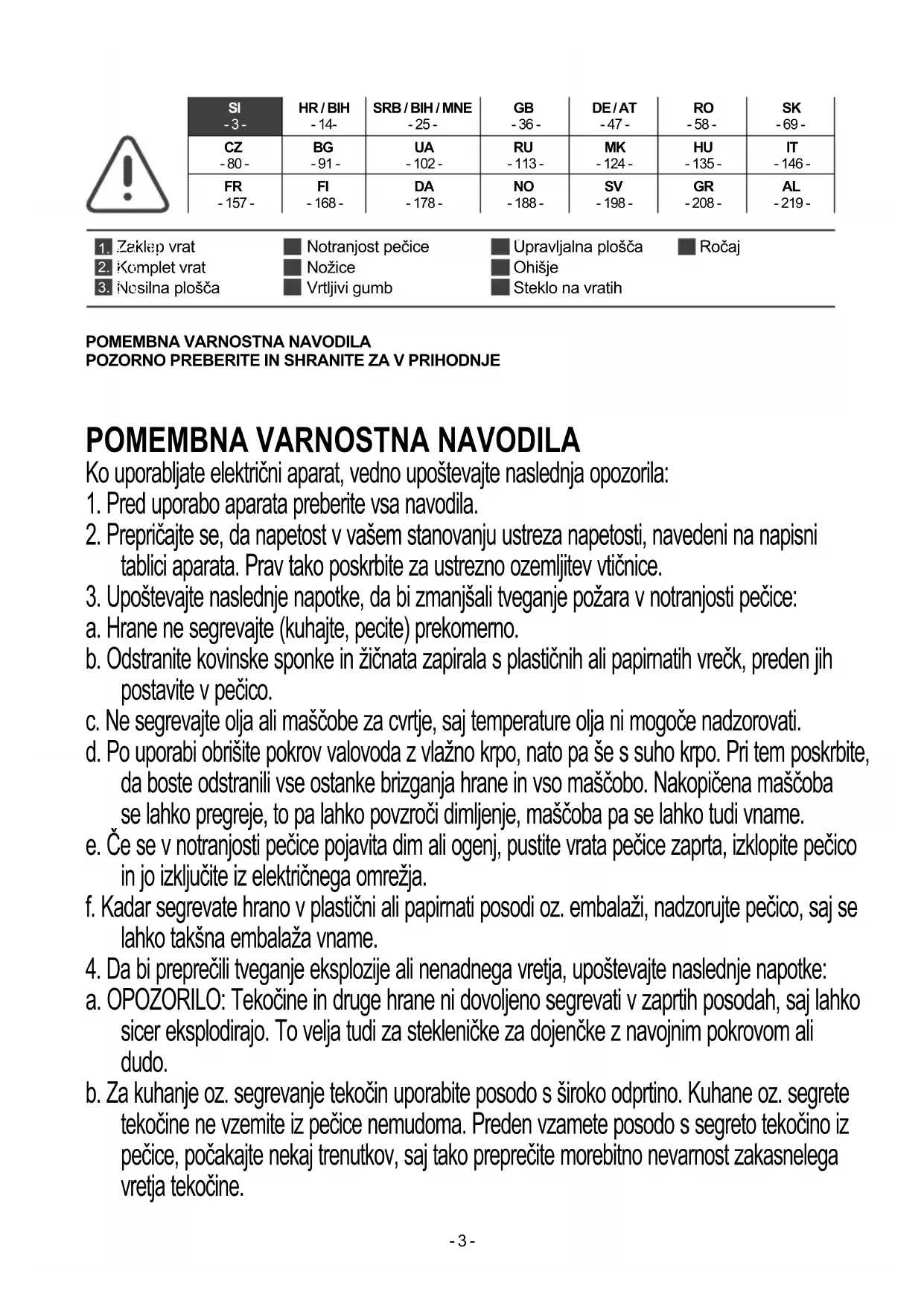 a. OPOZORILO: Tekočine in druge hrane ni dovoljeno segrevati v zaprtih posodah, saj lahko sicer eksplodirajo. To velja tudi za stekleničke za dojenčke z navojnim pokrovom ali dudo. b. Za kuhanje oz. segrevanje tekočin uporabite posodo s široko odprtino. Kuhane oz. segrete tekočine ne vzemite iz pečice nemudoma. Preden vzamete posodo s segreto tekočino iz pečice, počakajte nekaj trenutkov, saj tako preprečite morebitno nevarnost zakasnelega vretja tekočine.