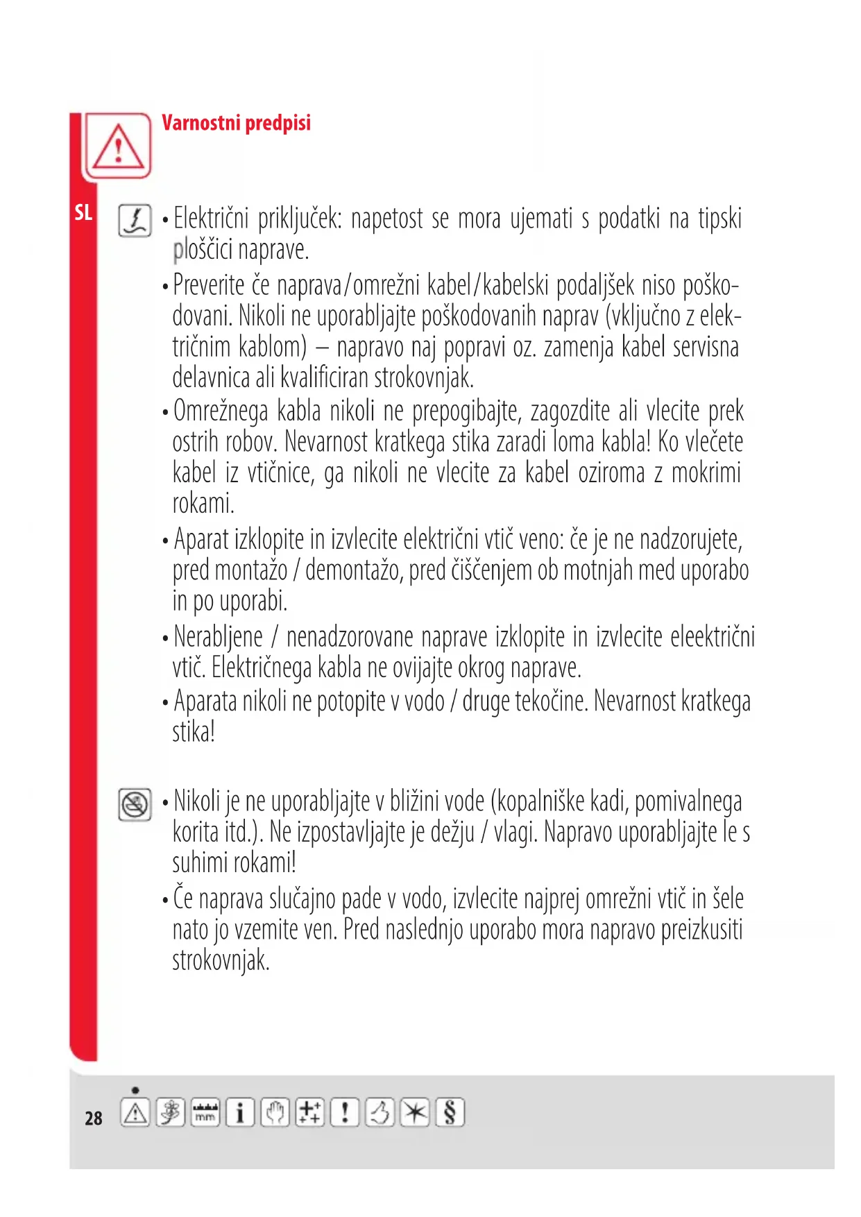 - Nikoli je ne uporabljajte v bližini vode (kopalniške kadi, pomivalnega korita itd.). Ne izpostavljajte je dežju / vlagi. Napravo uporabljajte le s suhimi rokami!29 Varnostni predpisi