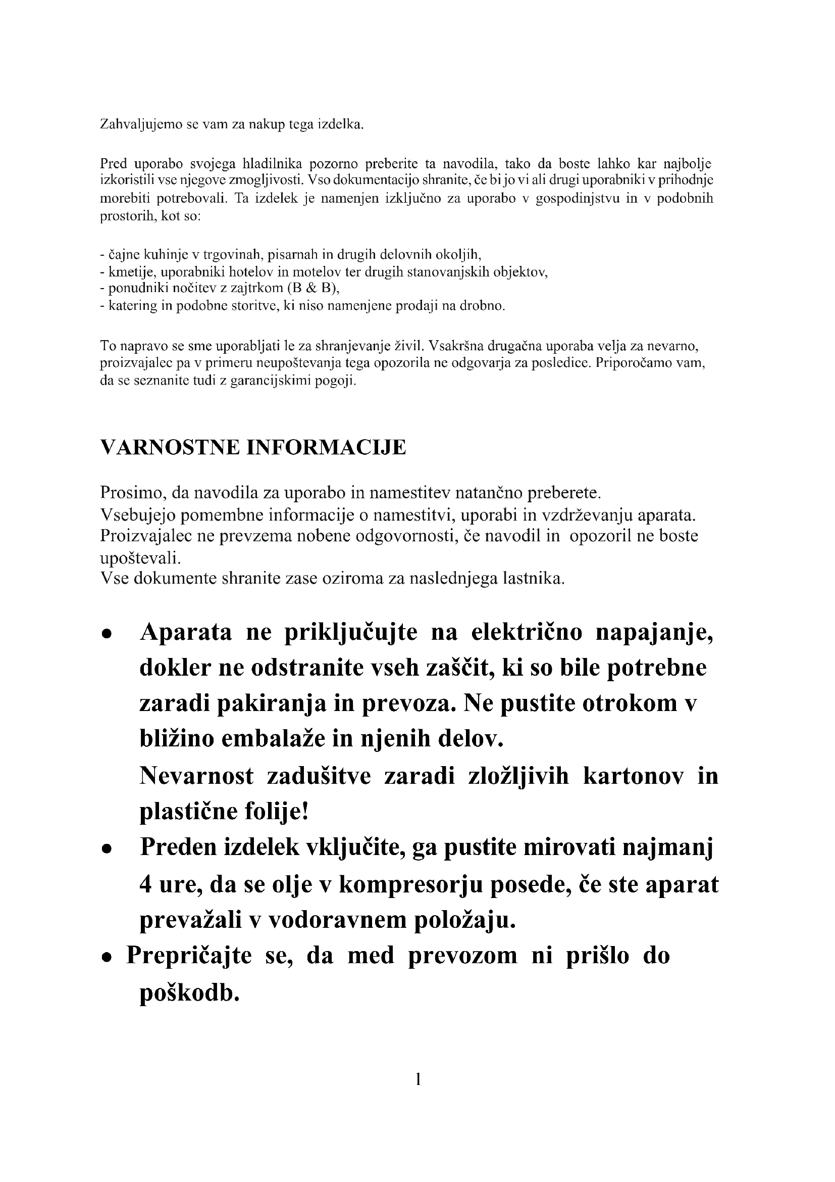 Zahvaljujemo se vam za nakup tega izdelka. Pred uporabo svojega hladilnika pozorno preberite ta navodila, tako da boste lahko kar najbolje izkoristili vse njegove zmogljivosti. Vso dokumentacijo shranite, če bi jo vi ali drugi uporabniki v prihodnje morebiti potrebovali. Ta izdelek je namenjen izključno za uporabo v gospodinjstvu in v podobnih prostorih, kot so: - čajne kuhinje v trgovinah, pisarnah in drugih delovnih okoljih, - kmetije, uporabniki hotelov in motelov ter drugih stanovanjskih objektov, - ponudniki nočitev z zajtrkom (B & B), - katering in podobne storitve, ki niso namenjene prodaji na drobno. To napravo se sme uporabljati le za shranjevanje živil. Vsakršna drugačna uporaba velja za nevarno, proizvajalec pa v primeru neupoštevanja tega opozorila ne odgovarja za posledice. Priporočamo vam, da se seznanite tudi z garancijskimi pogoji. VARNOSTNE INFORMACIJE Prosimo, da navodila za uporabo in namestitev natančno preberete. Vsebujejo pomembne informacije o namestitvi, uporabi in vzdrževanju aparata. Proizvajalec ne prevzema nobene odgovornosti, če navodil in opozoril ne boste upoštevali. Vse dokumente shranite zase oziroma za naslednjega lastnika. ● Aparata ne priključujte na električno napajanje, dokler ne odstranite vseh zaščit, ki so bile potrebne zaradi pakiranja in prevoza. Ne pustite otrokom v bližino embalaže in njenih delov. Nevarnost zadušitve zaradi zložljivih kartonov in plastične folije! ● Preden izdelek vključite, ga pustite mirovati najmanj 4 ure, da se olje v kompresorju posede, če ste aparat prevažali v vodoravnem položaju. ● Prepričajte se, da med prevozom ni prišlo do poškodb.
