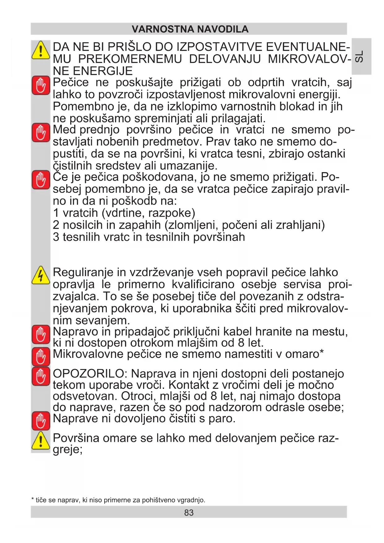 - tiče se naprav, ki niso primerne za pohištveno vgradnjo.84 NAVODILA NANAŠAJOČA SE NA VARNOST UPORABE NATANČNO PREBERITE IN SHRANITE . Da bi med delovanjem zmanjšali nevarnost požara, poškodbe uporabnikov ali izpostavitve prekomernemu delovanju mikrovalovne energije, se je potrebno držati spodnjih osnovnih varnostnih navodil.