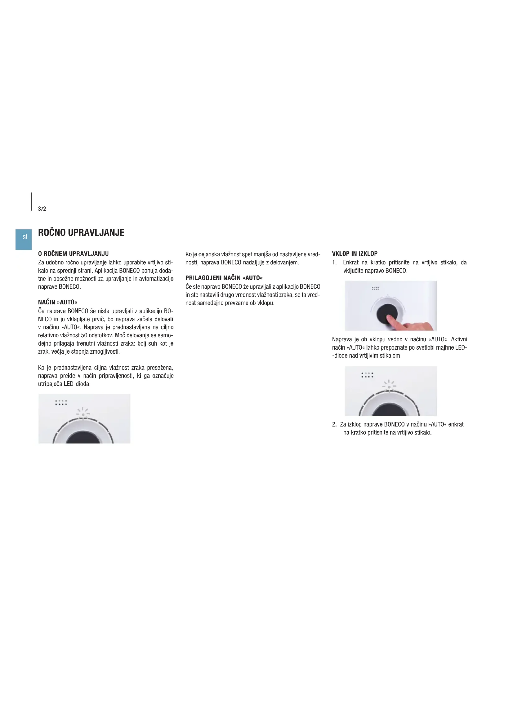 vključite napravo BONECO. Naprava je ob vklopu vedno v načinu »AUTO«. Aktivni način »AUTO« lahko prepoznate po svetlobi majhne LED- -diode nad vrtljivim stikalom.
