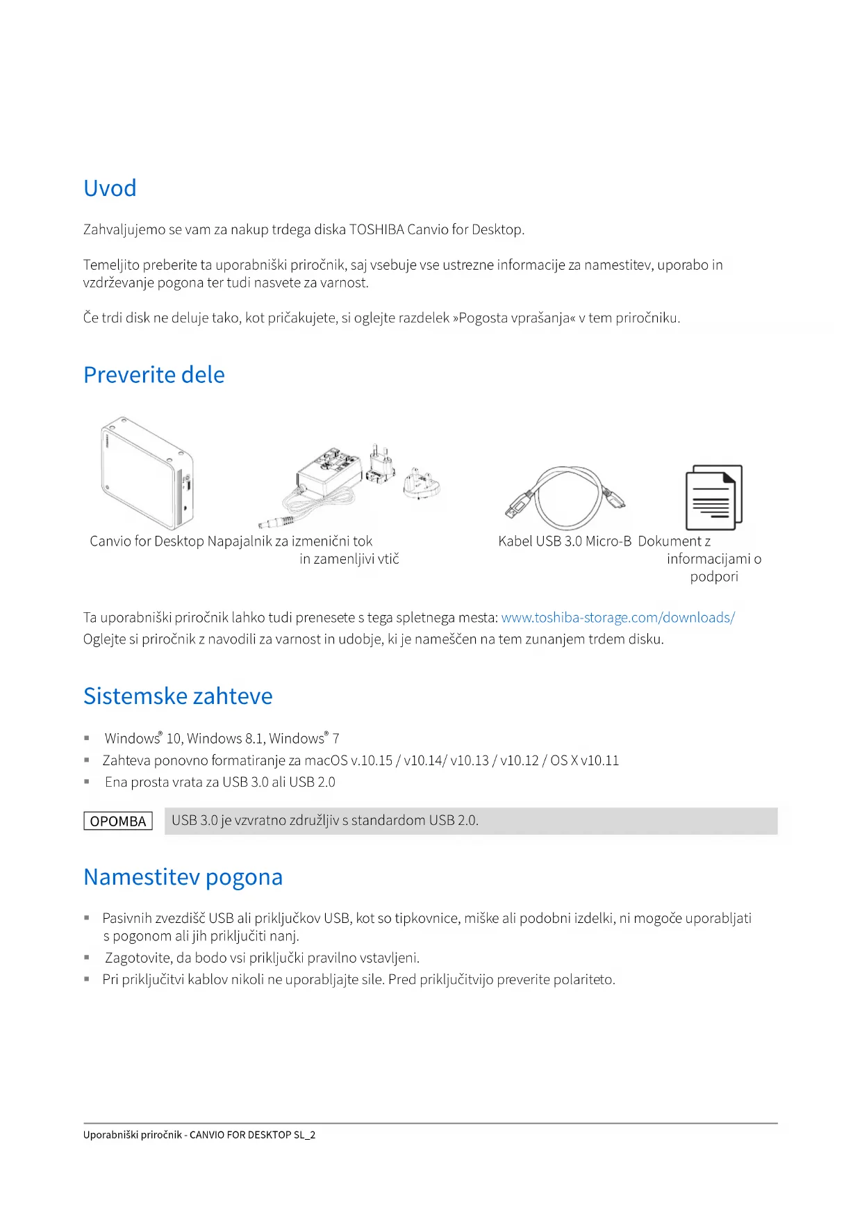 Ko poskušam formatirati pogon, se prikaže sporočilo »Formatiranja ni mogoče dokončati«. O: Do tega lahko pride, če pogon formatirate z datotečnim sistemom FAT. Poskusite izbrati datotečni sistem »NTFS«. S tem bi morali odpraviti težavo. Podpora družbe TOSHIBA Potrebujete pomoč? Obiščite spletno stran s podporo za trde diske in naprave za shranjevanje TOSHIBA: www.toshiba-storage.com/support Za garancijske zahtevke obiščite spletno mesto: www.toshiba-storage.com/warranty-claims Ko formatirate pogon, izbrišete vse podatke na pogonu. OPOMBAUporabniški priročnik - CANVIO FOR DESKTOP SL_7 Izjave o skladnosti s predpisi Skladnost z oznako CE Delovno okolje Elektromagnetna združljivost te naprave je bila preverjena skladno z napravo, značilno za to vrsto izdelkov, za tako imenovana bivalna in komercialna okolja ter okolja lahke industrije. Toshiba ni naprave preverila v nobenem drugem okolju in uporaba te naprave v teh delovnih okoljih je lahko omejena ali pa se odsvetuje. Možne posledice uporabe te naprave v okoljih, za katera ni bila preverjena: motnje drugih izdelkov ali tega izdelka v okoljih, blizu območja uporabe, in posledično začasno nedelovanje ali izguba/poškodba podatkov. Primeri okolij, za katera naprava ni bila preverjena, in sorodni nasveti: Industrijska okolja (npr. okolja, kjer se uporablja predvsem 3-fazna 380-voltna napetost): nevarnost motenj tega izdelka zaradi možnih močnih elektromagnetnih polj, zlasti v bližini velikih strojev ali agregatov. Medicinska okolja: Toshiba ni preverila skladnosti z direktivo o medicinskih izdelkih, zato tega izdelka brez dodatnega preverjanja ni mogoče uporabljati kot medicinskega izdelka. Uporaba v običajnih pisarniških okoljih, npr. v bolnišnicah, naj ne bi bila sporna, če tega ne omejuje pristojna uprava. Avtomobilsko okolje: preberite navodila zadevnega avtomobila, v katerih so lahko nasveti glede uporabe tega izdelka (zvrsti izdelkov). Letalsko okolje: upoštevajte navodila letalskega osebja glede omejitev uporabe. Druga okolja, ki niso povezana z direktivo EMC Zunanja uporaba: ta izdelek je namenjen uporabi v domačem ali pisarniškem okolju, zato nima nobene posebne zaščite pred vlago ali močnimi udarci. Eksplozivna okolja: tega izdelka ne smete uporabljati v takih posebnih delovnih okoljih (Ex). Spodnje informacije veljajo samo za države članice EU: REACH – izjava o skladnosti Izdelki družbe Toshiba so skladni z vsemi zahtevami uredbe REACH, družba pa svojim strankam zagotavlja informacije o kemičnih snoveh v njenih izdelkih v skladu z uredbo REACH. Odstranjevanje izdelkov Naslednji podatki veljajo samo za Turčijo: Skladno z Uredbo OEEO. Ta izdelek ima oznako CE v skladu z zahtevami veljavnih direktiv EU. Za oznako CE je odgovorna družba Toshiba Electronics Europe GmbH, Hansaallee 181, 40549 Düsseldorf, Nemčija. Uporaba znaka pomeni, da izdelka ni mogoče obravnavati kot gospodinjskega odpadka. Če zagotovite pravilno odlaganje tega izdelka, pomagate preprečiti morebitne negativne posledice za okolje in človekovo zdravje, ki bi lahko nastale zaradi nepravilnega ravnanja z odpadki tega izdelka. Če želite podrobnejše informacije o recikliranju tega izdelka, se obrnite na lokalne oblasti, službo za odlaganje gospodinjskih odpadkov ali na trgovino, kjer ste kupili izdelek.Obvestila ©2020 TOSHIBA Electronics Europe GmbH. Vse pravice pridržane. TOSHIBA si pridržuje pravico do tehničnih sprememb. TOSHIBA ne prevzema odgovornosti za škodo, nastalo neposredno ali posredno zaradi napak, pomanjkljivosti ali neskladnosti med tem izdelkom in dokumentacijo. Ime Toshiba in logotipi so registrirane blagovne znamke družbe Toshiba. macOS je blagovna znamka družbe Apple Inc. Druga imena podjetij, imena izdelkov in imena storitev so lahko blagovne znamke ustreznih podjetij. Specifikacije, konfiguracije, barve, komponente in storitve izdelka se lahko spremenijo brez predhodnega obvestila. En gigabajt (GB) pomeni eno milijardo bajtov in en terabajt (TB) pomeni en bilijon bajtov. Skupna razpoložljiva zmogljivost se razlikuje glede na operacijsko okolje, zmogljivost shranjevanja in vaši rezultati pa se bodo skladno s tem razlikovali. Računalniški operacijski sistem pa računa zmogljivost shranjevanja s potencami števila 2 za definicijo 1 TB = 2