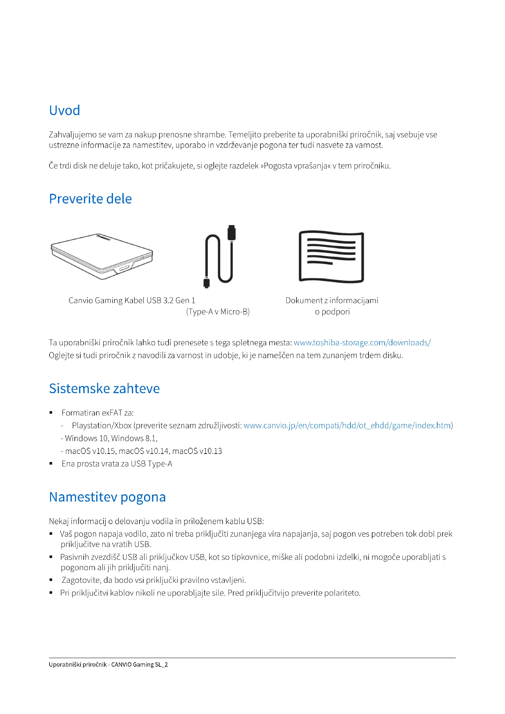 Ko poskušam formatirati pogon, se prikaže sporočilo »Formatiranja ni mogoče dokončati«. O: Do tega lahko pride, če pogon formatirate z datotečnim sistemom FAT. Poskusite izbrati datotečni sistem »NTFS«. S tem bi morali odpraviti težavo. Podpora družbe TOSHIBA Potrebujete pomoč? Obiščite spletno stran s podporo za trde diske in naprave za shranjevanje TOSHIBA: www.toshiba-storage.com/support Za garancijske zahtevke obiščite spletno mesto: www.toshiba-storage.com/warranty-claims Ko formatirate pogon, izbrišete vse podatke na pogonu. OPOMBAUporabniški priročnik - CANVIO Gaming SL_6 Izjave o skladnosti s predpisi Skladnost z oznako CE Delovno okolje Elektromagnetna združljivost te naprave je bila preverjena skladno z napravo, značilno za to vrsto izdelkov, za tako imenovana bivalna in komercialna okolja ter okolja lahke industrije. Toshiba ni naprave preverila v nobenem drugem okolju in uporaba te naprave v teh delovnih okoljih je lahko omejena ali pa se odsvetuje. Možne posledice uporabe te naprave v okoljih, za katera ni bila preverjena: motnje drugih izdelkov ali tega izdelka v okoljih blizu območja uporabe in posledično začasno nedelovanje ali izguba/poškodba podatkov. Primeri delovnih okolij, v katerih uporaba naprave ni bila preverjena, in sorodni nasveti: Industrijska okolja (npr. okolja, kjer se uporablja predvsem 3-fazna 380-voltna napetost): nevarnost motenj tega izdelka zaradi možnih močnih elektromagnetnih polj, zlasti v bližini velikih strojev ali agregatov. Medicinska okolja: Toshiba ni preverila skladnosti z direktivo o medicinskih izdelkih, zato tega izdelka brez dodatnega preverjanja ni mogoče uporabljati kot medicinskega izdelka. Uporaba v običajnih pisarniških okoljih, npr. v bolnišnicah, naj ne bi bila sporna, če tega ne omejuje pristojna uprava. Avtomobilsko okolje: preberite navodila zadevnega avtomobila, v katerih so lahko nasveti glede uporabe tega izdelka (zvrsti izdelkov). Letalsko okolje: upoštevajte navodila letalskega osebja glede omejitev uporabe. Druga okolja, ki niso povezana z direktivo EMC Zunanja uporaba: ta izdelek je namenjen uporabi v domačem ali pisarniškem okolju, zato nima nobene posebne zaščite pred vlago ali močnimi udarci. Eksplozivna okolja: tega izdelka ne smete uporabljati v takih posebnih delovnih okoljih (Ex). Spodnje informacije veljajo samo za države članice EU: REACH – izjava o skladnosti Izdelki družbe Toshiba bodo skladni z vsemi zahtevami uredbe REACH (Uredba o registraciji, evalvaciji, avtorizaciji in omejevanju kemikalij) družba pa svojim strankam zagotavlja informacije o kemičnih snoveh v njenih izdelkih v skladu z uredbo REACH. Odstranjevanje izdelkov Naslednji podatki veljajo samo za Turčijo: Skladno z Uredbo OEEO. Ta izdelek ima oznako CE v skladu z zahtevami veljavnih direktiv EU. Za oznako CE je odgovorna družba Toshiba Electronics Europe GmbH, Hansaallee 181, 40549 Düsseldorf, Nemčija. Uporaba znaka pomeni, da izdelka ni mogoče obravnavati kot gospodinjskega odpadka. Če zagotovite pravilno odlaganje tega izdelka, pomagate preprečiti morebitne negativne posledice za okolje in človekovo zdravje, ki bi lahko nastale zaradi nepravilnega ravnanja z odpadki tega izdelka. Če želite podrobnejše informacije o recikliranju tega izdelka, se obrnite na lokalne oblasti, službo za odlaganje gospodinjskih odpadkov ali na trgovino, kjer ste kupili izdelek.Obvestila ©2020 TOSHIBA Electronics Europe GmbH. Vse pravice pridržane. TOSHIBA si pridržuje pravico do tehničnih sprememb. TOSHIBA ne prevzema odgovornosti za škodo, nastalo neposredno ali posredno zaradi napak, pomanjkljivosti ali neskladnosti med tem izdelkom in dokumentacijo. Ime Toshiba in logotipi so registrirane blagovne znamke družbe Toshiba. macOS je blagovna znamka družbe Apple Inc. Druga imena podjetij, imena izdelkov in imena storitev so lahko blagovne znamke ustreznih podjetij. Specifikacije, konfiguracije, barve, komponente in storitve izdelka se lahko spremenijo brez predhodnega obvestila. En gigabajt (GB) pomeni eno milijardo bajtov in en terabajt (TB) pomeni en bilijon bajtov. Skupna razpoložljiva zmogljivost se razlikuje glede na operacijsko okolje, zmogljivost shranjevanja in vaši rezultati pa se bodo skladno s tem razlikovali. Računalniški operacijski sistem pa računa zmogljivost shranjevanja s potencami števila 2 za definicijo 1 TB = 2