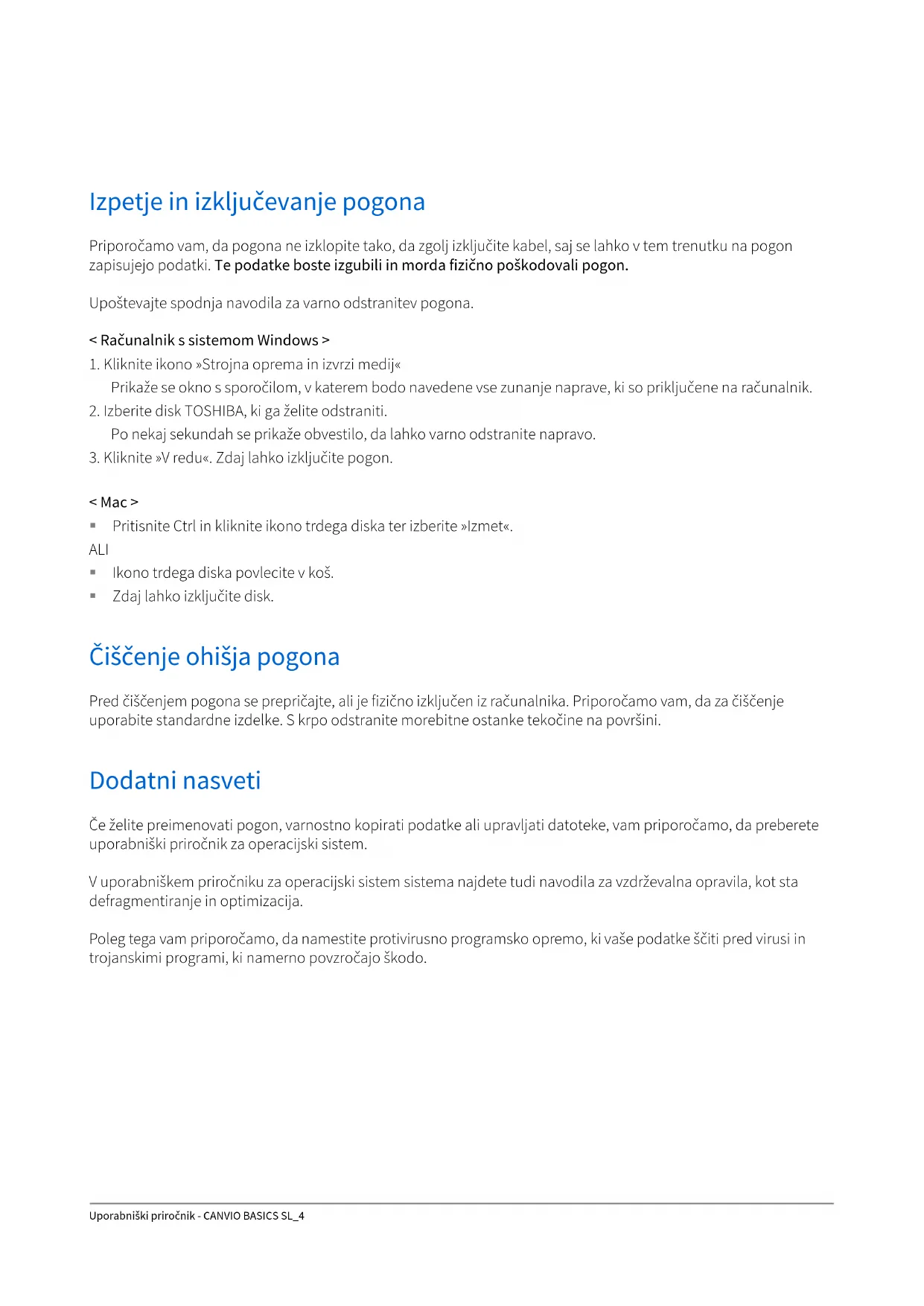 < Mac > Pritisnite Ctrl in kliknite ikono trdega diska ter izberite »Izmet«. ALI Ikono trdega diska povlecite v koš. Zdaj lahko izključite disk. Čiščenje ohišja pogona Pred čiščenjem pogona se prepričajte, ali je fizično izključen iz računalnika. Priporočamo vam, da za čiščenje uporabite standardne izdelke. S krpo odstranite morebitne ostanke tekočine na površini. Dodatni nasveti Če želite preimenovati pogon, varnostno kopirati podatke ali upravljati datoteke, vam priporočamo, da preberete uporabniški priročnik za operacijski sistem. V uporabniškem priročniku za operacijski sistem sistema najdete tudi navodila za vzdrževalna opravila, kot sta defragmentiranje in optimizacija. Poleg tega vam priporočamo, da namestite protivirusno programsko opremo, ki vaše podatke ščiti pred virusi in trojanskimi programi, ki namerno povzročajo škodo.Uporabniški priročnik - CANVIO BASICS SL_5 Pogosta vprašanja V: Ali potrebujem gonilnike USB za Windows? O: Ne, saj so že na voljo z operacijskim sistemom. V: Ali lahko zaženem sistem iz pogona? O: Ne, ker Windows ne podpira zagona s pogonov zunanjih trdih diskov. V: Zakaj pogon ne potrebuje ventilatorja? O: Pogoni so zasnovani tako, da je oddajanje toplote optimalno, zato ne potrebujejo ventilatorja. Rezultat tega je skoraj neslišno delovanje. V: Zakaj je zmogljivost mojega pogona (kot je prikazana v sistemu Windows) manjša kot navedena dejanska zmogljivost pogona? O: Do razlik pride zaradi različnih načinov računanja zmogljivosti. Proizvajalci trdih diskov računajo v desetiškem sistemu, medtem ko operacijski sistem računa v dvojiškem sistemu. Primer v desetiškem sistemu: 1 TB = 1000 GB 1 GB = 1000 MB = 1.000.000 KB = 1.000.000.000 bitov Primer v dvojiškem sistemu: 1 GB = 1024 MB = 1.048.576 KB = 1.073.741.824 bitov Za trdi disk z zmogljivostjo 1 TB (desetiški sistem) je v sistemu Windows zato prikazano, da je njegova zmogljivost 931 GB (dvojiški sistem). V: Ali lahko pogon uporabim za kopiranje operacijskega sistema iz enega računalnika v drugega? O: Ne. Upoštevati morate navodila dobavitelja operacijskega sistema za namestitev. Preprosto kopiranje ne deluje. Odpravljanje težav Moj računalnik sploh ne prepozna pogona. Preverite, ali so vse povezave varne. Če je pogon priključen prek zvezdišča USB, preverite, ali je zvezdišče priključeno na lastno napajanje. Če uporabljate razširitveno kartico, preverite, ali kartica deluje pravilno, in posodobite programsko opremo/ vdelano programsko opremo. Ali je nevarno, če je pogon med delovanjem na otip topel? O: To je običajen pojav in ni nevarno. Pogon javi napako: »Naprave ni mogoče zagnati.« O: Možna sta dva vzroka. Pogon ima težave z napajanjem, zato morate preveriti povezave, ali pa je pogon poškodovan in je potrebno popravilo.Uporabniški priročnik - CANVIO BASICS SL_6 Pogon ni prikazan v mapi »Moj računalnik«, vendar je prikazan v Upravitelju naprav. O: Upoštevajte ta navodila:
